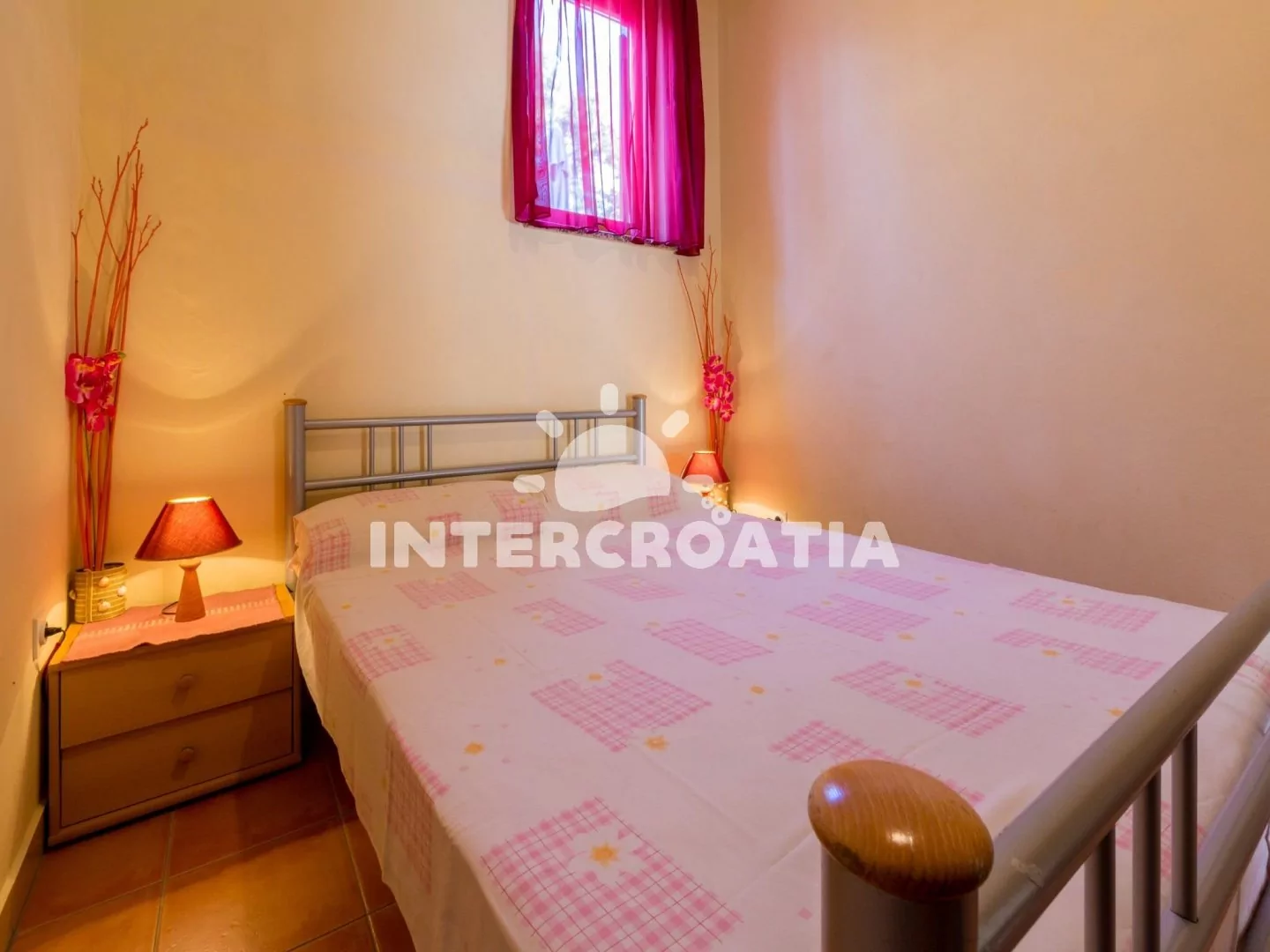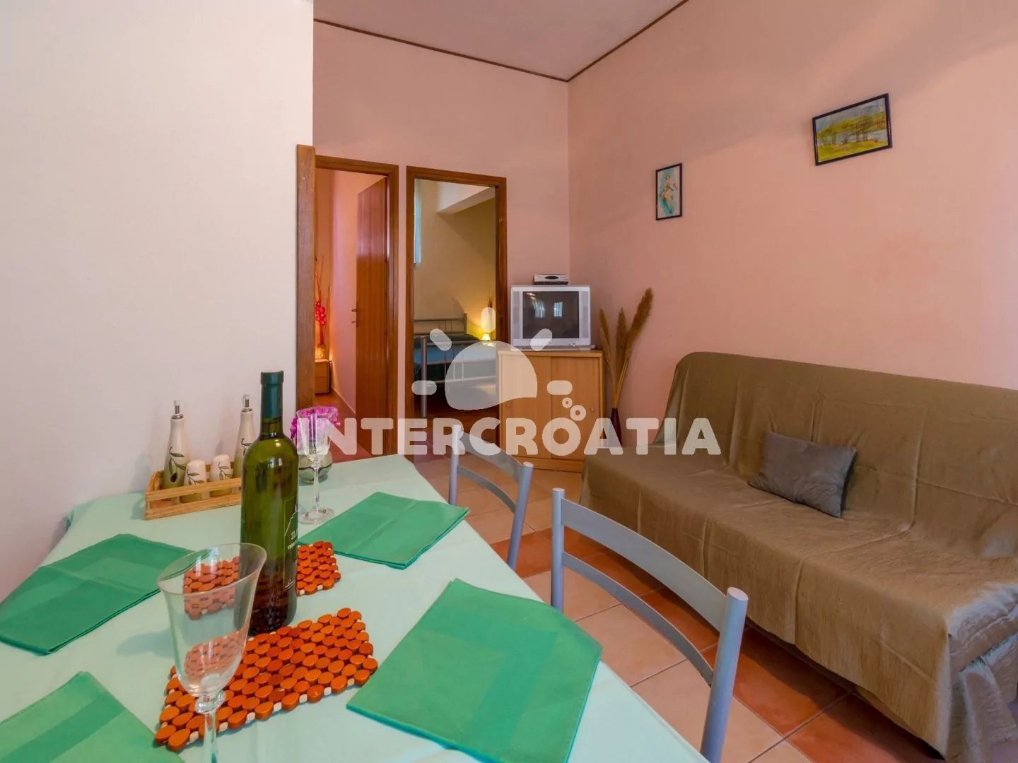 Apartmán (55 m2) v přízemí s vlastní terasou je vhodný pro 4 osoby. Obývací pokoj je spojený s kuchyní. Kuchyňská linka je vybavena varnou deskou, mikrovlnnou troubou, rychlovarnou konvicí, kávovarem, nádobím a lednicí s mrazákem. Obývací pokoj s jídelním stolem pro 4 osoby, pohovkou, televizí se satelitním programem a klimatizací. První i druhá ložnice je vybavena vždy s jedním dvoulůžkem. Koupelna se sprchovým koutem, umyvadlem a wc. Hostům je k dispozici parkování u objektu zdarma.