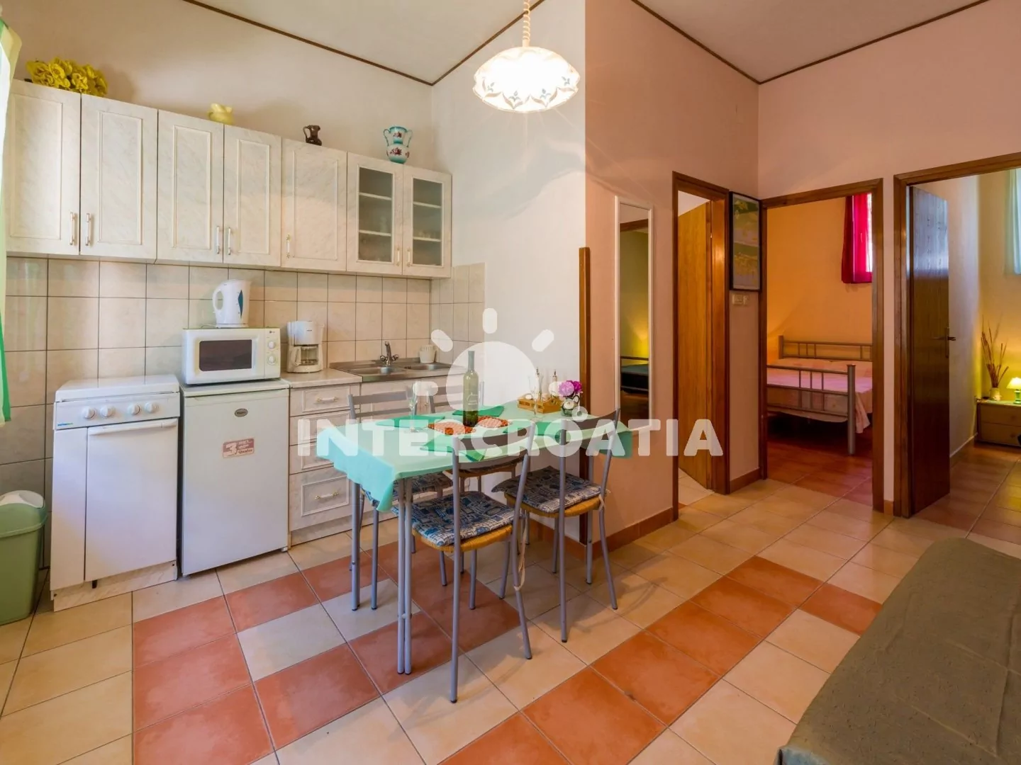 Apartmán (55 m2) v přízemí s vlastní terasou je vhodný pro 4 osoby. Obývací pokoj je spojený s kuchyní. Kuchyňská linka je vybavena varnou deskou, mikrovlnnou troubou, rychlovarnou konvicí, kávovarem…