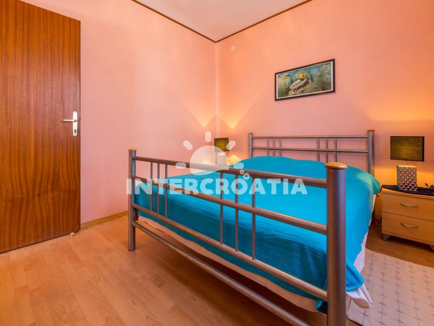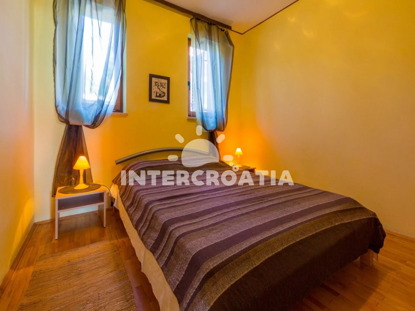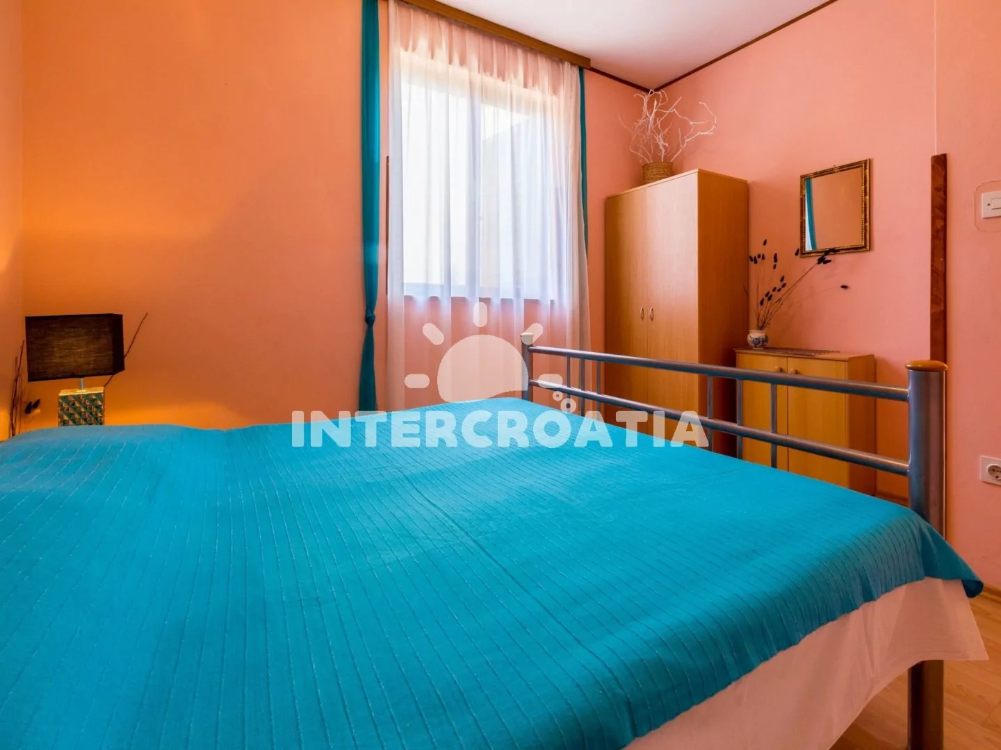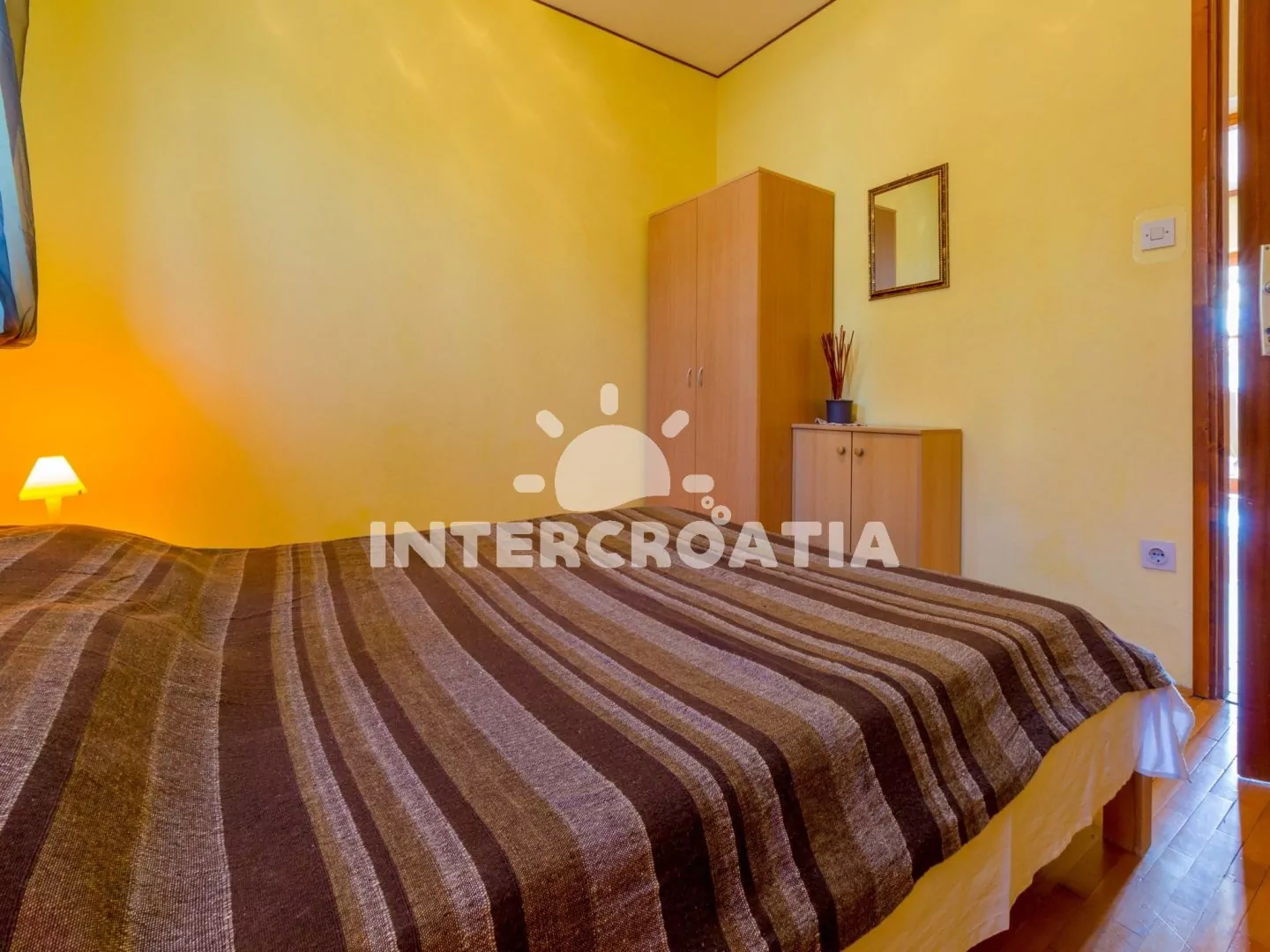 Apartmán (80 m2) v 1. patře s vlastní terasou a částečným výhledem na moře je vhodný pro až 8 osob. Apartmán disponuje 4 ložnicemi a obývacím pokojem s kuchyní. Kuchyňská linka je vybavena sporákem, mikrovlnnou troubou, rychlovarnou konvicí, kávovarem, nádobím a lednicí s mrazákem. Dále jídelní stůl pro 6 osob. Obývací pokoj s pohovkami, televizí se satelitním programem, klimatizací a vstupem na terasu. První ložnice s jedním dvoulůžkem a vstupem na terasu. Další tři ložnice jsou vybaveny vždy s jedním dvoulůžkem. První koupelna se sprchovým koutem, umyvadlem a wc. Druhá koupelna s vanou, umyvadlem, bidetem a wc. Hostům je k dispozici parkování u objektu zdarma.