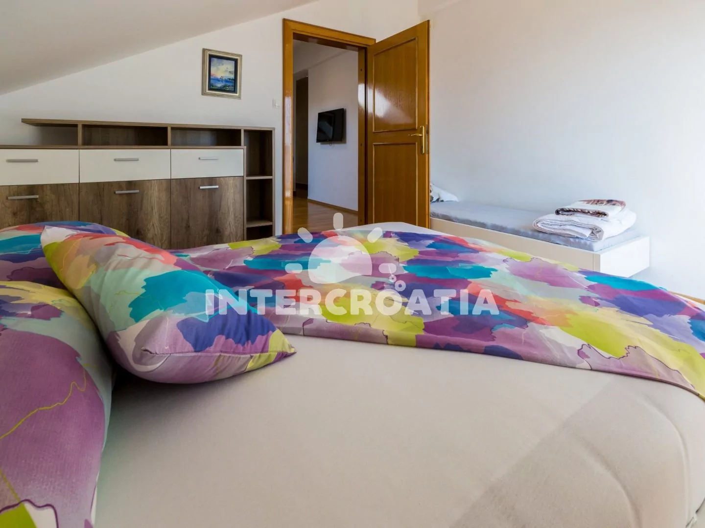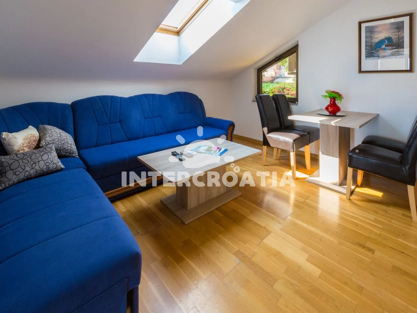 Podkrovní apartmán (40 m2) s terasou a výhledem na moře je vhodný pro až 4 osoby. Kuchyňská linka je vybavena sklokeramickou varnou deskou, digestoří, troubou, myčkou na nádobí, mikrovlnnou troubou, rychlovarnou konvicí, kávovarem, toustovačem, nádobím a lednicí s mrazákem. Obývací pokoj s jídelním stolem pro 4 osoby, pohovkou (rozložitelná na extra lůžko pro 2 osoby), televizí se satelitním programem a klimatizací. Ložnice s dvoulůžkem a vstupem na terasu. Koupelna se sprchovým koutem, umyvadlem a wc. Hostům je k dispozici parkování u objektu zdarma.
