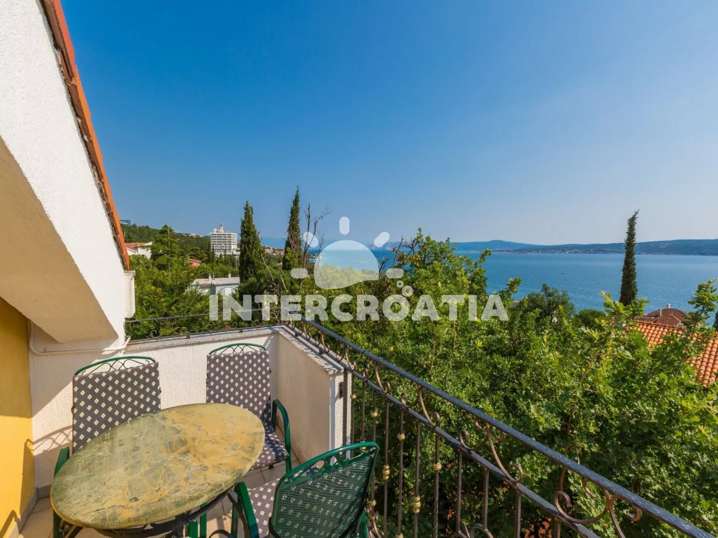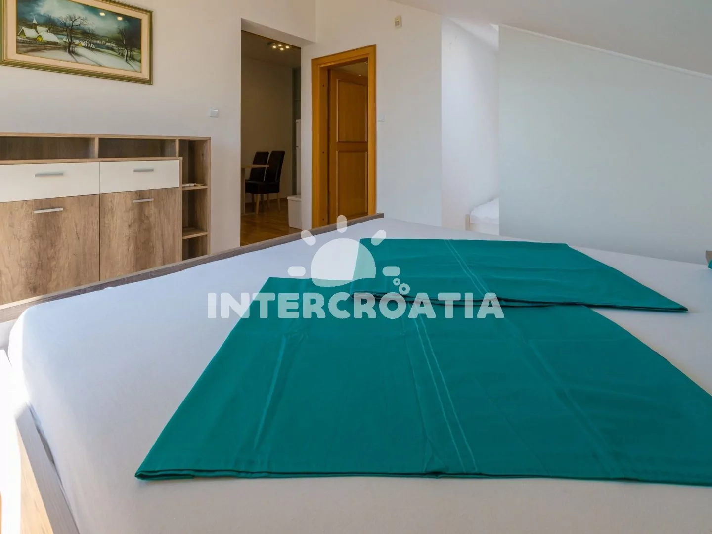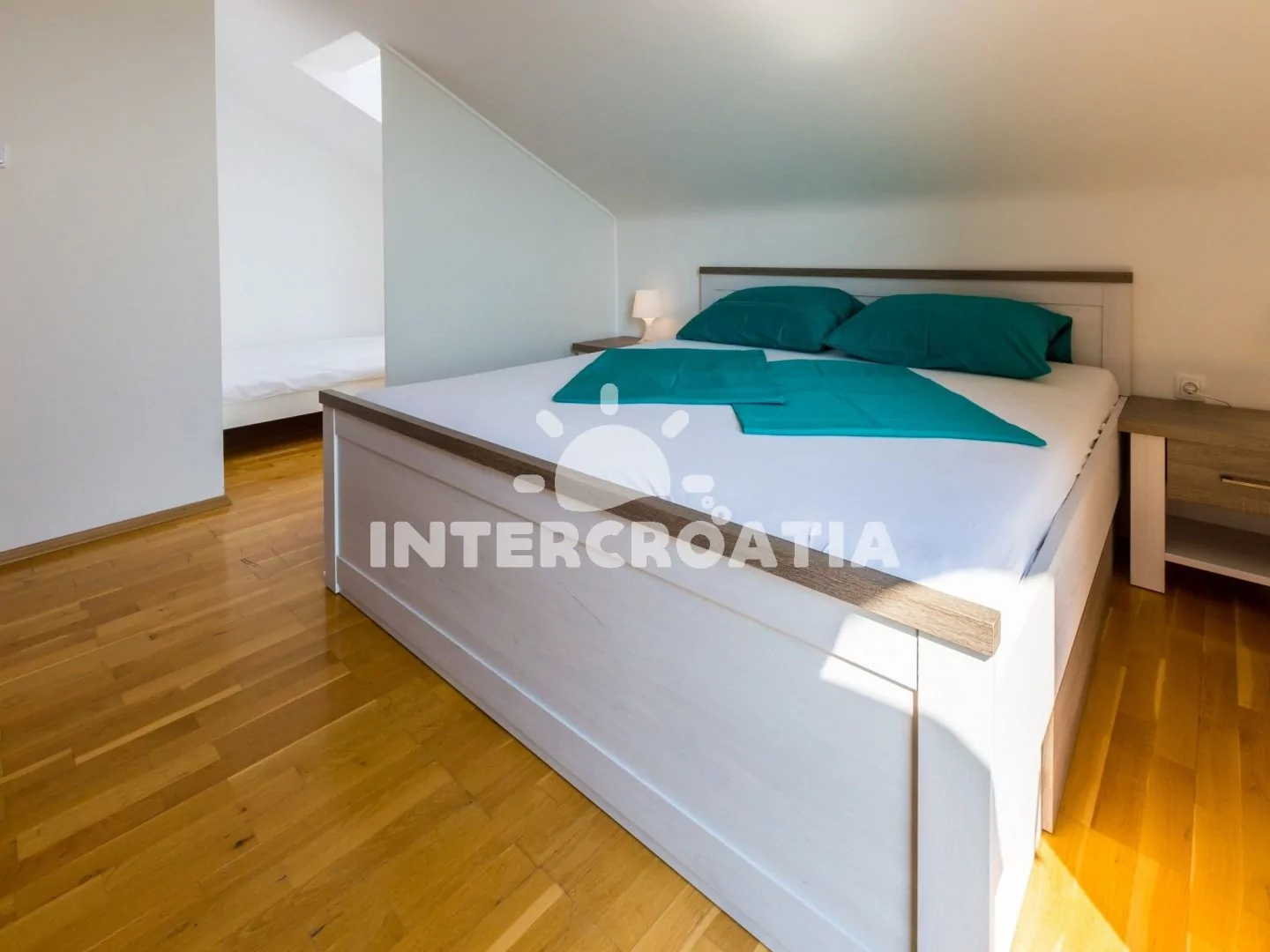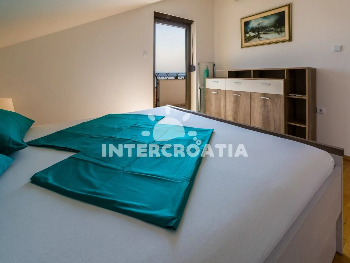 Podkrovní apartmán s terasou a výhledem na moře je vhodný pro až 4 osoby. Obývací pokoj je spojený s kuchyní. Kuchyňská linka je vybavena dvouplotýnkovým vařičem, digestoří, myčkou na nádobí, rychlovarnou konvicí, kávovarem, toustovačem, nádobím a lednicí s mrazákem. Obývací pokoj s jídelním stolem pro 4 osoby, pohovkou (rozložitelná na extra lůžko pro 1 osobu), televizí se satelitním programem a klimatizací. Ložnice s dvoulůžkem, jedním jednolůžkem a vstupem na terasu. Koupelna se sprchovým koutem, umyvadlem a wc. Hostům je k dispozici parkování u objektu zdarma.