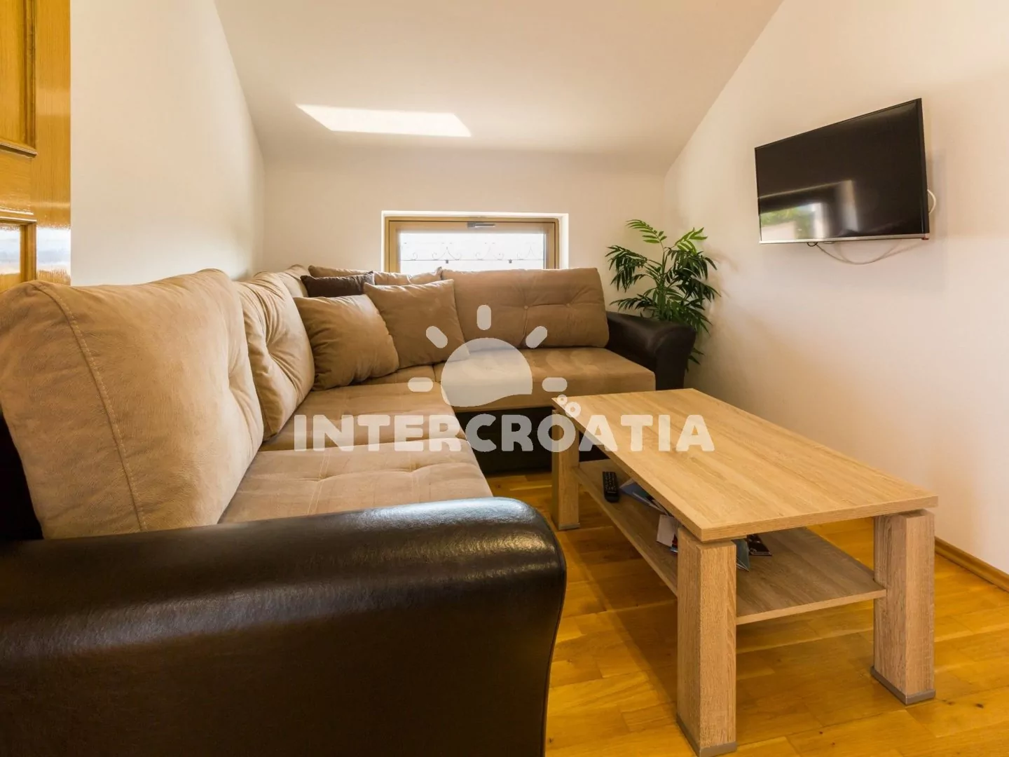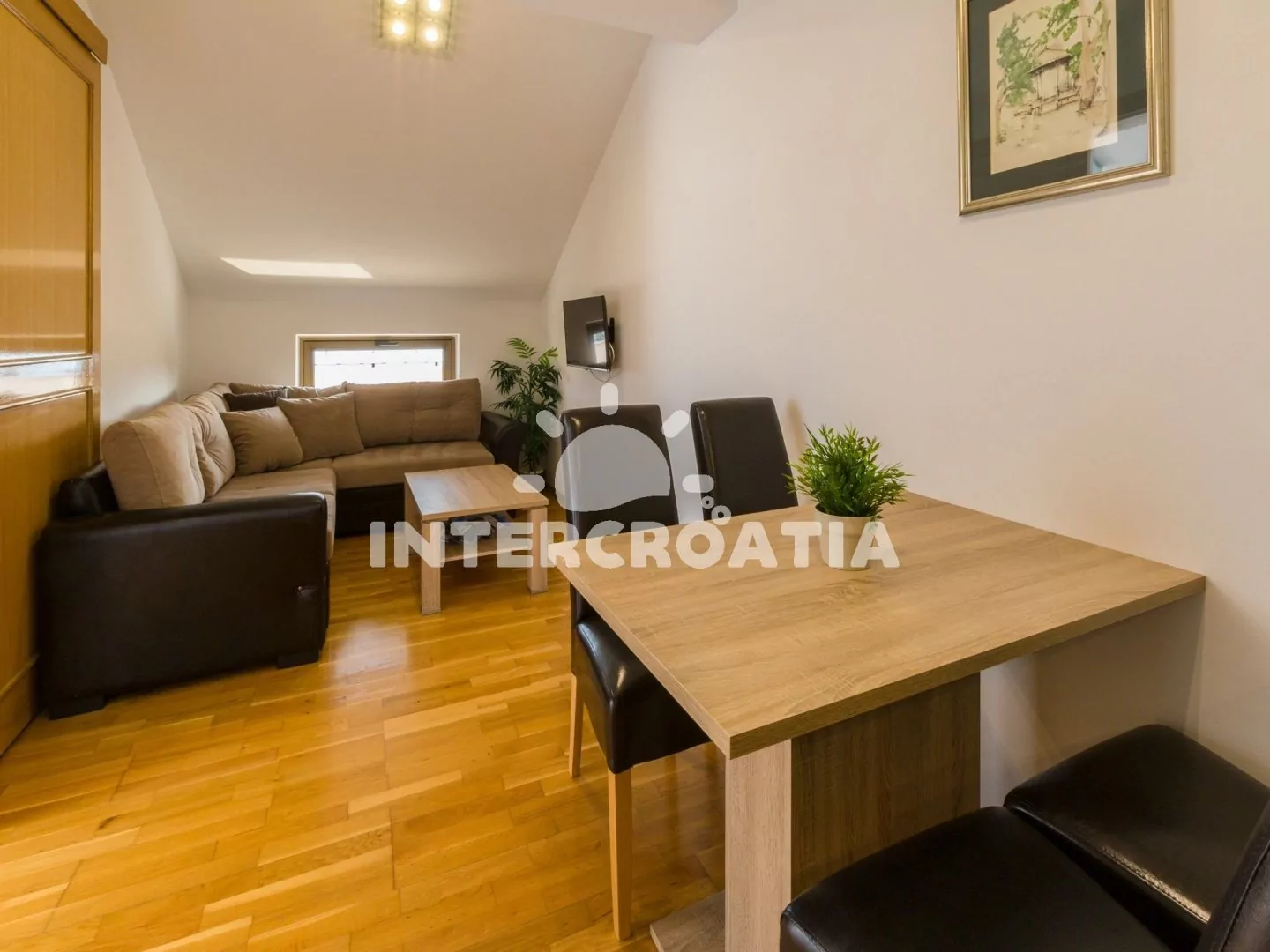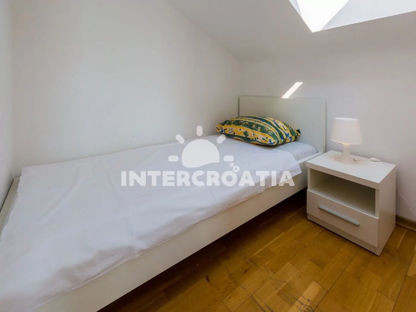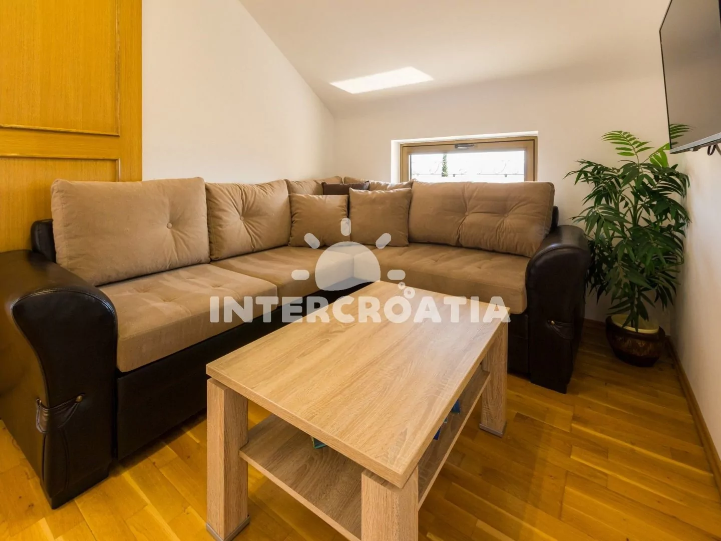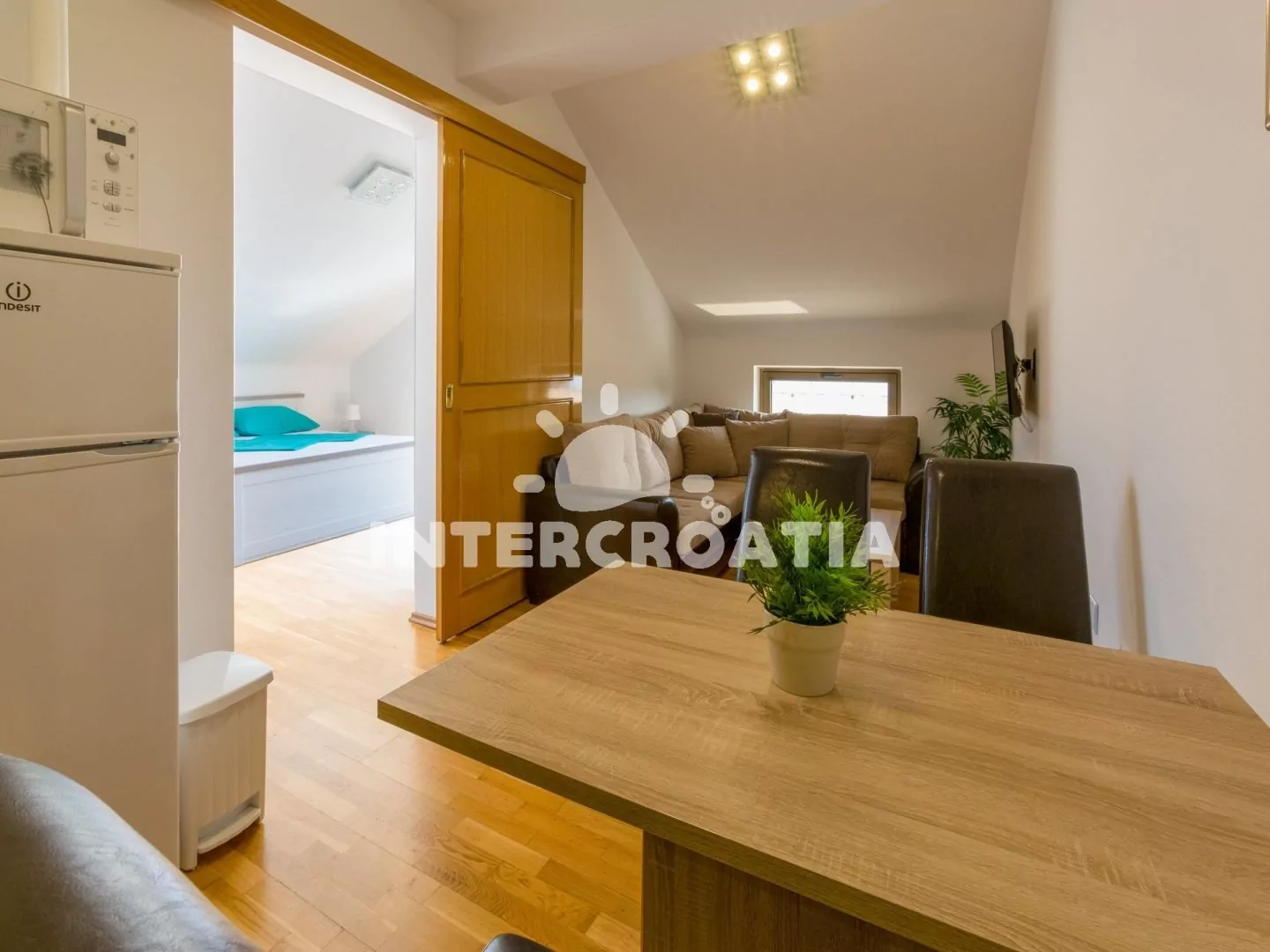 Podkrovní apartmán s terasou a výhledem na moře je vhodný pro až 4 osoby. Obývací pokoj je spojený s kuchyní. Kuchyňská linka je vybavena dvouplotýnkovým vařičem, digestoří, myčkou na nádobí,…