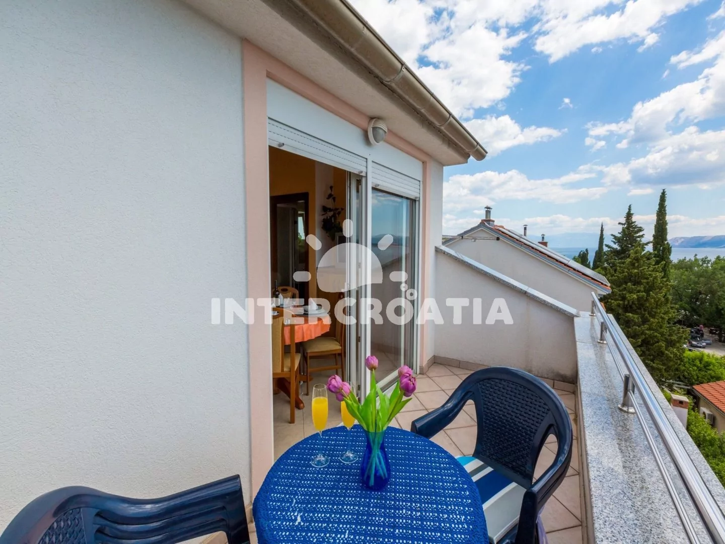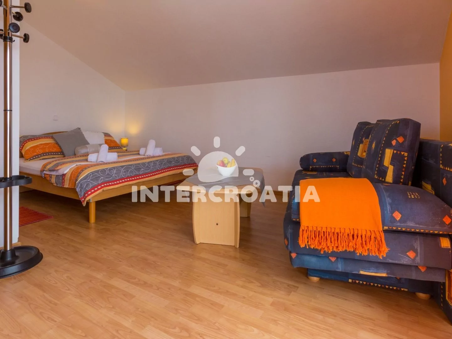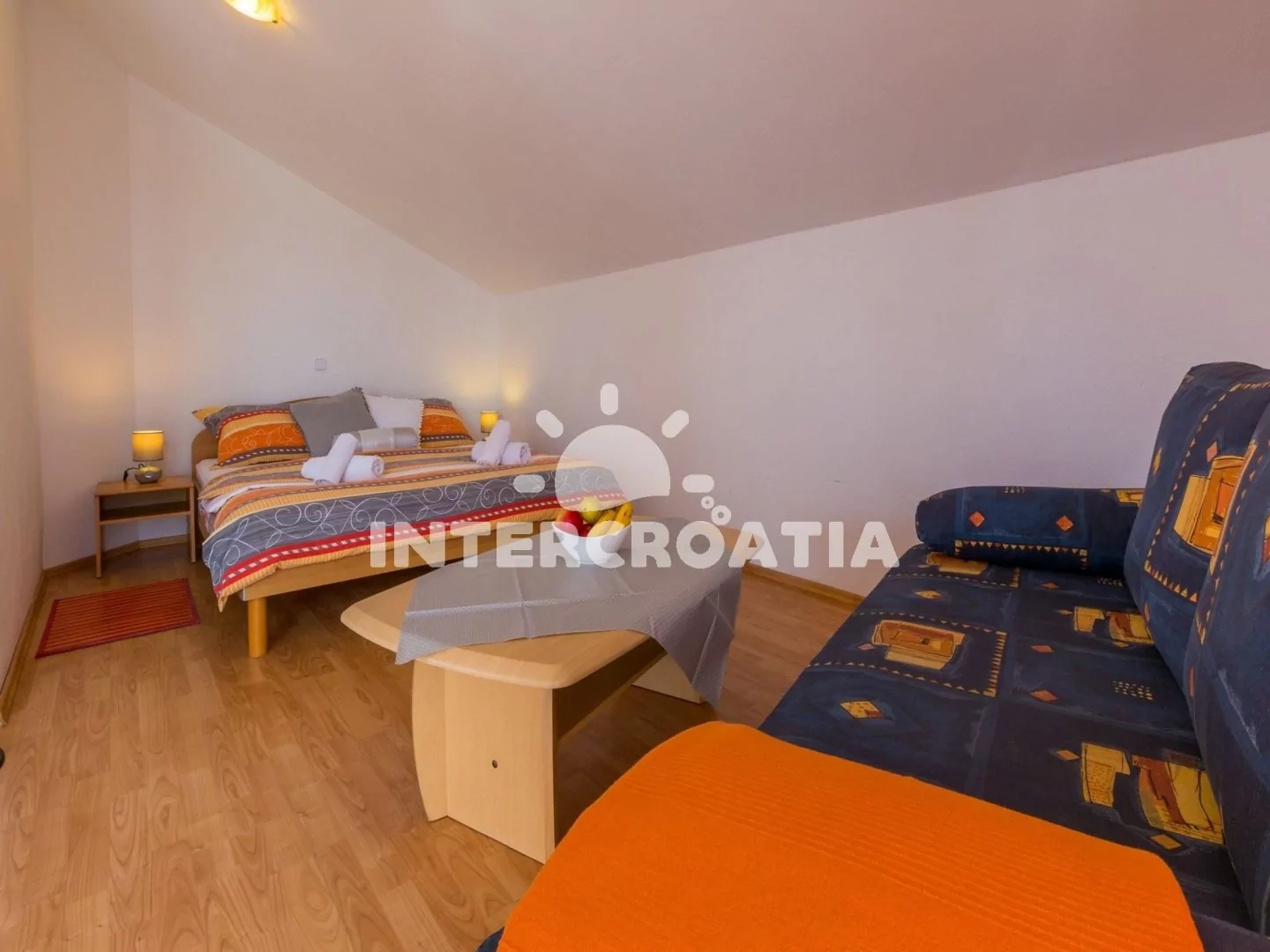 Apartmán (50 m2) s vlastní terasou a výhledem na moře, se nachází ve 3. patře vily a je vhodný až pro 4 osoby. Obývací pokoj je spojený s kuchyní. Kuchyňská linka je vybavena dvouplotýnkovým vařičem, digestoří, rychlovarnou konvicí, kávovarem, toustovačem, nádobím a lednicí s mrazákem. Obývací pokoj s jídelním stolem pro 4 osoby, pohovkou, televizí se satelitním programem, klimatizací a vstupem na terasu. Ložnice s jedním dvoulůžkem, pohovkou (rozložitelná na extra lůžko pro 2 osoby) a vstupem na terasu. Koupelna se sprchovým koutem, umyvadlem a wc. Hostům je k dispozici parkování u objektu zdarma.
