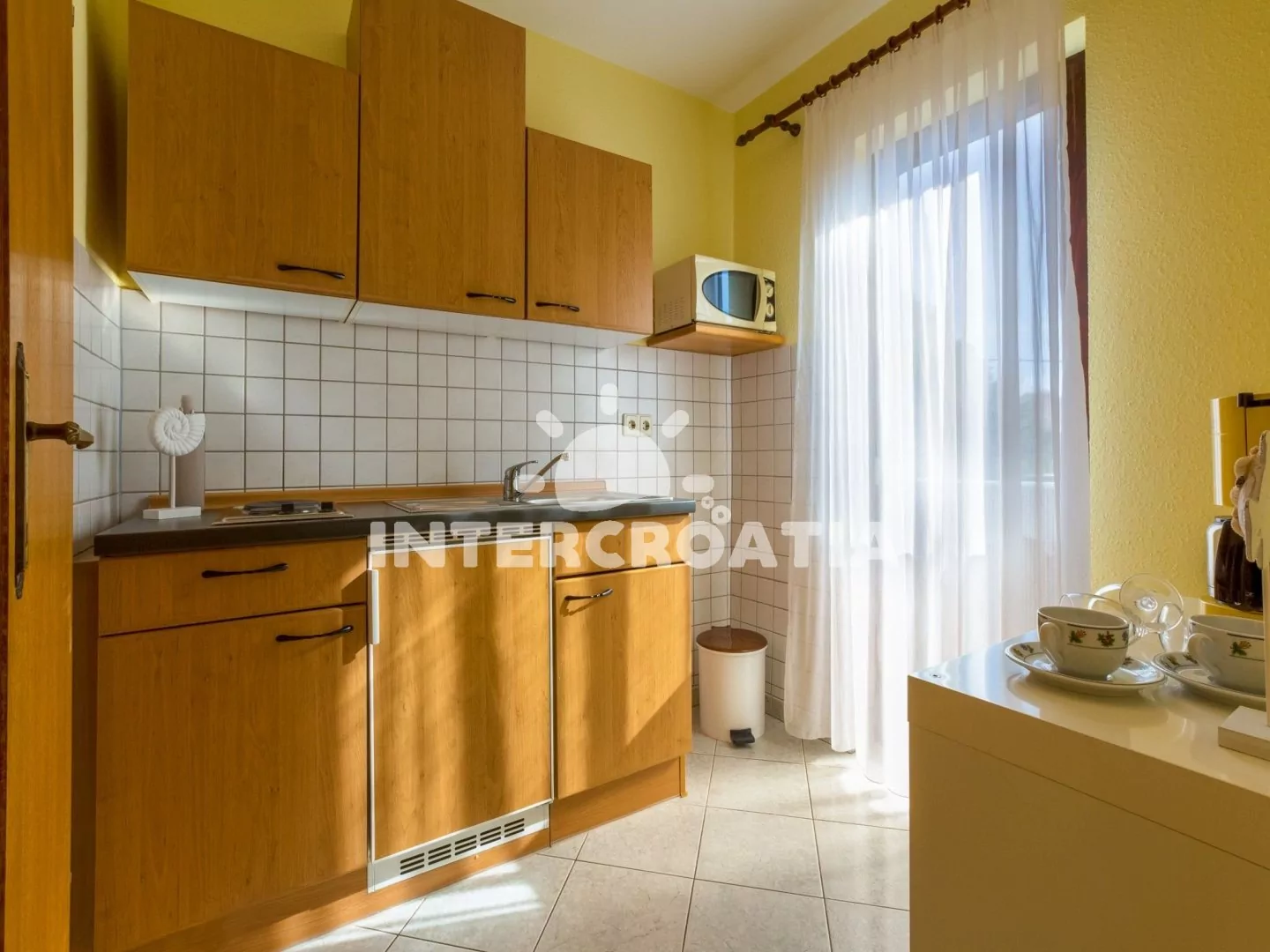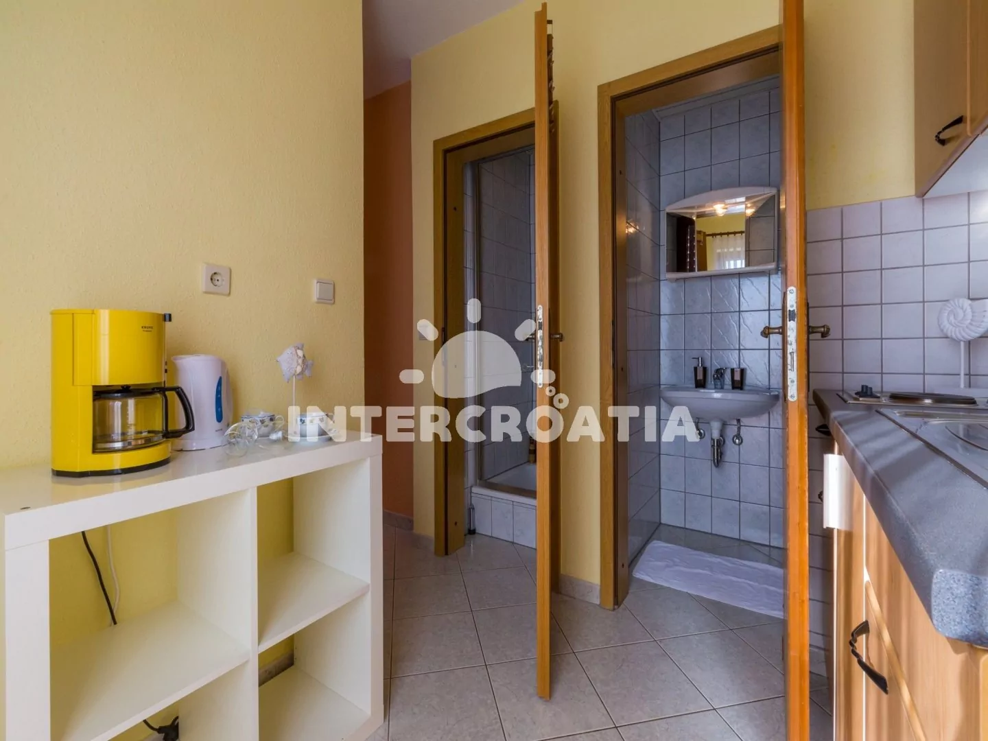 Apartmán (35 m2) typu studio s balkonem a výhledem na moře, se nachází v 2. patře vily a je vhodný pro 2 až 4 osoby. Obývací místnost je spojena s kuchyní. Kuchyňská linka je vybavena dvouplotýnkovým…