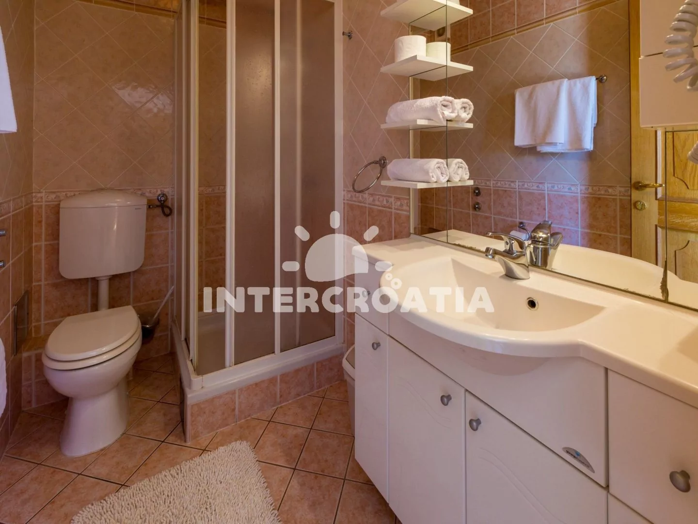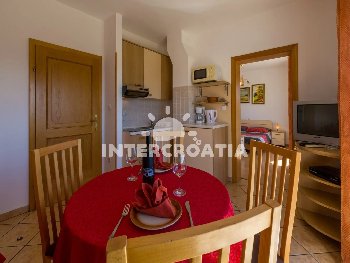 Apartmán (40 m2) s výhledem na moře a vlastním balkonem se nachází v 1. patře domu. Apartmán je vhodný pro 2 až 4 osoby. Obývací pokoj je spojený s kuchyní. Kuchyňská linka je vybavena dvouplotýnkovým vařičem, digestoří, mikrovlnnou troubou, rychlovarnou konvicí, kávovarem, nádobím a lednicí s mrazákem. Obývací pokoj s jídelním stolem pro 4 osoby, pohovkou (rozložitelná na extra lůžko pro 2 osoby), televizí se satelitním programem a klimatizací. Ložnice s dvoulůžkem a vstupem na balkon. Koupelna se sprchovým koutem, umyvadlem, fénem a wc. Hostům je k dispozici parkování u objektu zdarma.