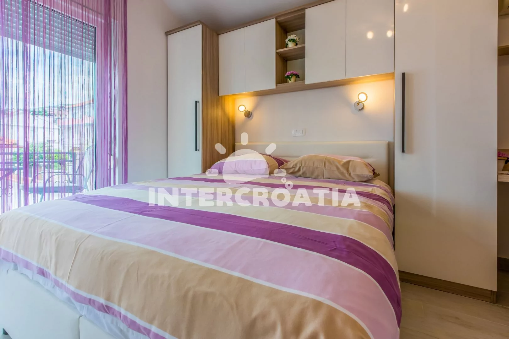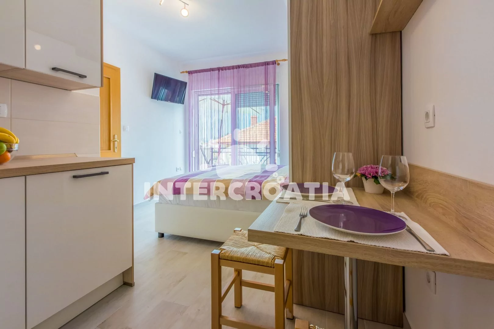 Apartmán typu studio (16 m2) s bočním výhledem na moře a balkonem se nachází v 2. patře domu a je vhodný pro 2 osoby. Obývací místnost je spojena s kuchyní. Kuchyňská linka je vybavena dvouplotýnkovým vařičem, digestoří, rychlovarnou konvicí, mikrovlnnou troubou, kávovarem, myčkou na nádobí, nádobím a lednicí s mrazákem. Obývací místnost s jídelním stolem, jedním dvoulůžkem, televizí se satelitním programem, klimatizací a vstupem na balkon. Koupelna se sprchovým koutem, umyvadlem, fénem a wc. Hostům je k dispozici parkování u objektu zdarma.