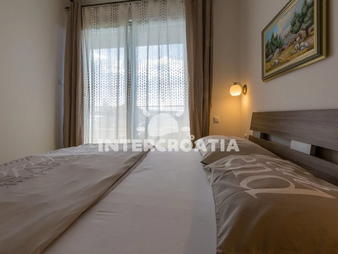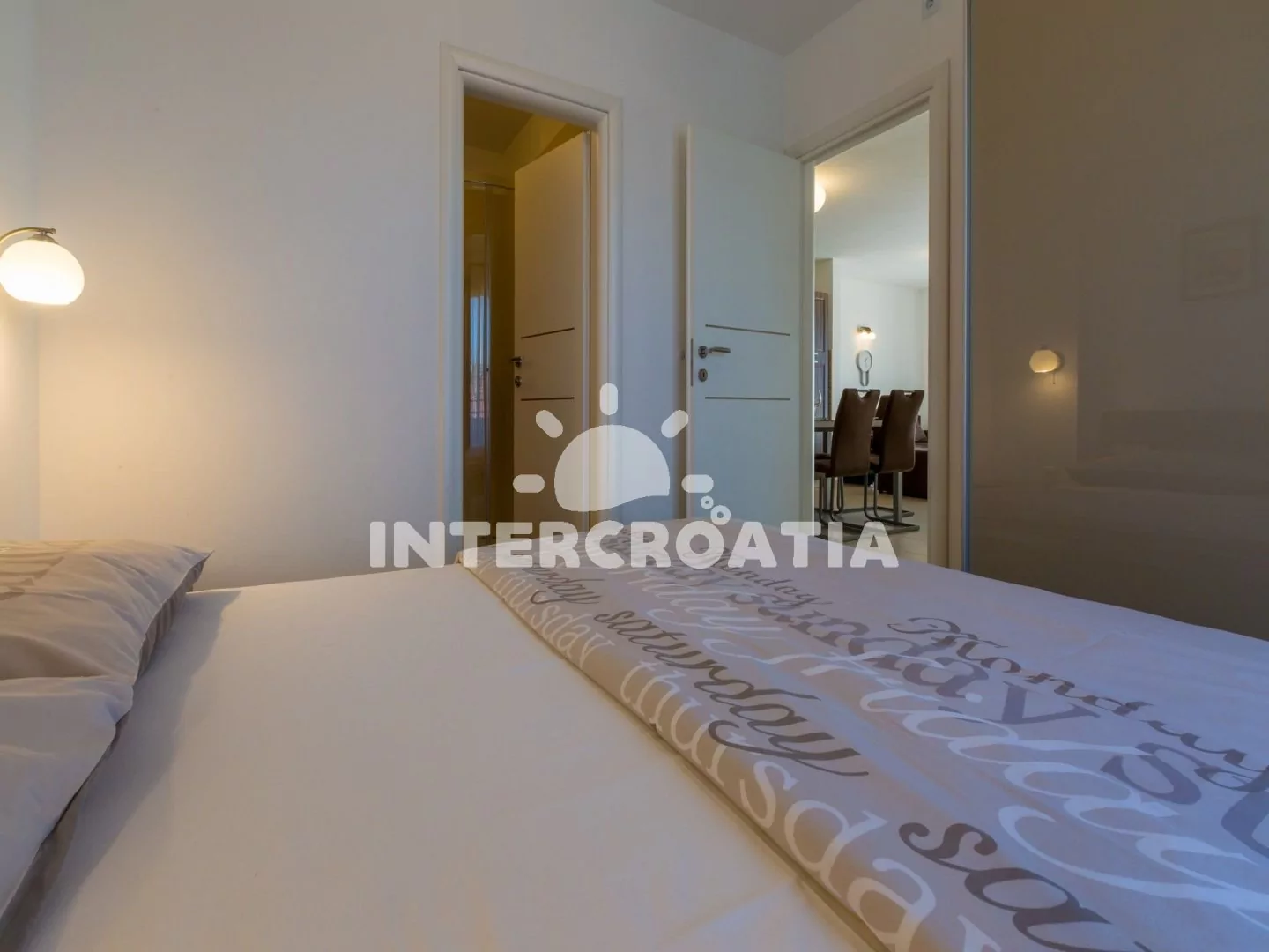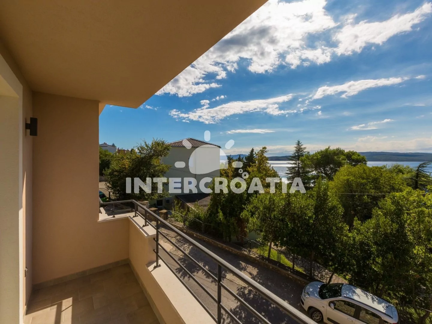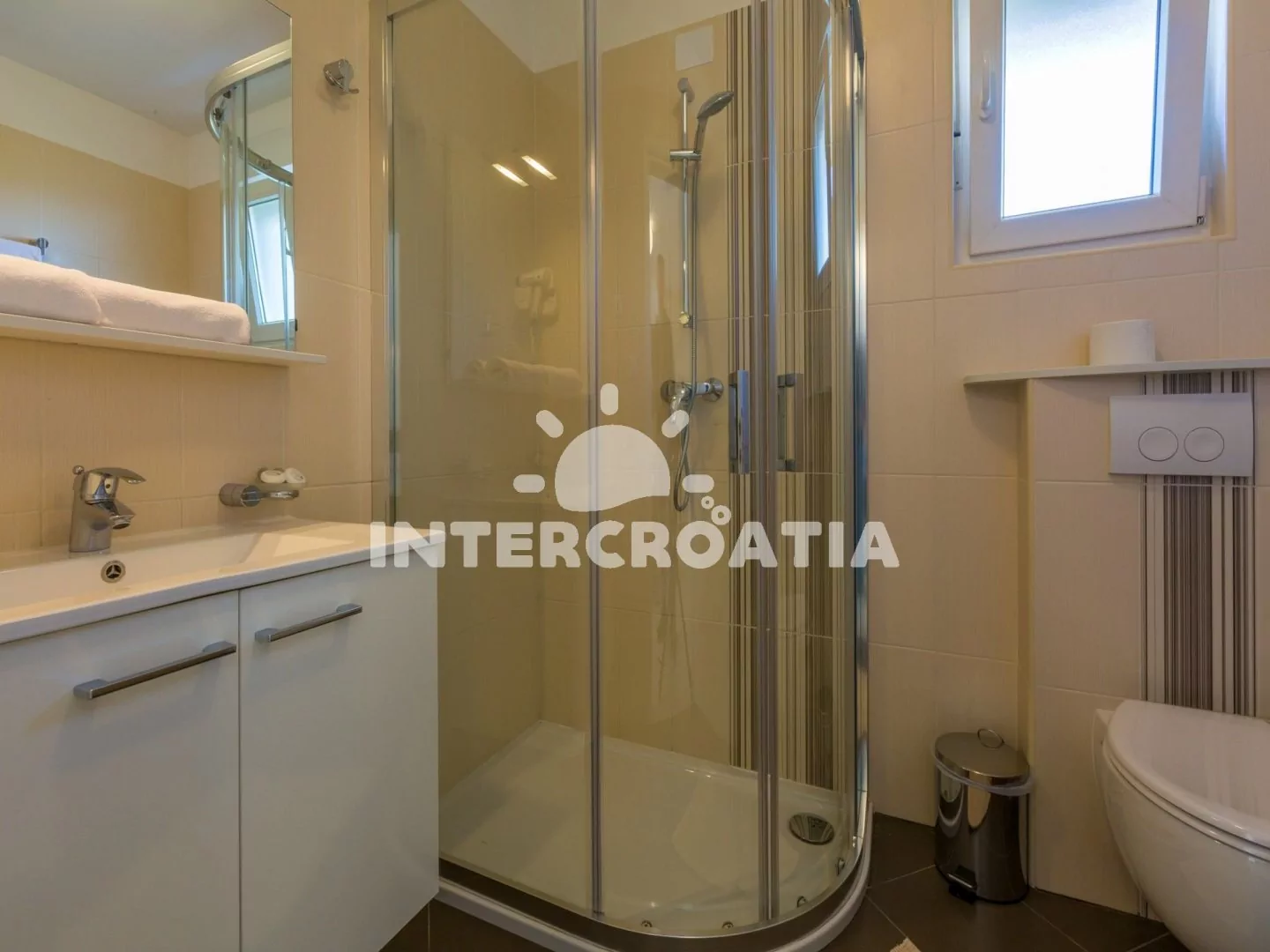 Vkusně zařízený apartmán (65 m2) s vlastním balkonem a výhledem na moře se nachází v 1. patře domu. Apartmán je vhodný pro 4 až 6 osob. Obývací pokoj je spojený s kuchyní. Kuchyňská linka je vybavena sklokeramickou varnou deskou, digestoří, troubou, mikrovlnnou troubou, kávovarem, myčkou na nádobí, rychlovarnou konvicí, toustovačem, nádobím a lednicí s mrazákem. Obývací pokoj s jídelním stolem pro 6 osob, pohovkou (rozložitelná na extra lůžko pro 2 osoby), televizí se satelitním programem, klimatizací a vstupem na balkon. První ložnice s dvoulůžkem, sejfem a vstupem na balkon. Druhá ložnice s dvoulůžkem a vstupem na balkon. První i druhá koupelna je vybavena se sprchovým koutem, umyvadlem a wc. Hostům je k dispozici parkování u objektu zdarma.