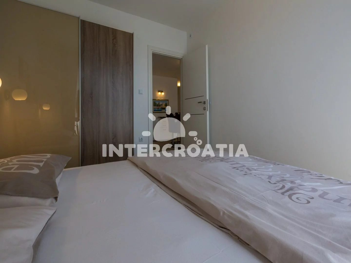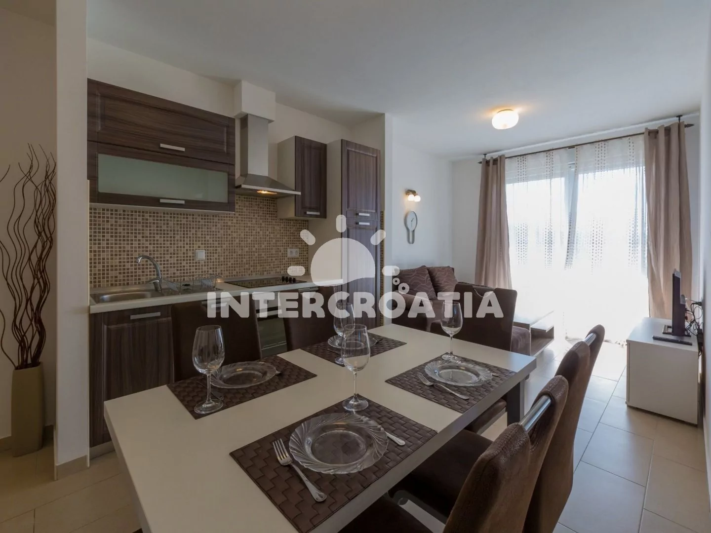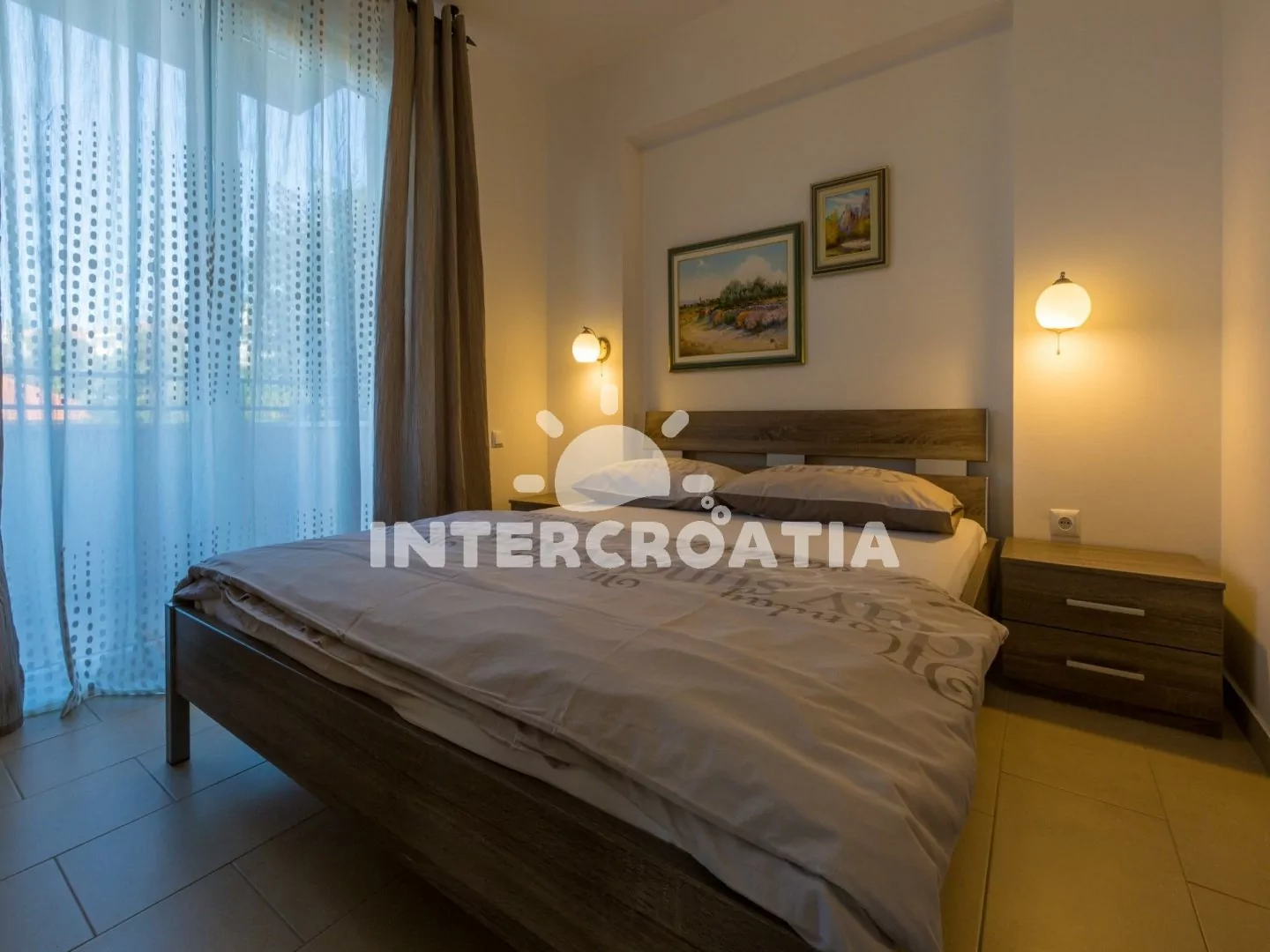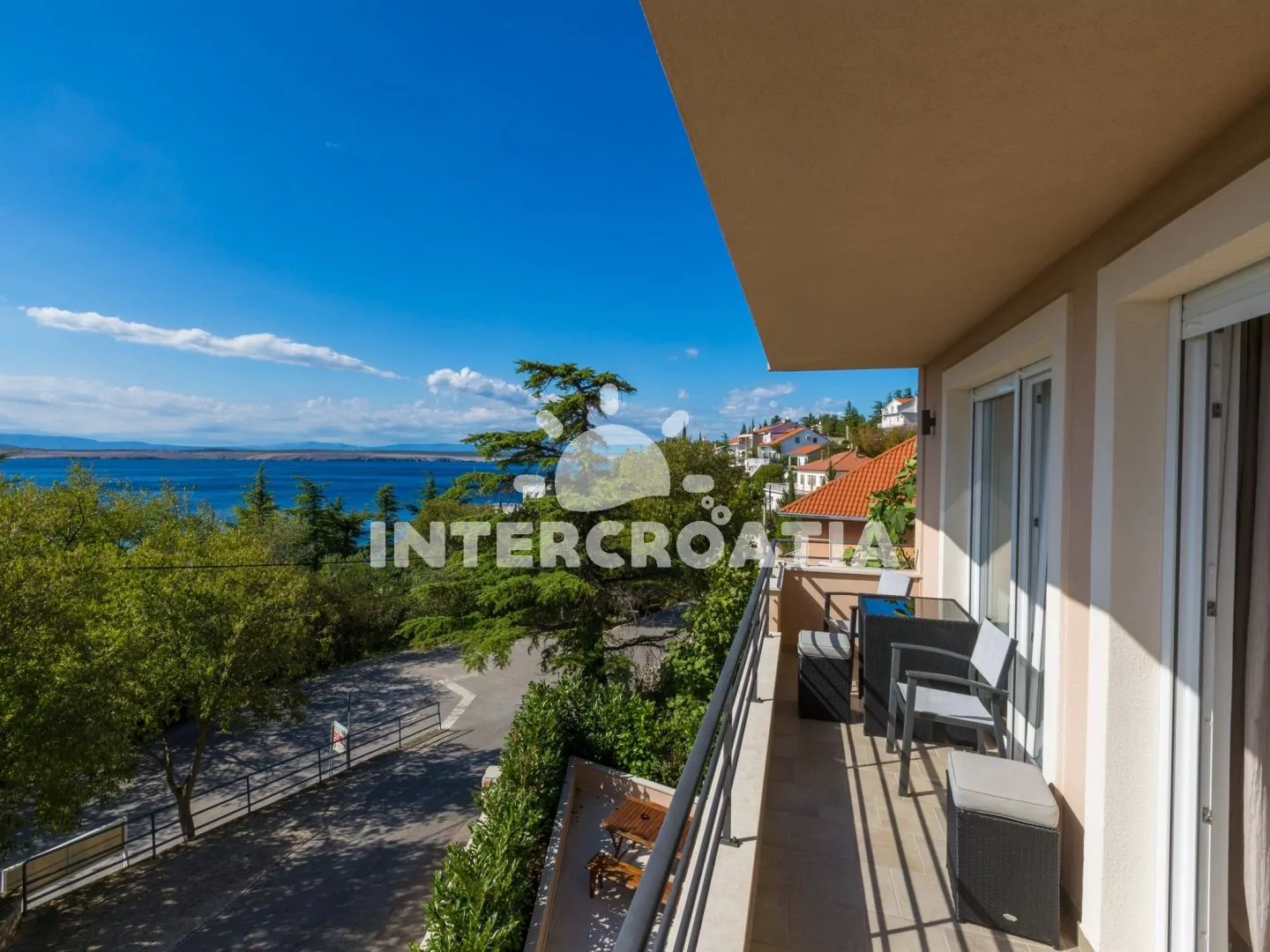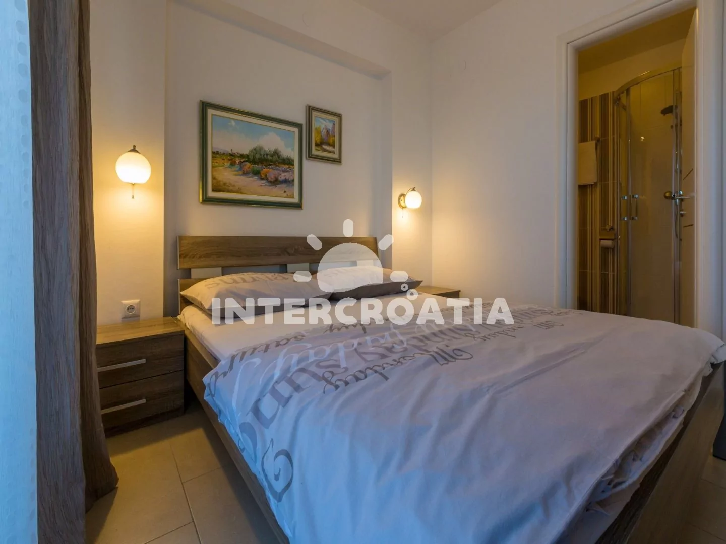 Vkusně zařízený apartmán (65 m2) s vlastním balkonem a výhledem na moře se nachází v 1. patře domu. Apartmán je vhodný pro 4 až 6 osob. Obývací pokoj je spojený s kuchyní. Kuchyňská linka je vybavena sklokeramickou varnou deskou, digestoří, troubou, mikrovlnnou troubou, kávovarem, myčkou na nádobí, rychlovarnou konvicí, toustovačem, nádobím a lednicí s mrazákem. Obývací pokoj s jídelním stolem pro 6 osob, pohovkou (rozložitelná na extra lůžko pro 2 osoby), televizí se satelitním programem, klimatizací a vstupem na balkon. První ložnice s dvoulůžkem, sejfem a vstupem na balkon. Druhá ložnice s dvoulůžkem a vstupem na balkon. První i druhá koupelna je vybavena se sprchovým koutem, umyvadlem a wc. Hostům je k dispozici parkování u objektu zdarma.