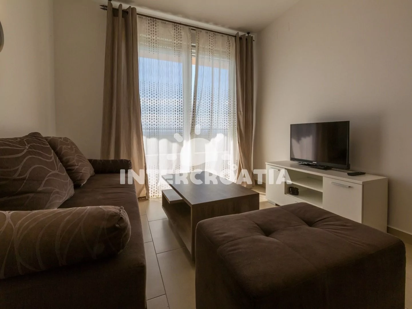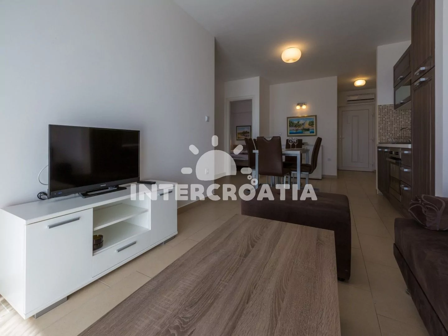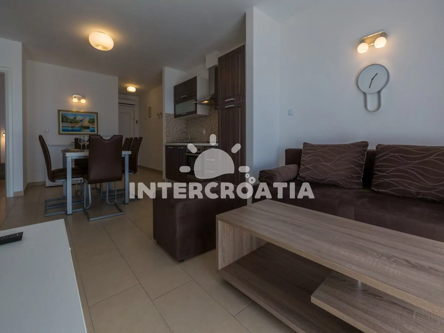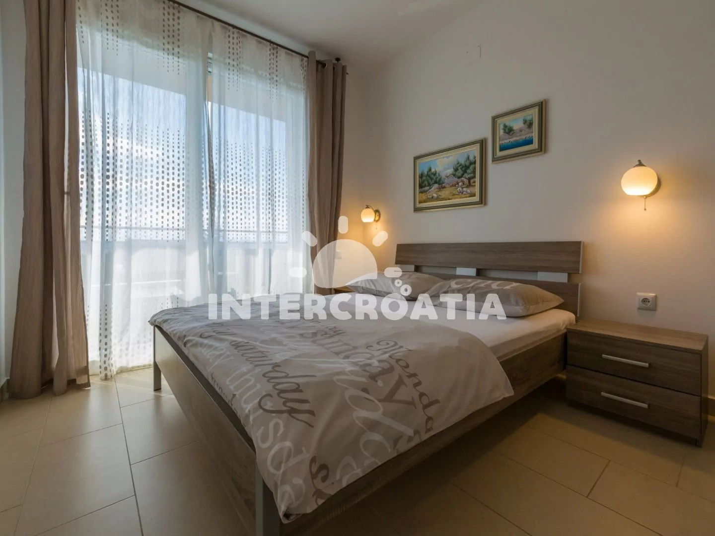 Vkusně zařízený apartmán (65 m2) s vlastním balkonem a výhledem na moře se nachází v 1. patře domu. Apartmán je vhodný pro 4 až 6 osob. Obývací pokoj je spojený s kuchyní. Kuchyňská linka je vybavena sklokeramickou varnou deskou, digestoří, troubou, mikrovlnnou troubou, kávovarem, myčkou na nádobí, rychlovarnou konvicí, toustovačem, nádobím a lednicí s mrazákem. Obývací pokoj s jídelním stolem pro 6 osob, pohovkou (rozložitelná na extra lůžko pro 2 osoby), televizí se satelitním programem, klimatizací a vstupem na balkon. První ložnice s dvoulůžkem, sejfem a vstupem na balkon. Druhá ložnice s dvoulůžkem a vstupem na balkon. První i druhá koupelna je vybavena se sprchovým koutem, umyvadlem a wc. Hostům je k dispozici parkování u objektu zdarma.
