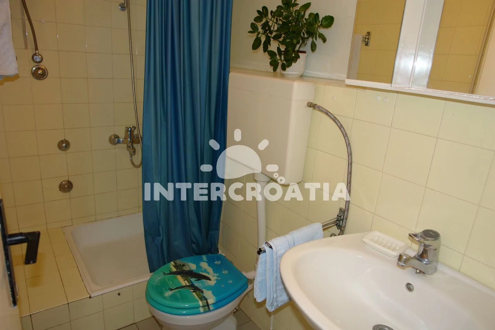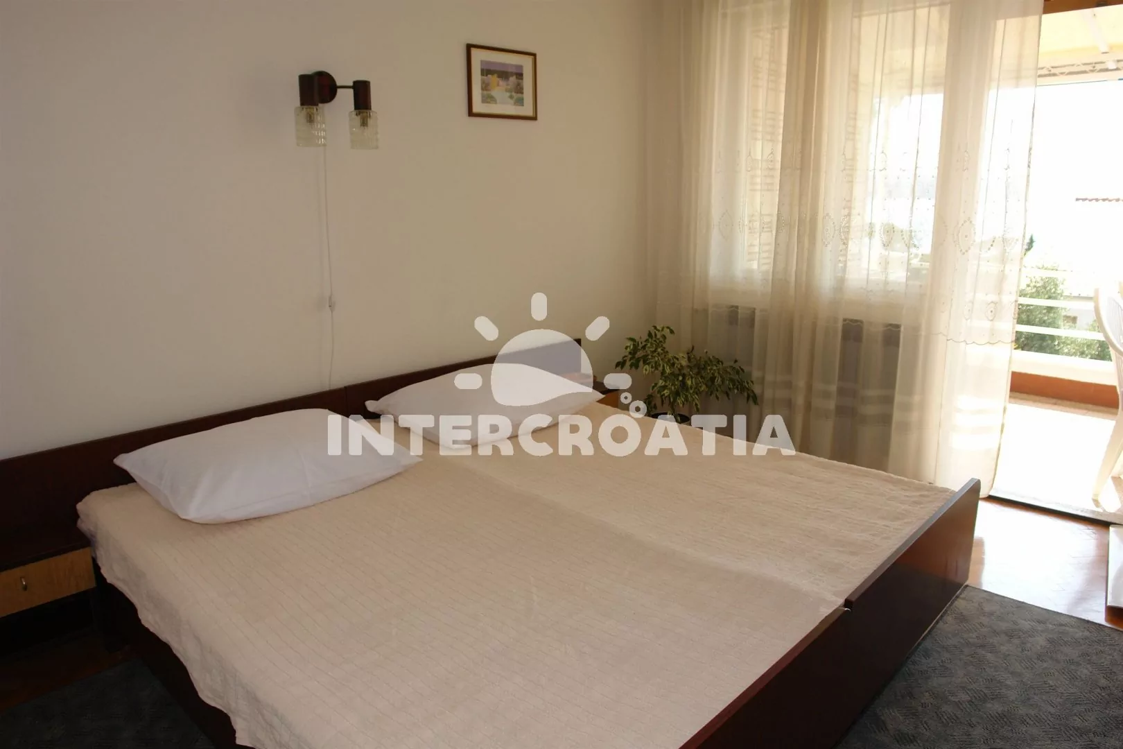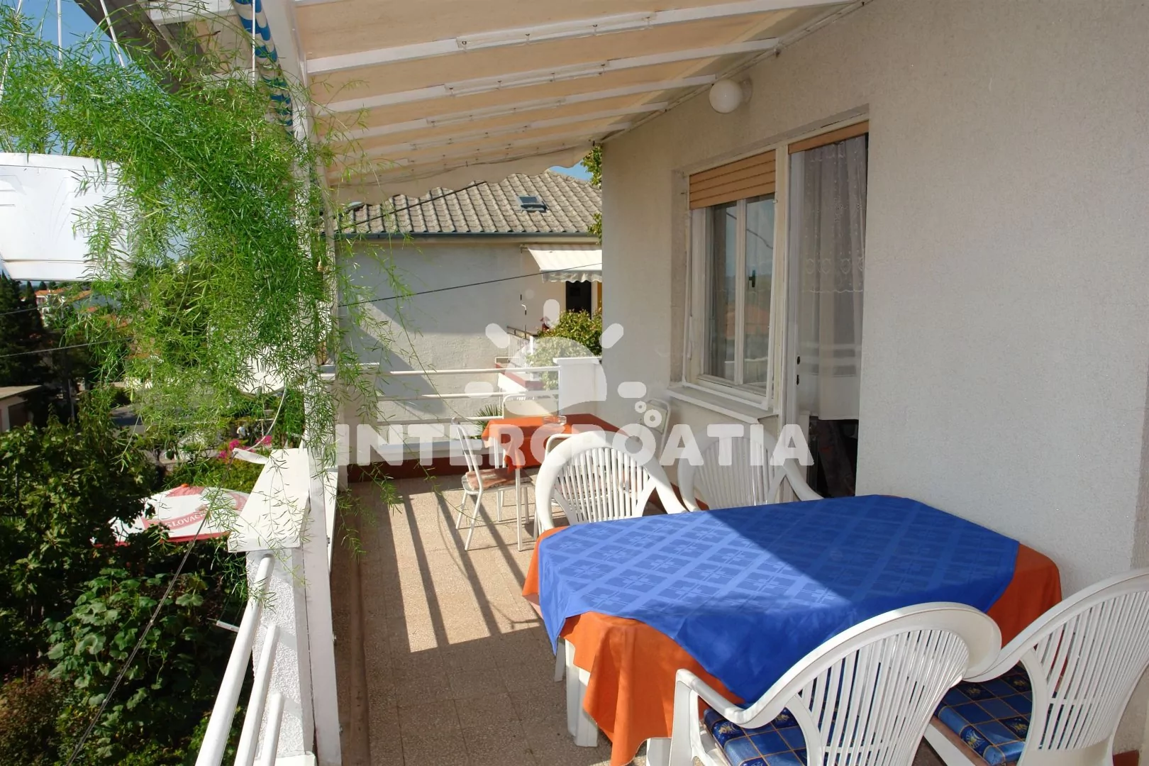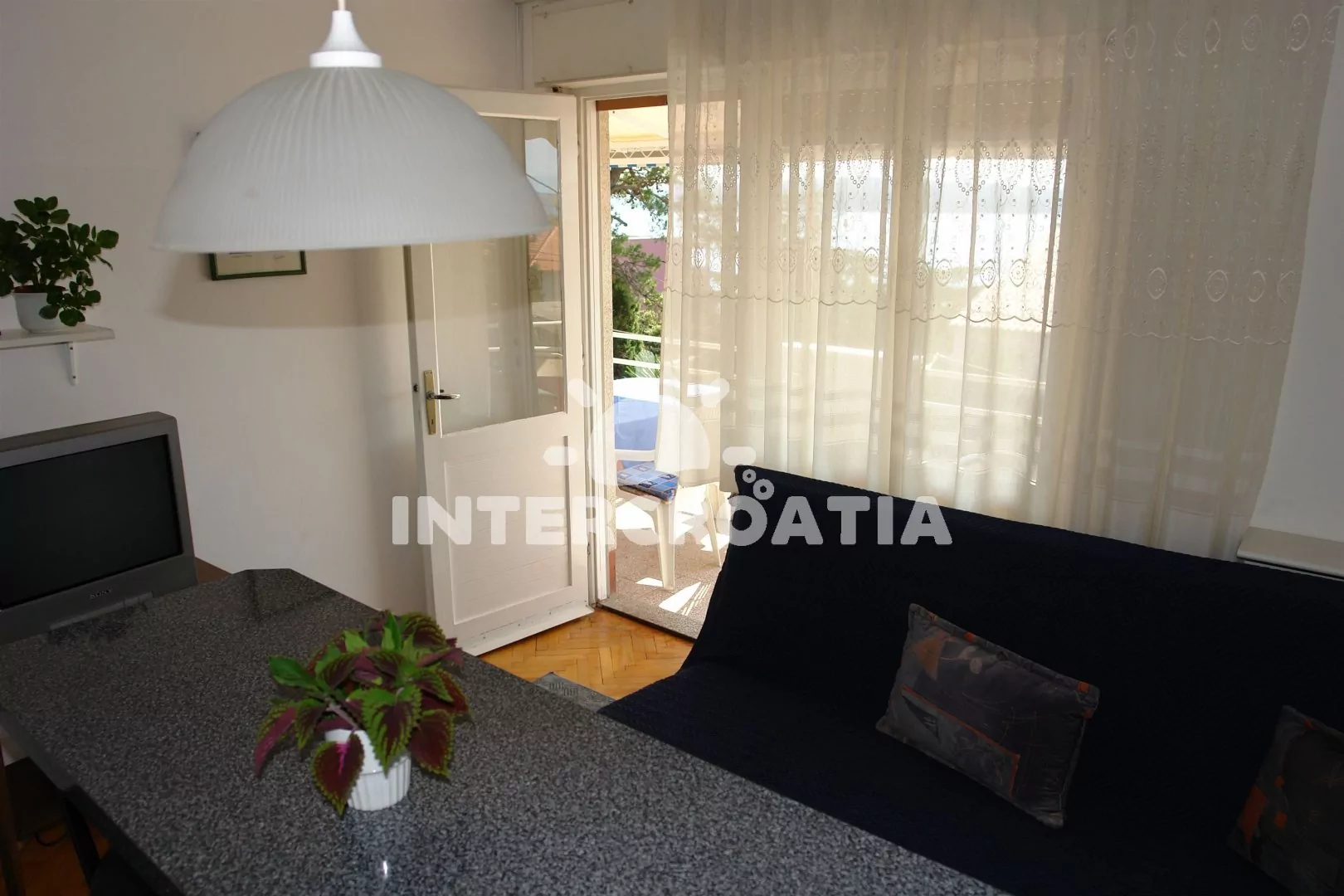 Apartmán s terasou a výhledem na moře se nachází v 1. patře domu a je vhodný pro 2 až 4 osoby. Obývací pokoj je spojený s kuchyní. Kuchyňská linka je vybavena varnou deskou, digestoří, troubou, kávovarem, nádobím a lednicí s mrazákem. Obývací pokoj s jídelním stolem, pohovkou (rozložitelná na extra lůžko pro 2 osoby), televizí se satelitním programem, klimatizací a vstupem na terasu. Ložnice s dvoulůžkem a vstupem na terasu. Koupelna se sprchovým koutem, umyvadlem a wc. Hostům je k dispozici parkování u objektu zdarma.