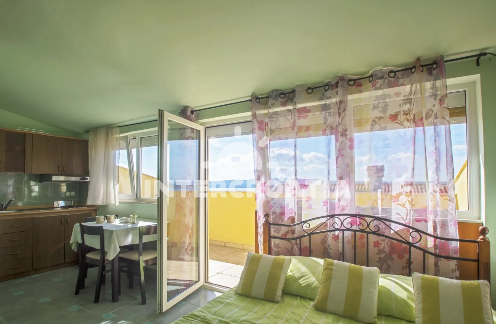 Podkrovní apartmán (23 m2) s lodžií a výhledem na moře je vhodný pro 2 osoby. Obývací místnost je spojena s kuchyní. Kuchyňská linka je vybavena dvouplotýnkovým vařičem, digestoří, mikrovlnnou troubou, kávovarem, nádobím a lednicí s mrazákem. Obývací místnost s jídelním stolem, televizí se satelitním programem, jedním dvoulůžkem, klimatizací a vstupem na balkon. Koupelna se sprchovým koutem, umyvadlem a wc. Hostům je k dispozici parkování u objektu zdarma.
