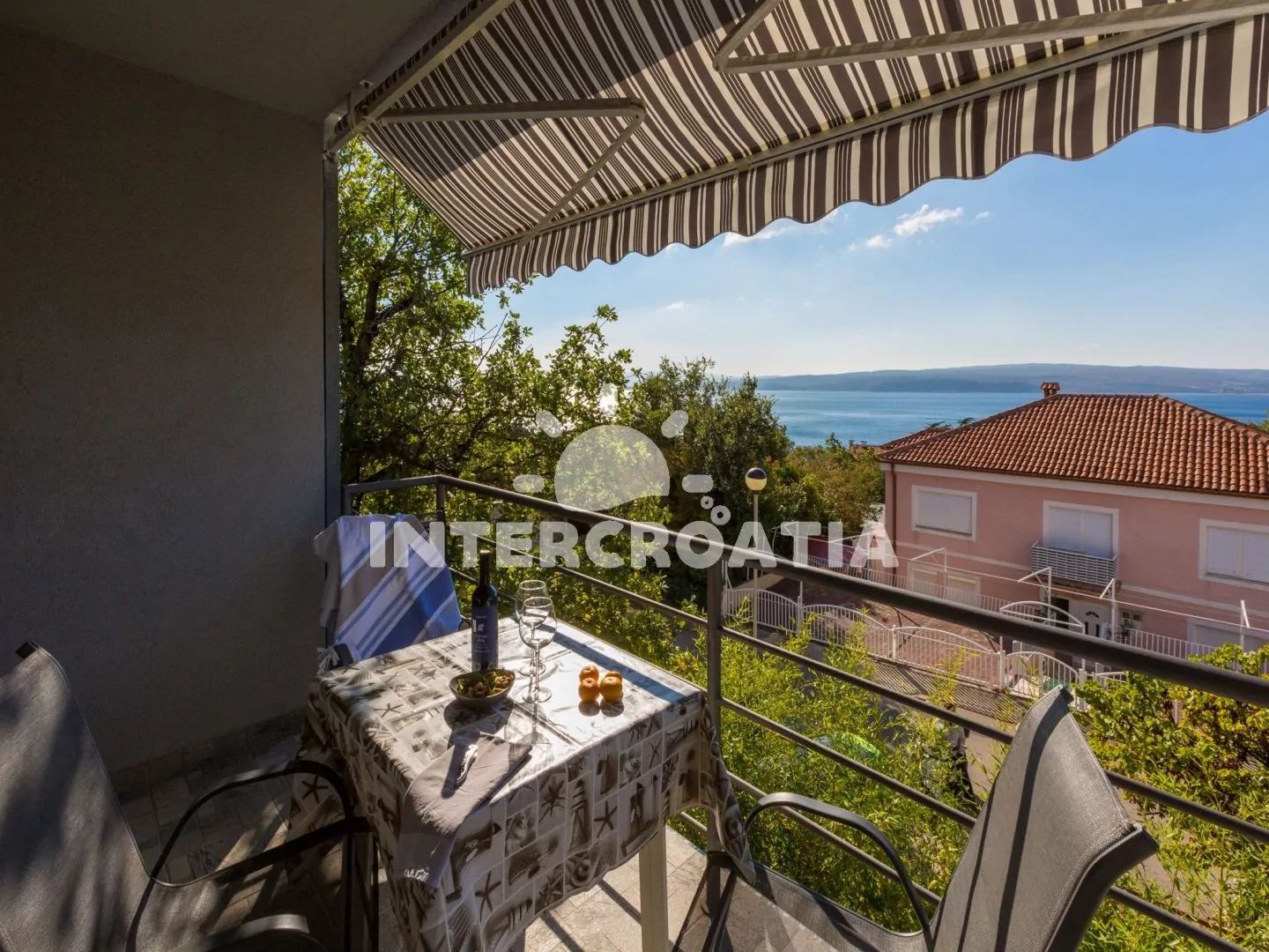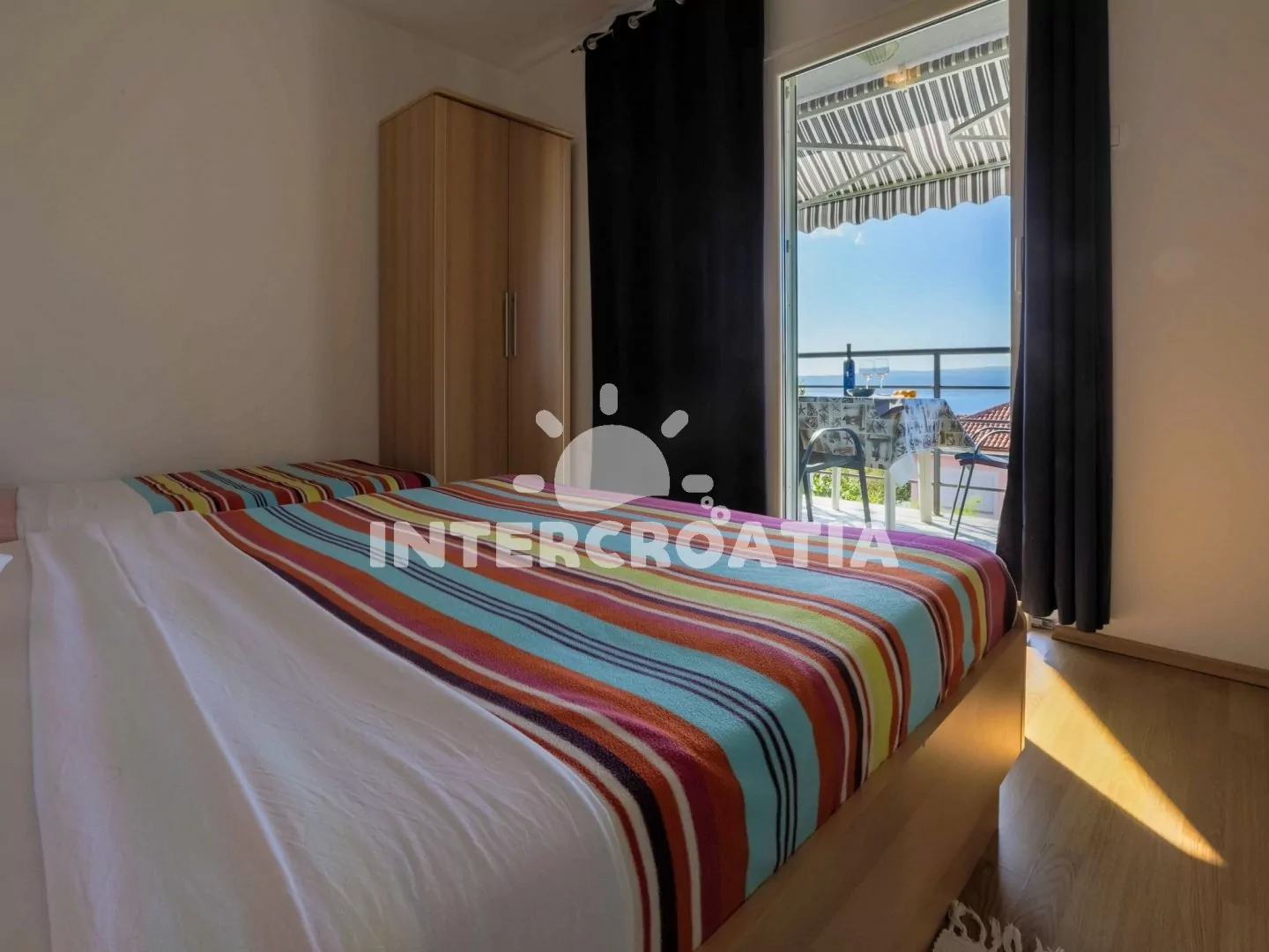 Apartmán (39 m2) s vlastním balkonem, výhledem na moře a klidné ulice, se nachází v 1. patře domu a je vhodný pro 3 až 4 osoby. Obývací pokoj je spojený s kuchyní. Kuchyňská linka je vybavena dvouplotýnkovým vařičem, rychlovarnou konvicí, kávovarem, toustovačem, nádobím a lednicí s mrazákem. Obývací pokoj s jídelním stolem pro 4 osoby, pohovkou (rozložitelná na extra lůžko pro 1 osobu), televizí se satelitním programem a klimatizací. Ložnice s dvoulůžkem, jedním jednolůžkem a vstupem na balkon. Koupelna se sprchovým koutem, umyvadlem a wc. Hostům je k dispozici parkování u objektu zdarma.