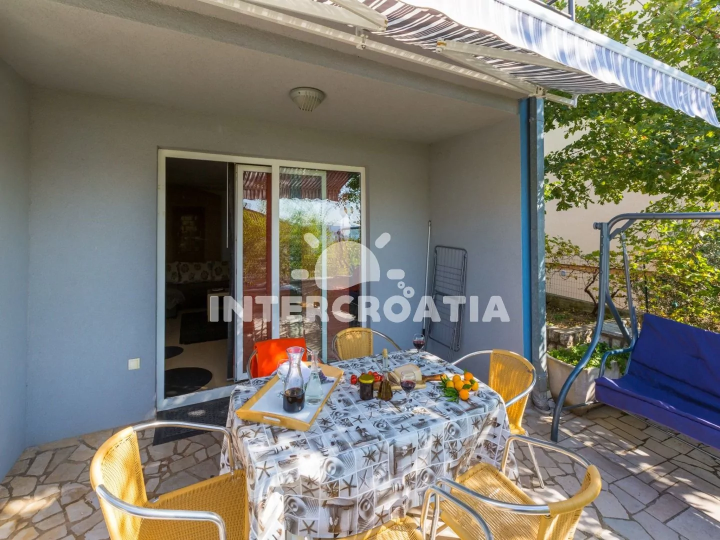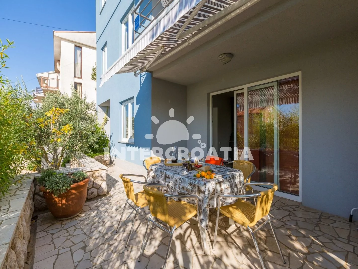 Apartmán (70 m2) s vlastní terasou, se nachází v přízemí domu a je vhodný pro 5 až 8 osob. Obývací pokoj je spojený s kuchyní. Kuchyňská linka je vybavena varnou deskou, digestoří, troubou, myčkou na nádobí, mikrovlnnou troubou, rychlovarnou konvicí, kávovarem, toustovačem, nádobím a lednicí s mrazákem. Obývací pokoj s jídelním stolem pro 6 osob, sedací soupravou s pohovkou (rozložitelná na extra lůžko pro 2 osoby), televizí se satelitním programem, radiem, klimatizací a vstupem na terasu. První ložnice s dvoulůžkem. Druhá ložnice s třemi lůžky a jedním patrovým lůžkem. Koupelna se sprchovým koutem, umyvadlem a wc. Dále samostatné wc s umyvadlem. Hostům je k dispozici parkování u objektu zdarma.