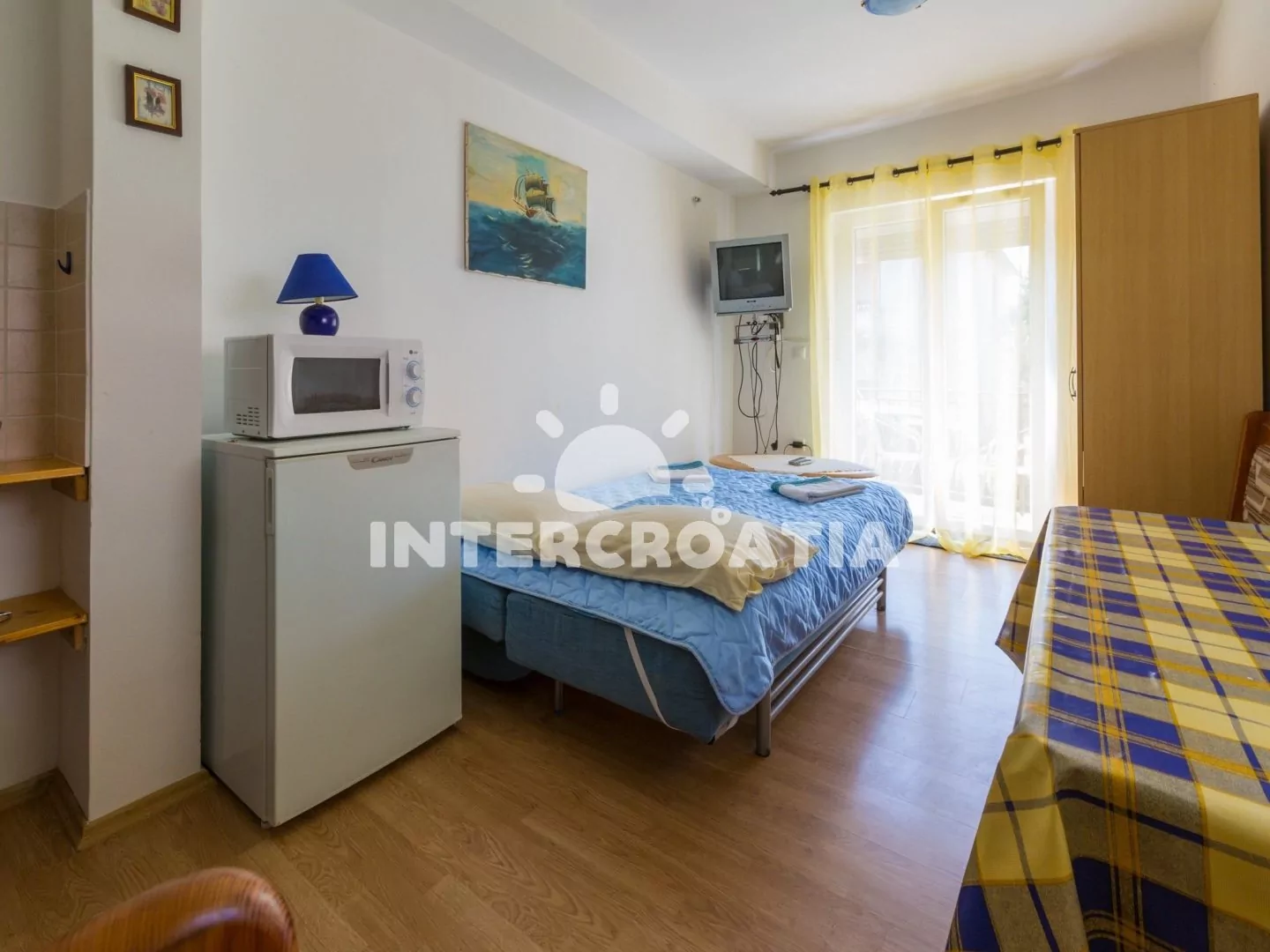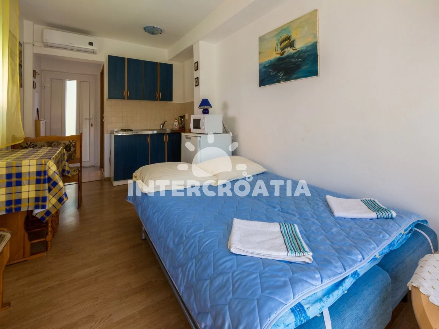 Apartmán typu studio s balkonem, se nachází v 1. patře domu a je vhodný pro 2 osoby. Obývací místnost je spojena s kuchyní. Kuchyňská linka je vybavena dvouplotýnkovým vařičem, rychlovarnou konvicí, kávovarem, toustovačem, nádobím a lednicí s mrazákem. Obývací místnost s jídelním stolem pro 2 osoby, jedním dvoulůžkem, televizí se satelitním programem, klimatizací a vstupem na balkon. Koupelna se sprchovým koutem, umyvadlem a wc. Hostům je k dispozici parkování u objektu zdarma.