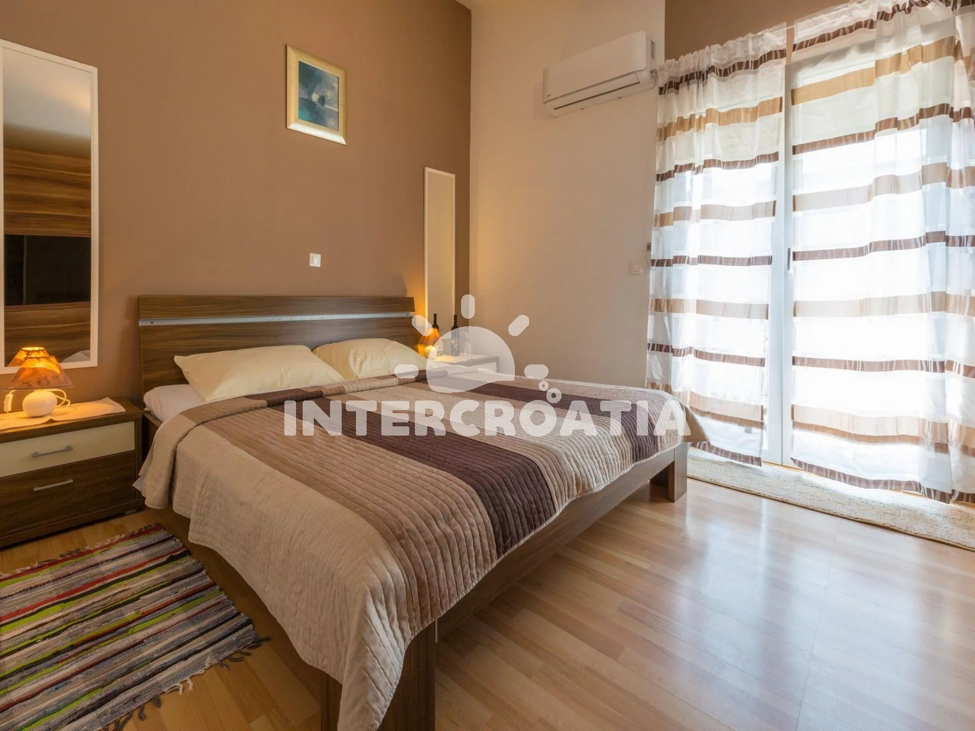 Apartmán (40 m2) s balkonem a výhledem na moře, se nachází v 1. patře domu a je vhodný pro 4 osoby. Kuchyň s jídelním stolem, kuchyňskou linkou s dvouplotýnkovým vařičem, mikrovlnnou troubou, rychlovarnou konvicí, kávovarem, toustovačem, nádobím a lednicí s mrazákem. První ložnice s dvoulůžkem, televizí se satelitním programem, klimatizací a vstupem na balkon. Druhá ložnice s dvoulůžkem. Koupelna s vanou, umyvadlem a wc. Hostům je k dispozici parkování u objektu zdarma.