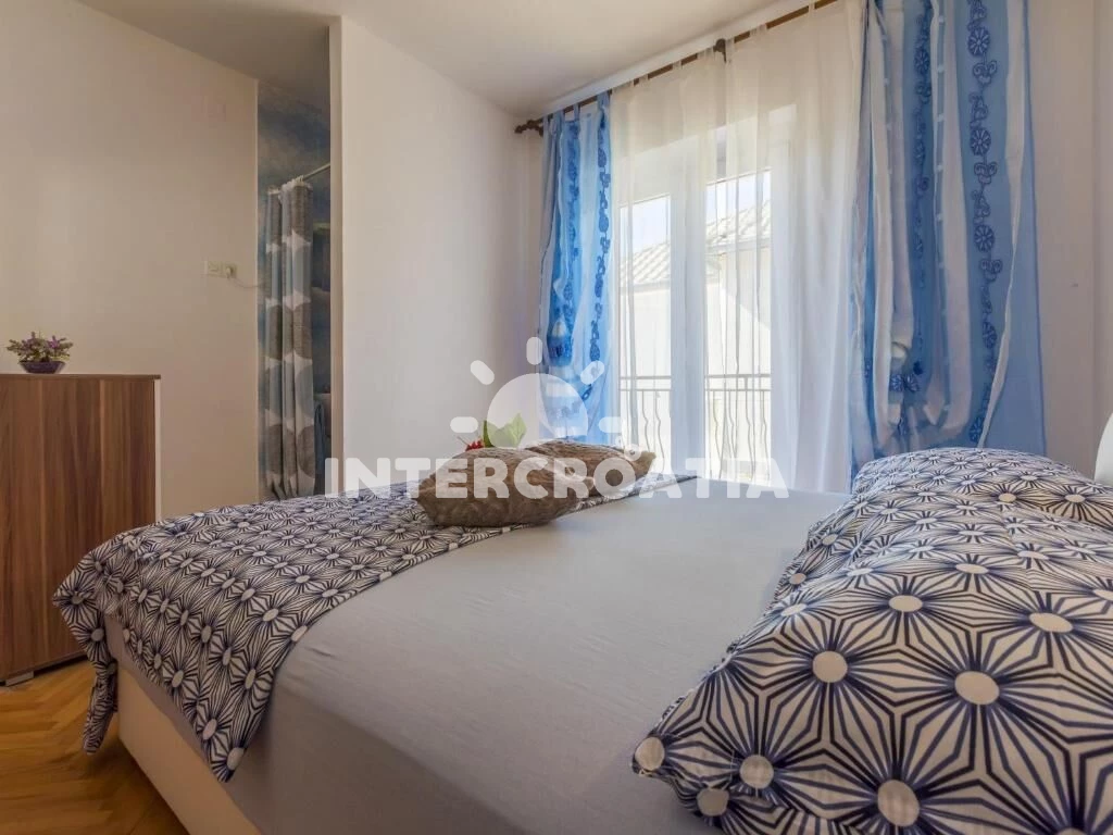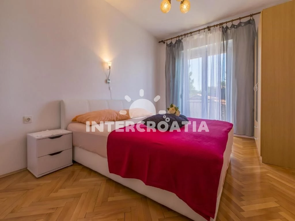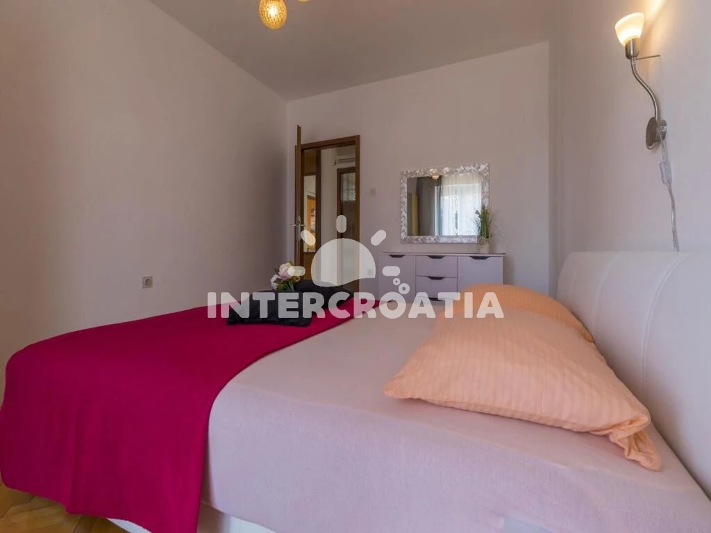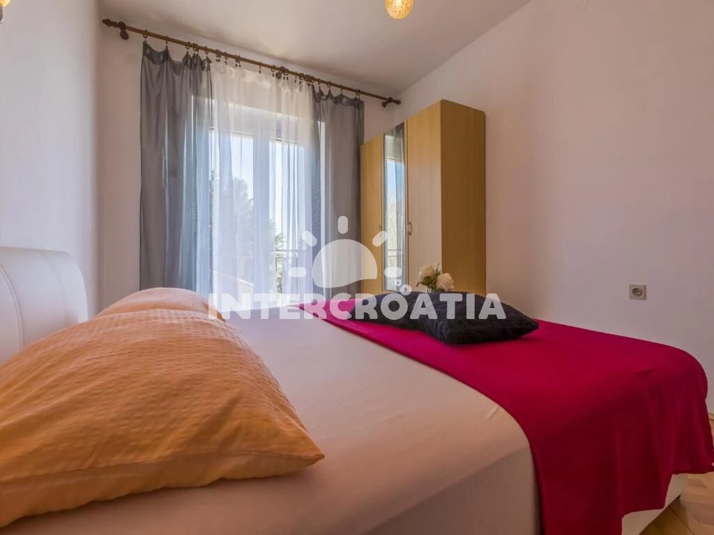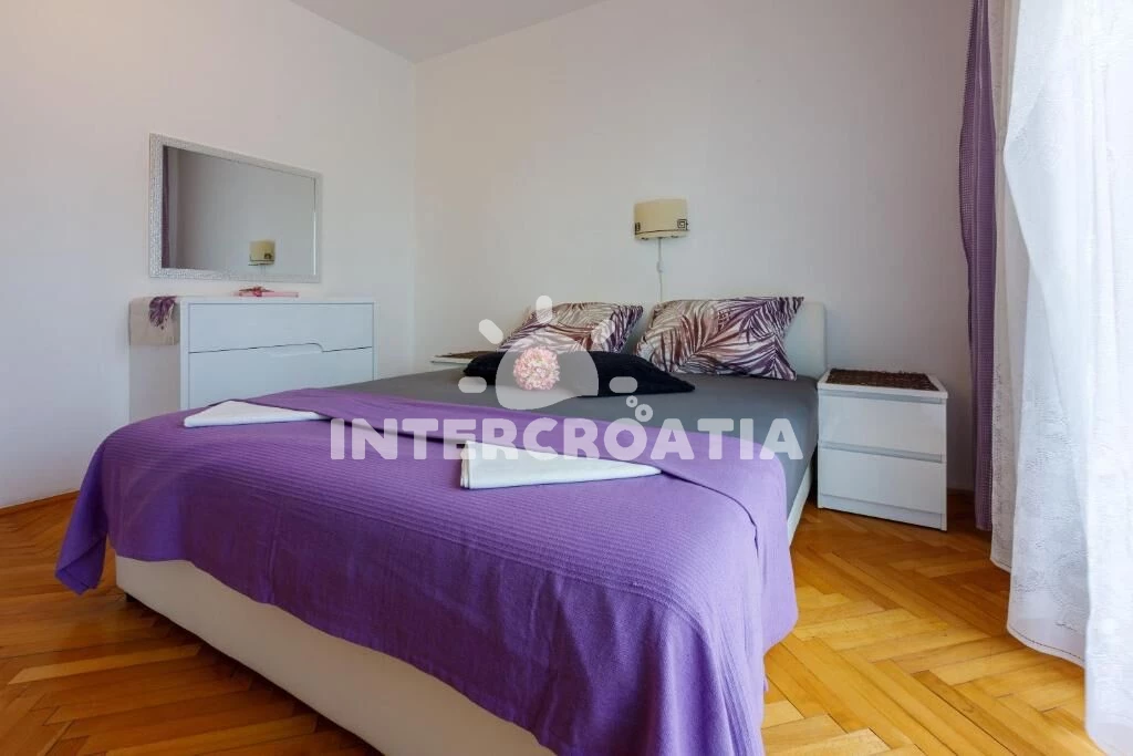 Apartmán (100 m2) s vlastním balkonem a výhledem na moře, se nachází v 2. patře domu a je vhodný pro 6 až 7 osob. Kuchyň s jídelním stolem pro 6 osob, vstupem na balkon, kuchyňskou linkou s varnou deskou, digestoří, troubou, rychlovarnou konvicí, kávovarem, toustovačem, myčkou na nádobí, nádobím a lednicí s mrazákem. Obývací pokoj s rohovou pohovkou (rozložitelná na extra lůžko pro 1 osobu), televizí se satelitním programem a vstupem na balkon. Chodba se vstupy do 3 ložnic a s klimatizací. Všechny tři ložnice jsou vybaveny vždy s dvoulůžkem. Dvě koupelny se sprchovým koutem, umyvadlem a wc. Třetí koupelna s vanou, umyvadlem, pračkou, fénem a wc. Dále samostatné wc s umyvadlem. Hostům je k dispozici parkování u objektu zdarma.