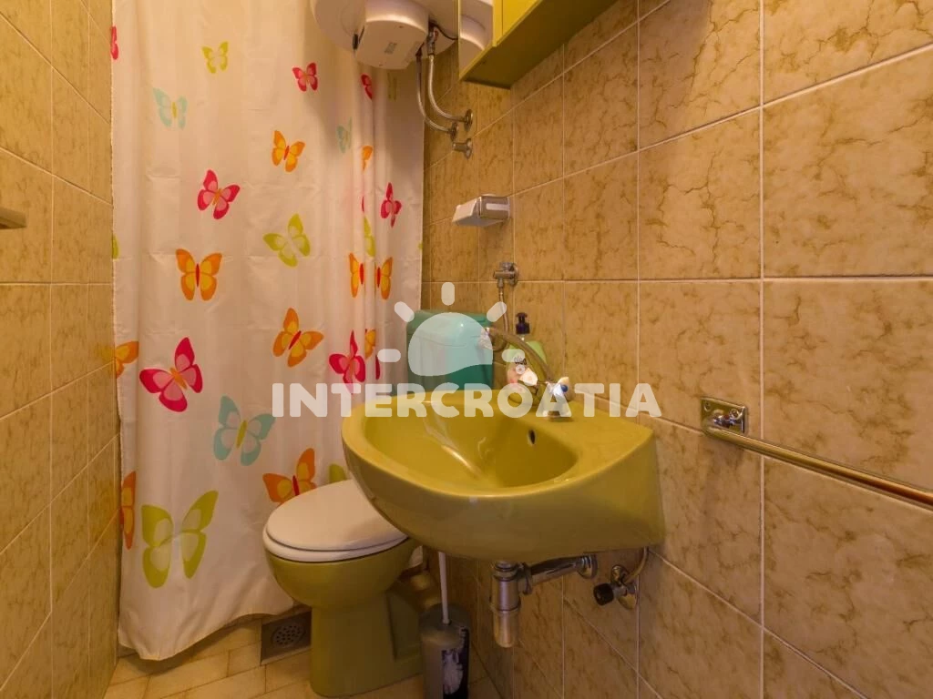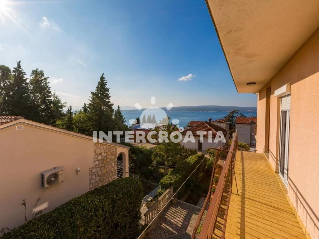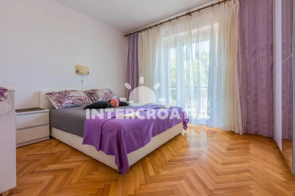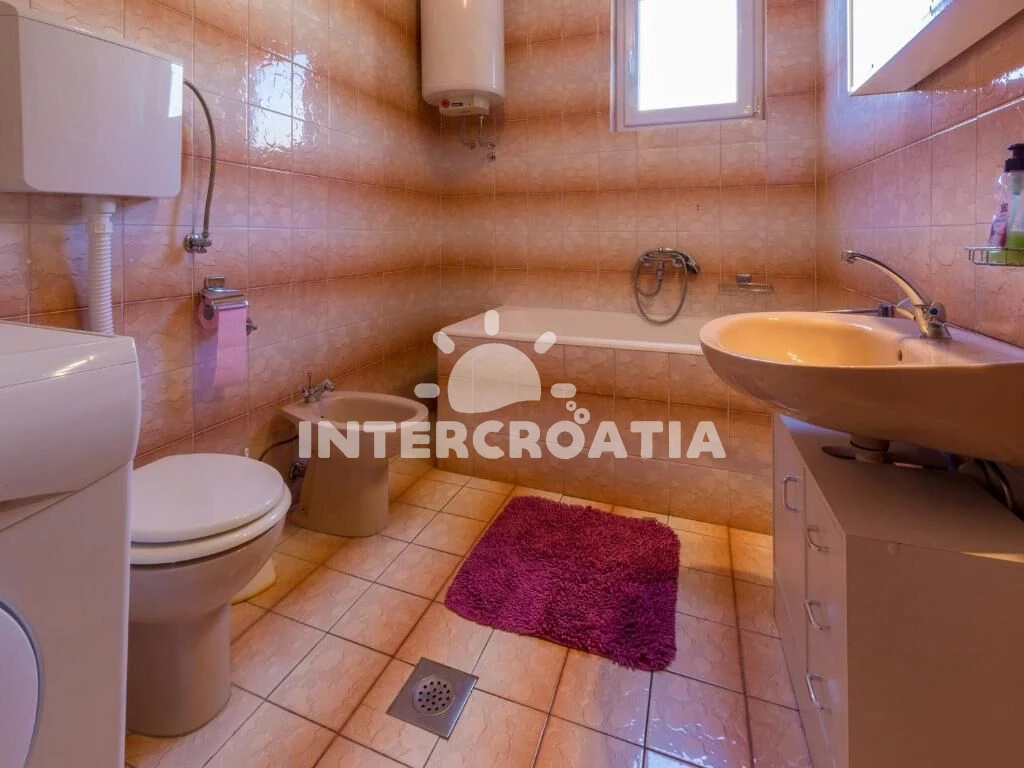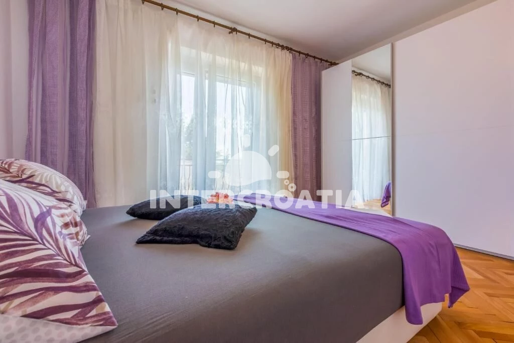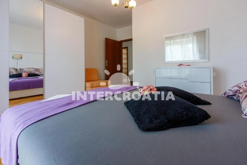 Apartmán (100 m2) s vlastním balkonem a výhledem na moře, se nachází v 2. patře domu a je vhodný pro 6 až 7 osob. Kuchyň s jídelním stolem pro 6 osob, vstupem na balkon, kuchyňskou linkou s varnou deskou, digestoří, troubou, rychlovarnou konvicí, kávovarem, toustovačem, myčkou na nádobí, nádobím a lednicí s mrazákem. Obývací pokoj s rohovou pohovkou (rozložitelná na extra lůžko pro 1 osobu), televizí se satelitním programem a vstupem na balkon. Chodba se vstupy do 3 ložnic a s klimatizací. Všechny tři ložnice jsou vybaveny vždy s dvoulůžkem. Dvě koupelny se sprchovým koutem, umyvadlem a wc. Třetí koupelna s vanou, umyvadlem, pračkou, fénem a wc. Dále samostatné wc s umyvadlem. Hostům je k dispozici parkování u objektu zdarma.
