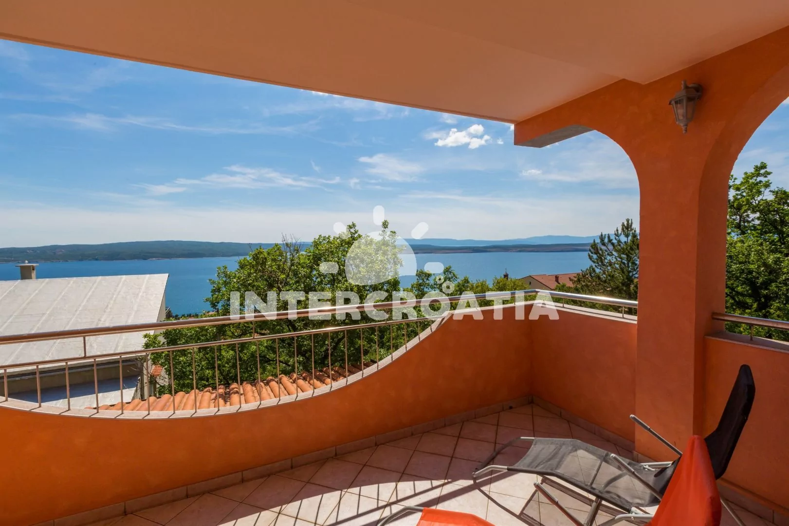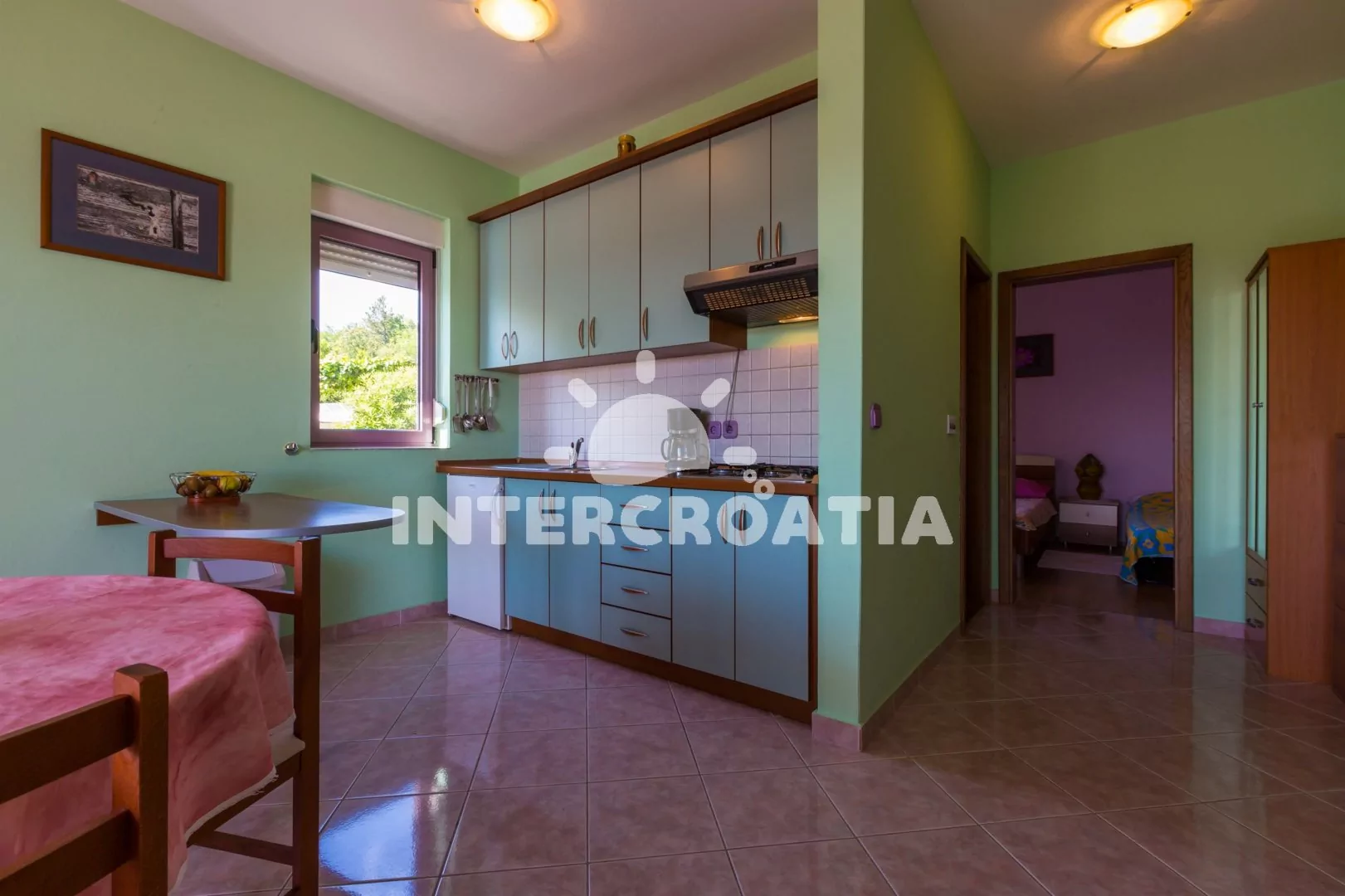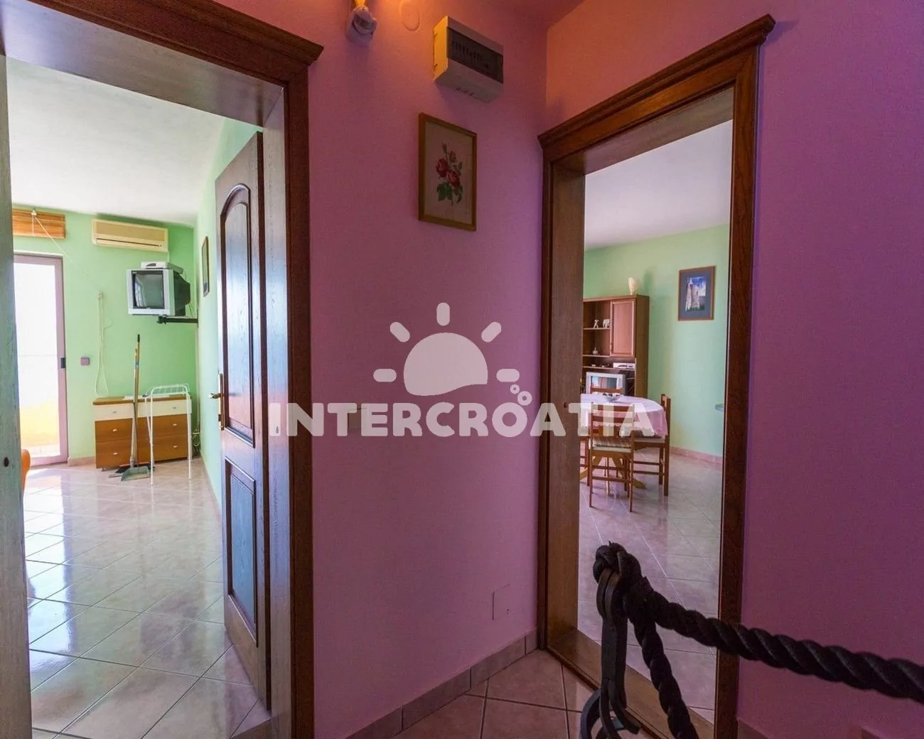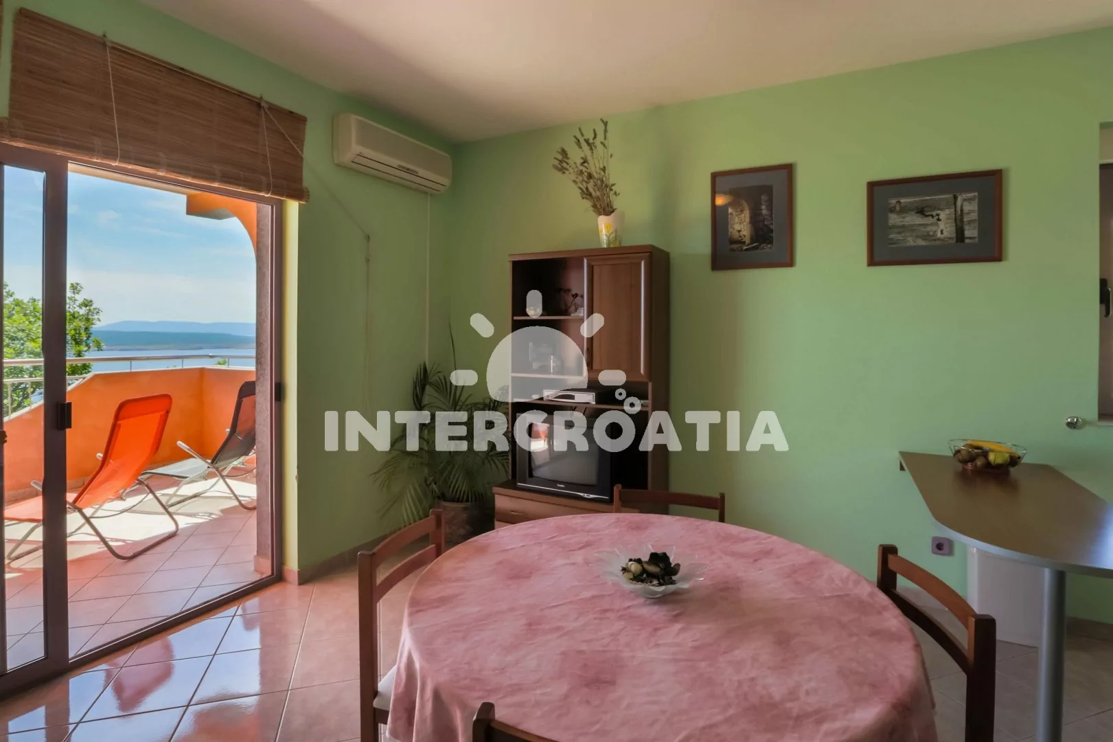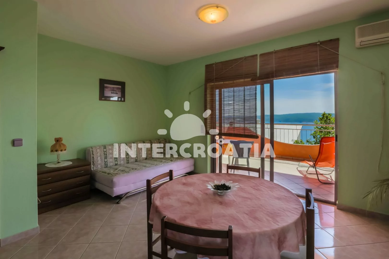 Apartmán (55 m2) s balkonem a výhledem na moře, se nachází v 1. patře vily. Apartmán je vhodný pro 2 až 4 osoby. Obývací pokoj je spojený s kuchyní. Kuchyňská linka je vybavena varnou deskou, digestoří, mikrovlnnou troubou, myčkou na nádobí, rychlovarnou konvicí, kávovarem, toustovačem, nádobím a lednicí s mrazákem. Obývací pokoj s jídelním stolem pro 4 osoby, pohovkou (rozložitelná na extra lůžko pro 1 osobu), televizí se satelitním programem, radiem, DVD přehrávačem, klimatizací a vstupem na balkon. Ložnice s dvoulůžkem a jedním jednolůžkem. Koupelna se sprchovým koutem, umyvadlem a wc. Hostům je k dispozici parkování u objektu zdarma.