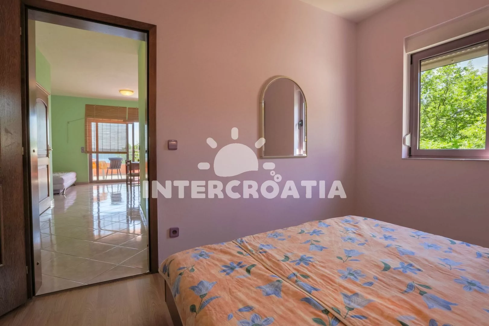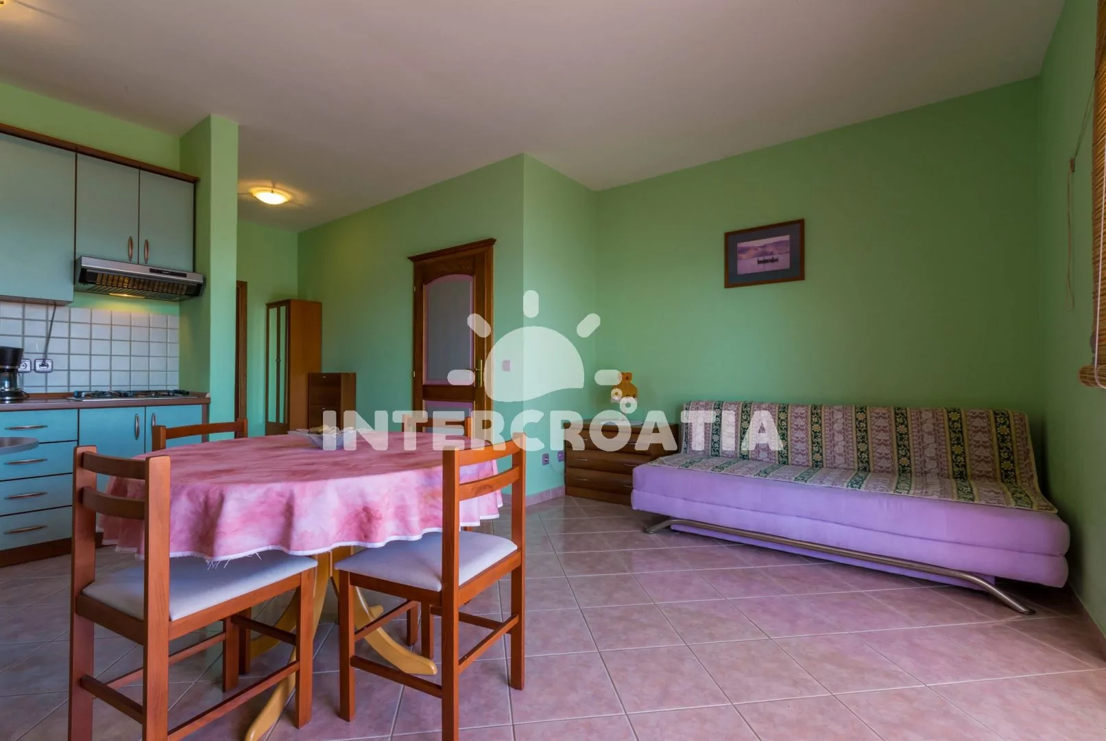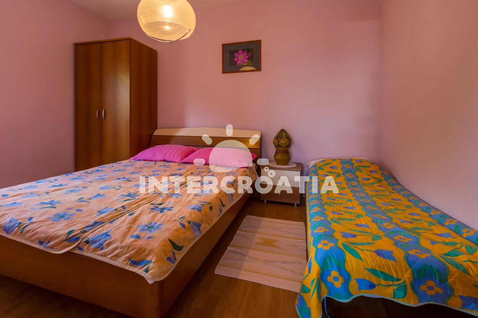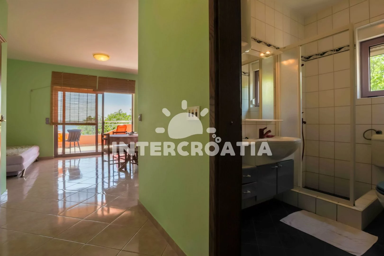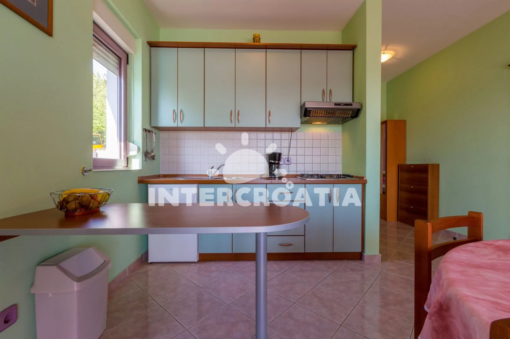 Apartmán (55 m2) s balkonem a výhledem na moře, se nachází v 1. patře vily. Apartmán je vhodný pro 2 až 4 osoby. Obývací pokoj je spojený s kuchyní. Kuchyňská linka je vybavena varnou deskou, digestoří, mikrovlnnou troubou, myčkou na nádobí, rychlovarnou konvicí, kávovarem, toustovačem, nádobím a lednicí s mrazákem. Obývací pokoj s jídelním stolem pro 4 osoby, pohovkou (rozložitelná na extra lůžko pro 1 osobu), televizí se satelitním programem, radiem, DVD přehrávačem, klimatizací a vstupem na balkon. Ložnice s dvoulůžkem a jedním jednolůžkem. Koupelna se sprchovým koutem, umyvadlem a wc. Hostům je k dispozici parkování u objektu zdarma.