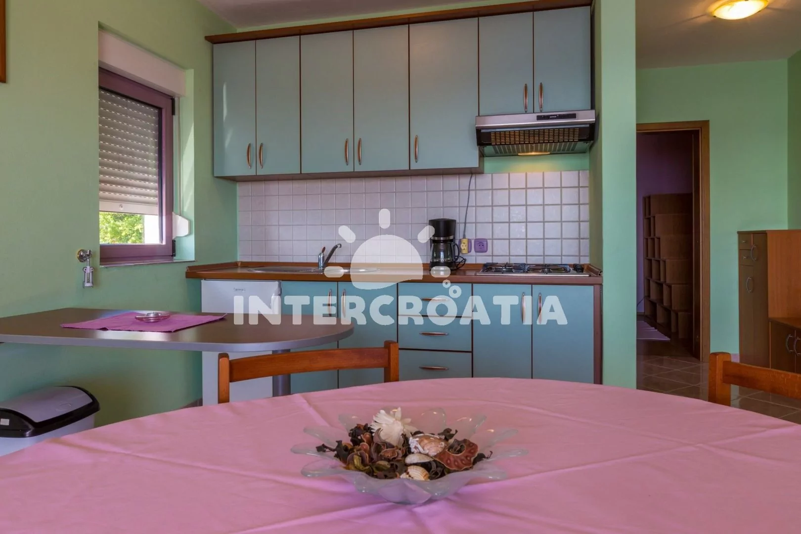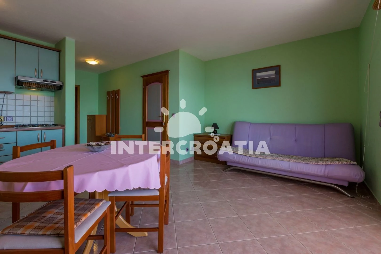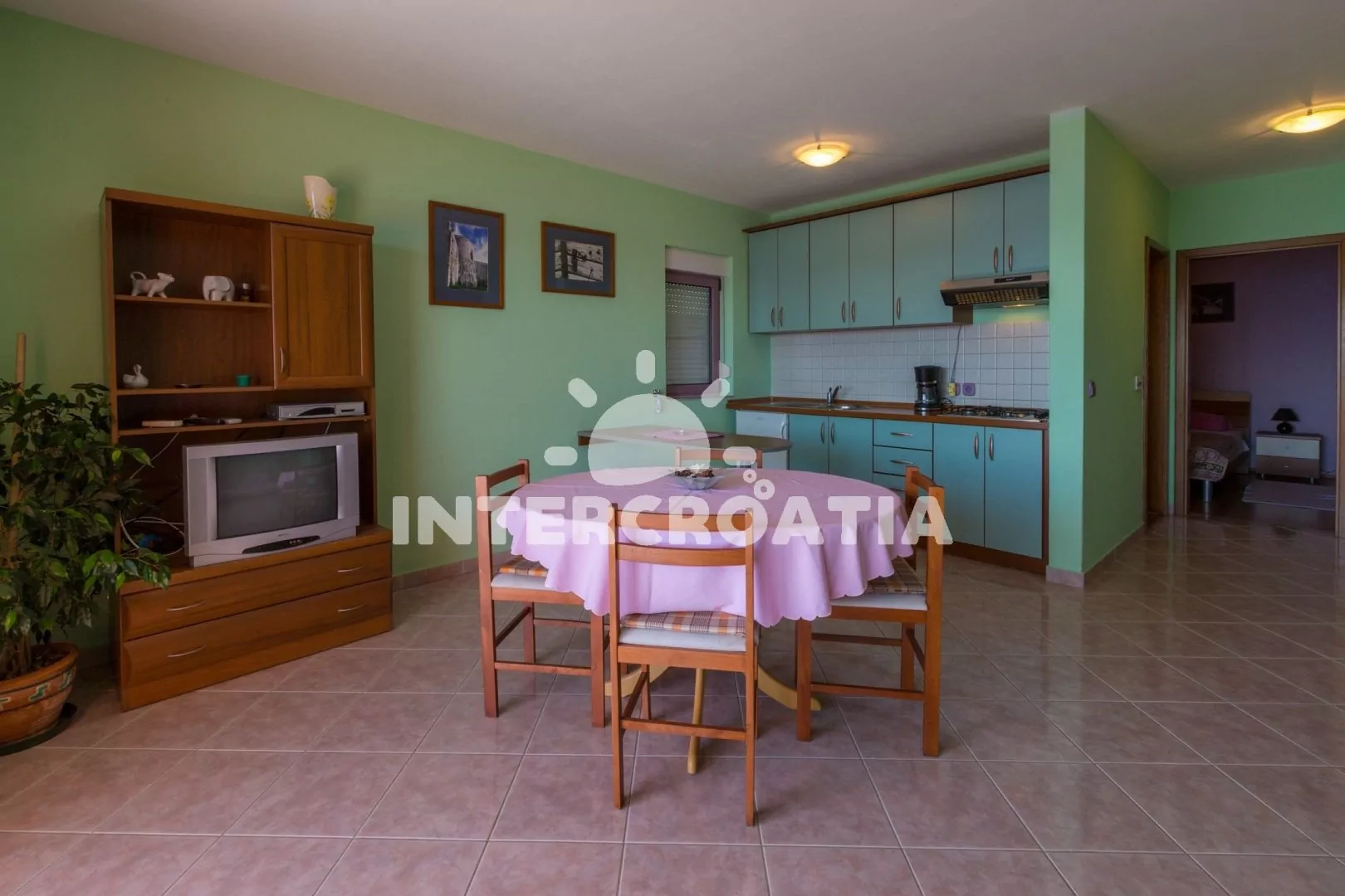 Apartmán (55 m2) s balkonem a výhledem na moře, se nachází v 2. patře vily. Apartmán je vhodný pro 3 až 4 osoby. Obývací pokoj je spojený s kuchyní. Kuchyňská linka je vybavena varnou deskou, digestoří, mikrovlnnou troubou, myčkou na nádobí, rychlovarnou konvicí, kávovarem, toustovačem, nádobím a lednicí s mrazákem. Obývací pokoj s jídelním stolem pro 4 osoby, pohovkou (rozložitelná na extra lůžko pro 1 osobu), televizí se satelitním programem, radiem, DVD přehrávačem, klimatizací a vstupem na balkon. Ložnice s dvoulůžkem a jedním jednolůžkem (vyvýšené lůžko). Koupelna se sprchovým koutem, umyvadlem a wc. Hostům je k dispozici parkování u objektu zdarma.
