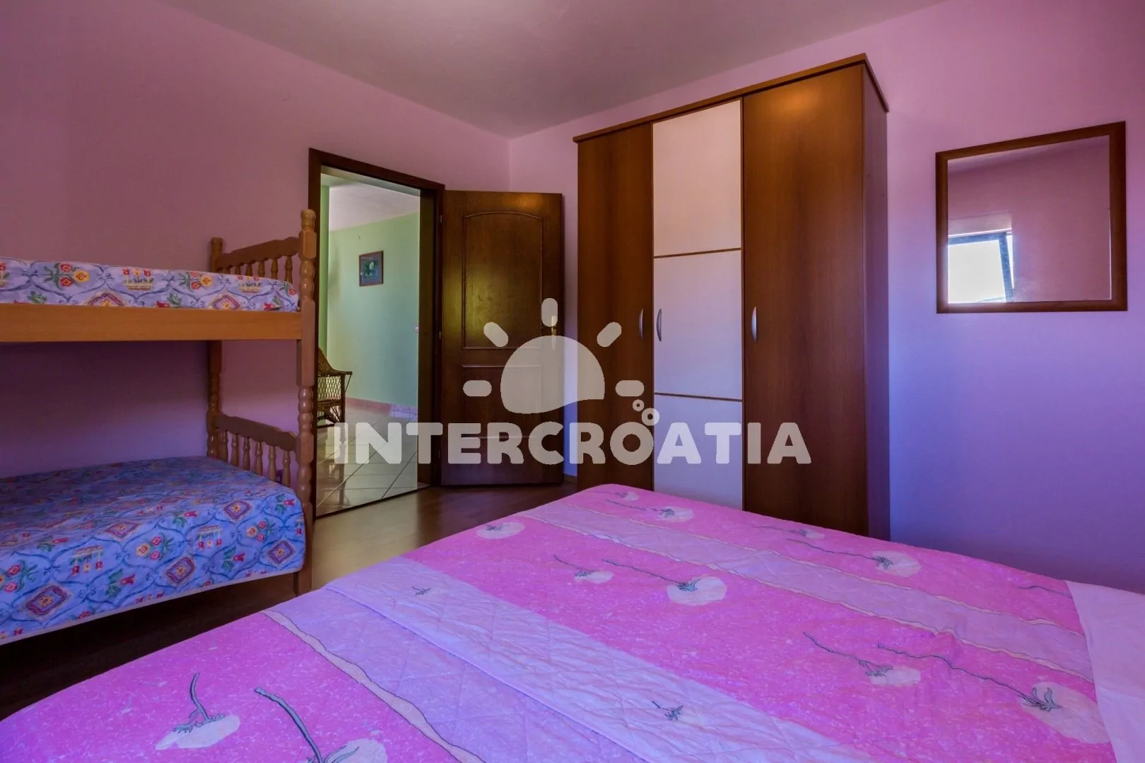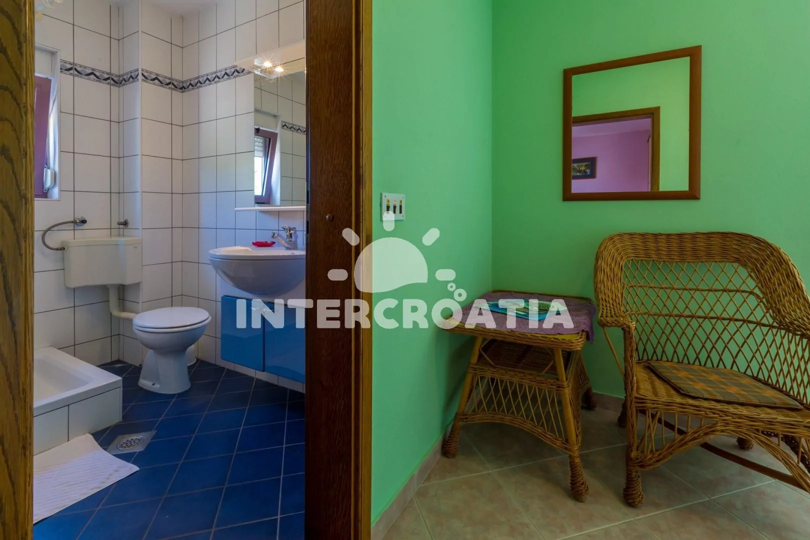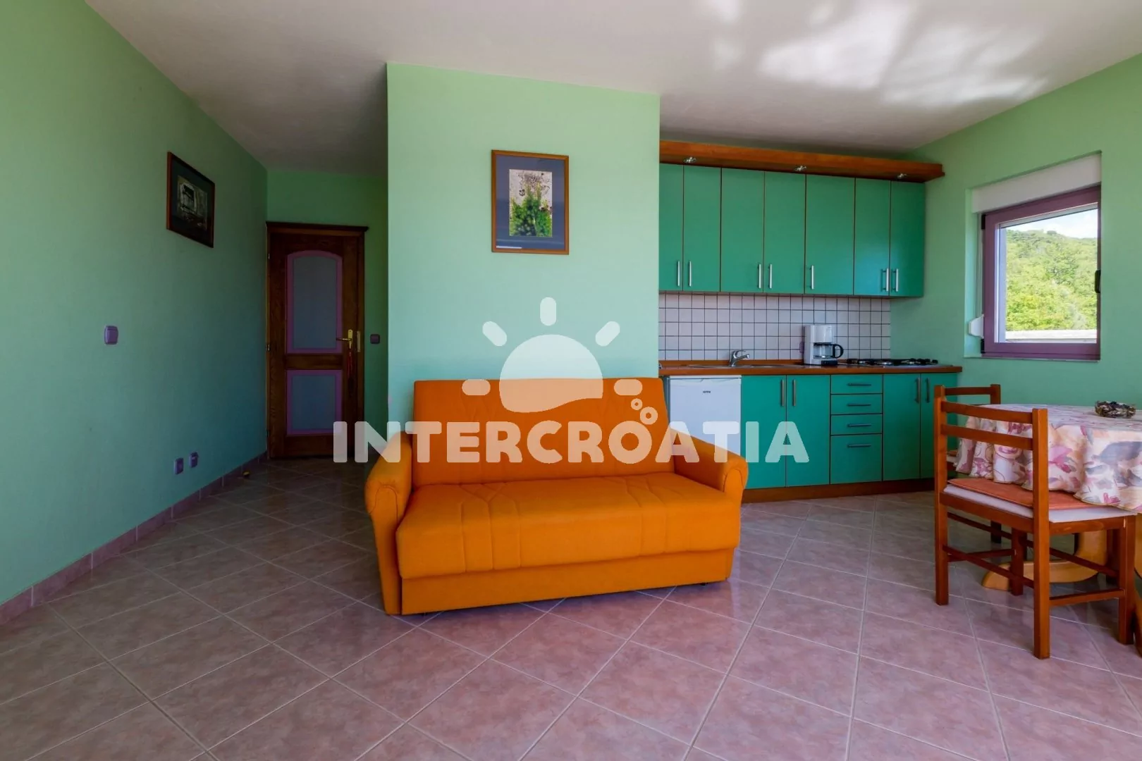 Apartmán (55 m2) s balkonem a výhledem na moře, se nachází v 2. patře vily. Apartmán je vhodný pro 2 až 4 osoby. Obývací pokoj je spojený s kuchyní. Kuchyňská linka je vybavena varnou deskou, digestoří, mikrovlnnou troubou, myčkou na nádobí, rychlovarnou konvicí, kávovarem, toustovačem, nádobím a lednicí s mrazákem. Obývací pokoj s jídelním stolem pro 4 osoby, pohovkou, televizí se satelitním programem, radiem, DVD přehrávačem, klimatizací a vstupem na balkon. Ložnice s dvoulůžkem a patrovou postelí (lůžka pro 2 osoby). Koupelna se sprchovým koutem, umyvadlem a wc. Hostům je k dispozici parkování u objektu zdarma.