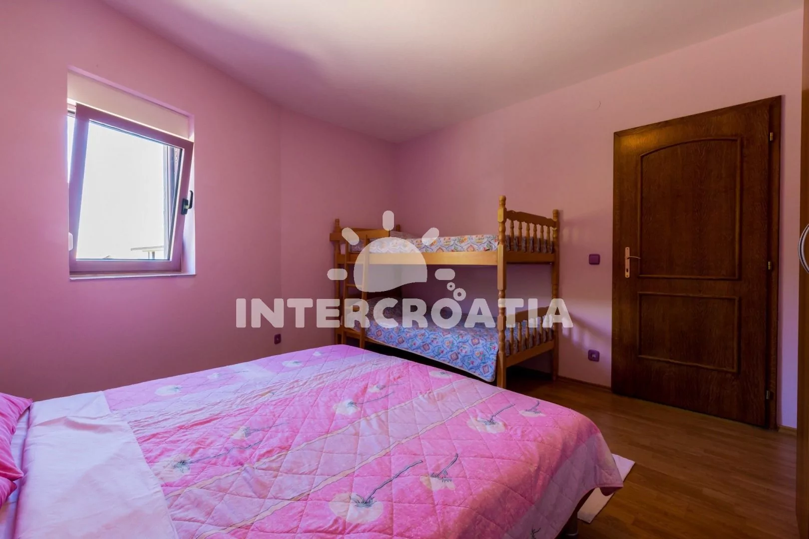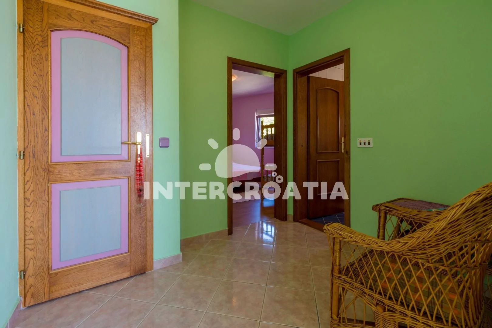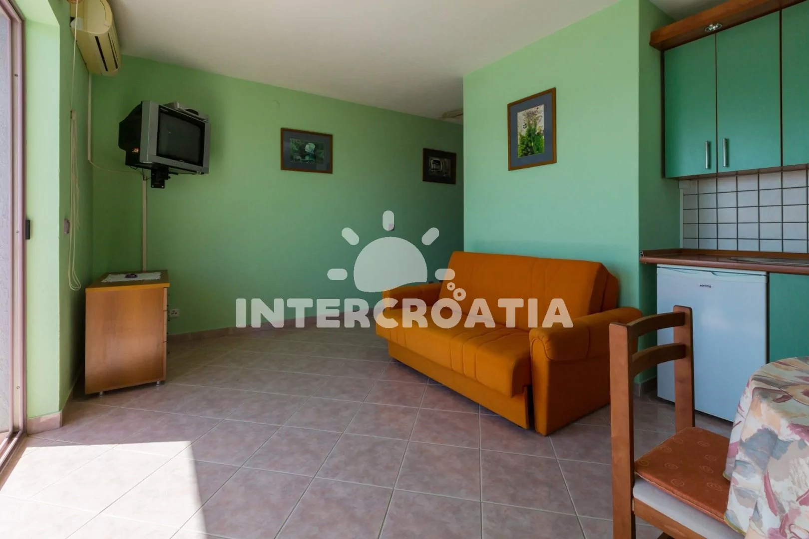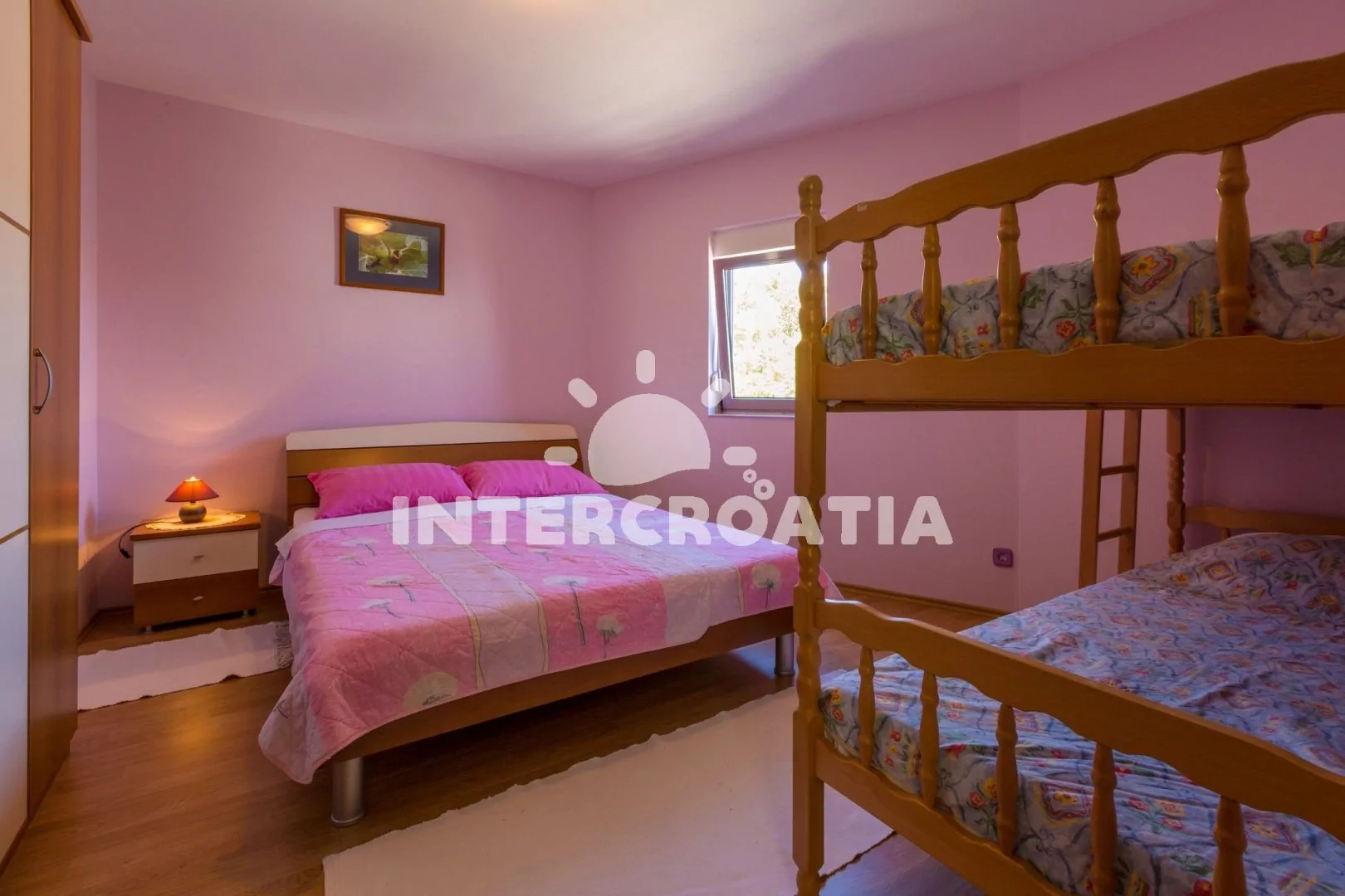 Apartmán (55 m2) s balkonem a výhledem na moře, se nachází v 2. patře vily. Apartmán je vhodný pro 2 až 4 osoby. Obývací pokoj je spojený s kuchyní. Kuchyňská linka je vybavena varnou deskou, digestoří, mikrovlnnou troubou, myčkou na nádobí, rychlovarnou konvicí, kávovarem, toustovačem, nádobím a lednicí s mrazákem. Obývací pokoj s jídelním stolem pro 4 osoby, pohovkou, televizí se satelitním programem, radiem, DVD přehrávačem, klimatizací a vstupem na balkon. Ložnice s dvoulůžkem a patrovou postelí (lůžka pro 2 osoby). Koupelna se sprchovým koutem, umyvadlem a wc. Hostům je k dispozici parkování u objektu zdarma.