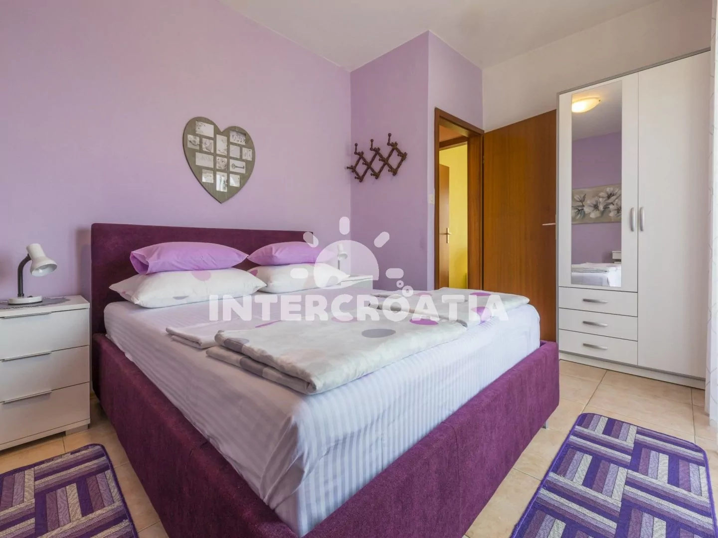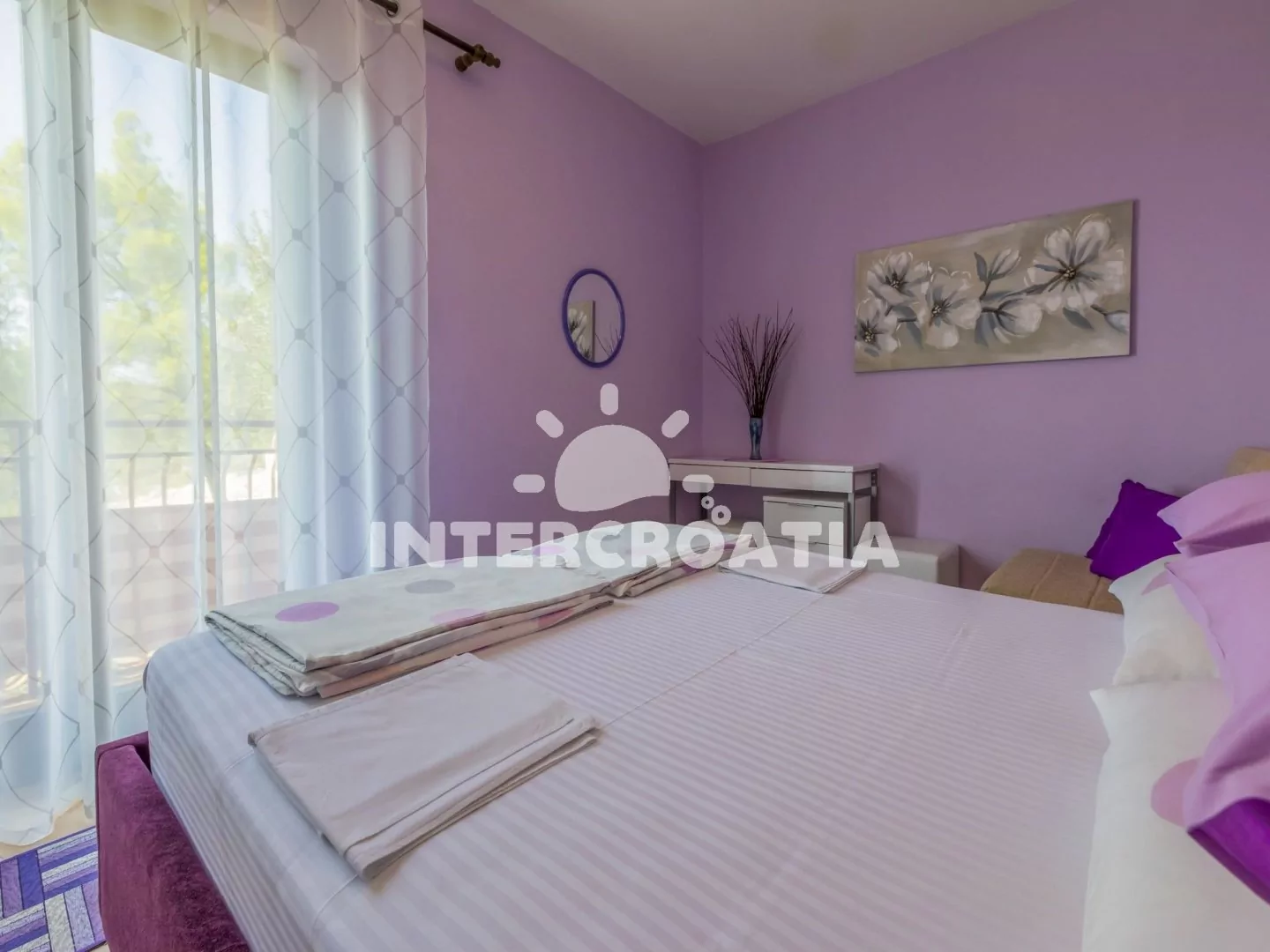 Apartmán (90 m2) s balkonem a výhledem na moře je vhodný pro 6 až 7 osob. Obývací pokoj je spojený s kuchyní. Kuchyňská linka je vybavena varnou deskou, digestoří, vestavěnou troubou, rychlovarnou konvicí, toustovačem, kávovarem, nádobím a lednicí s mrazákem. Obývací pokoj s jídelním stolem pro 6 osob, rohovou pohovkou, televizí se satelitním programem, klimatizací a vstupem na balkon. První ložnice s dvoulůžkem a vstupem na balkon. Druhá ložnice s dvoulůžkem a přistýlkou (extra lůžko pro 1 osobu). Třetí ložnice s dvoulůžkem. První koupelna se sprchovým koutem, umyvadlem a wc. Druhá koupelna s vanou, sprchovou zástěnou, umyvadlem, pračkou, bidetem a wc. Hostům je k dispozici parkování u objektu zdarma.