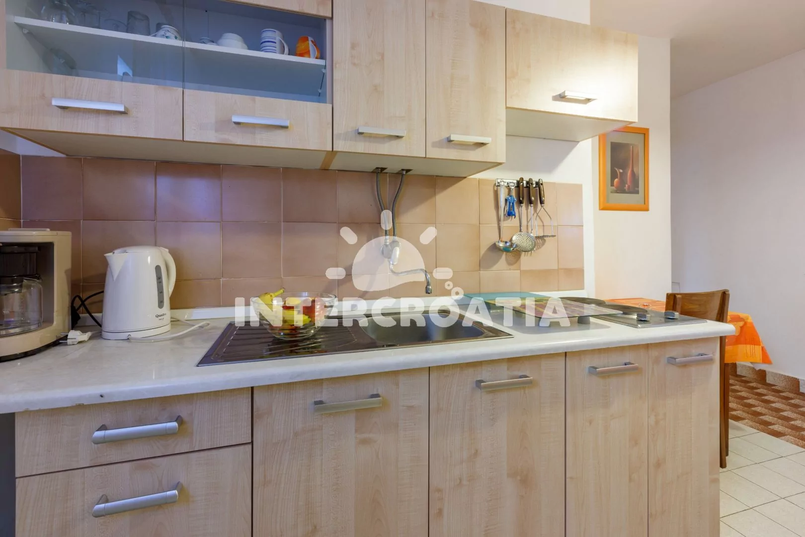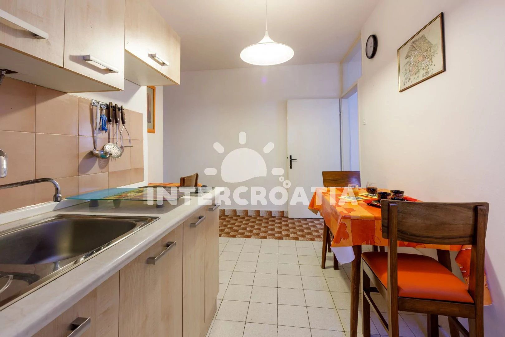 Vzdálenosti: Moře a oblázková pláž 300 m, centrum, diskotéka, půjčovna kol, muzeum, pošta, banka, ambulance, lékárna 3 km, restaurace, bar, směnárna, supermarket 150 m, minigolf, čerpací stanice 600 m, potápění 1,8 km, letiště 19 km.