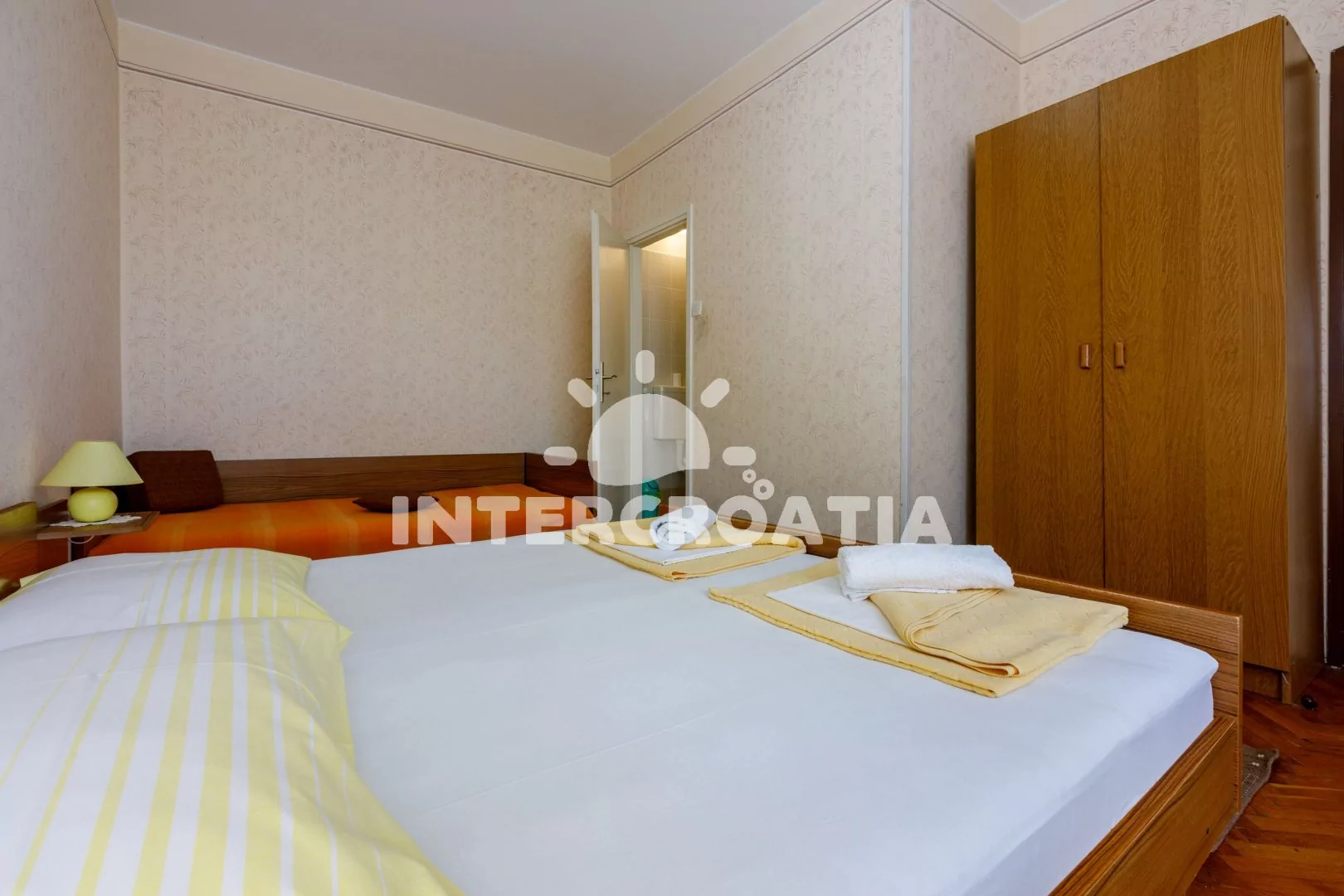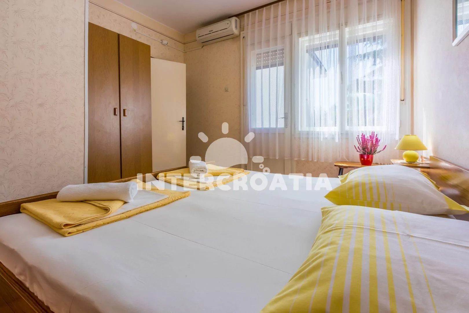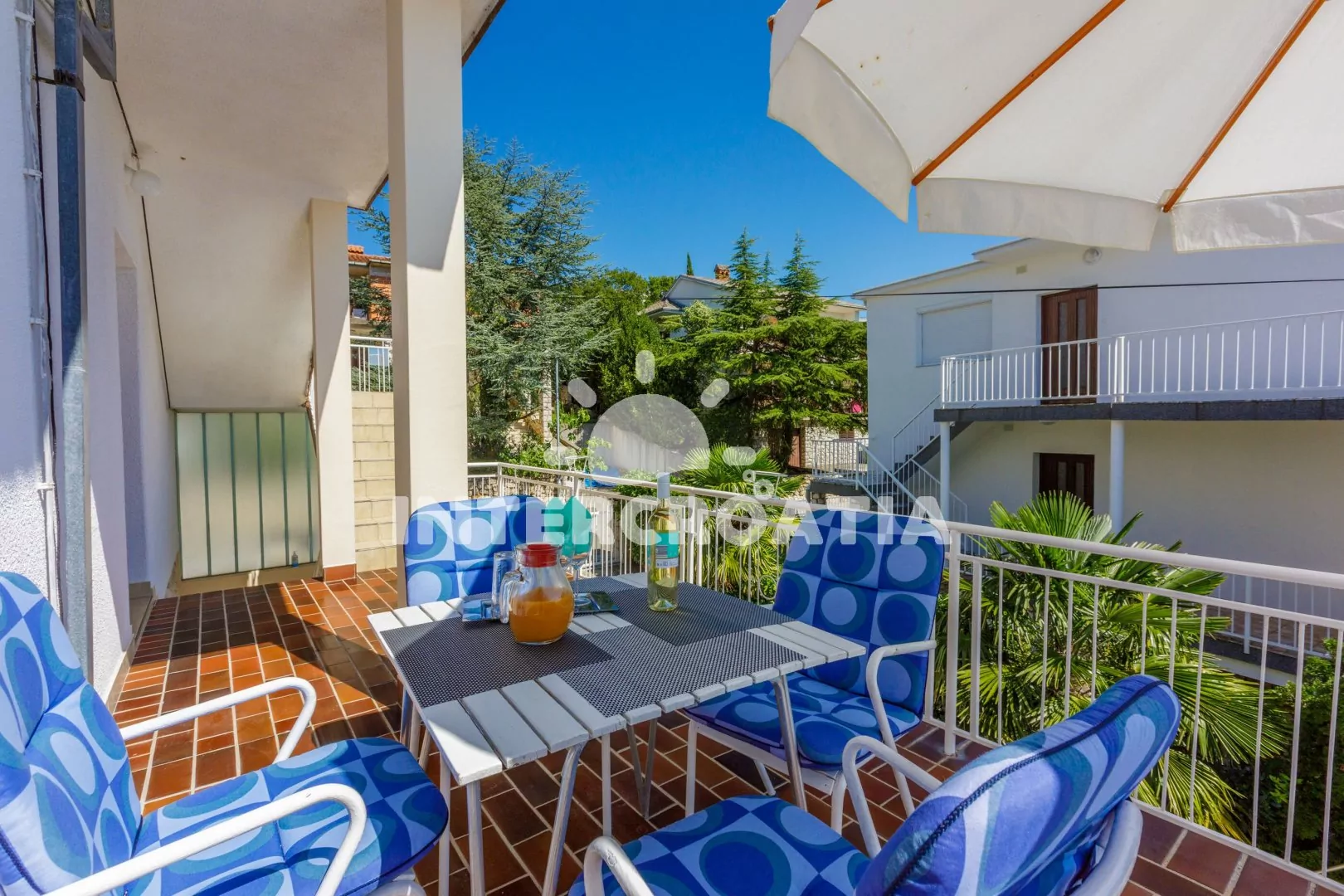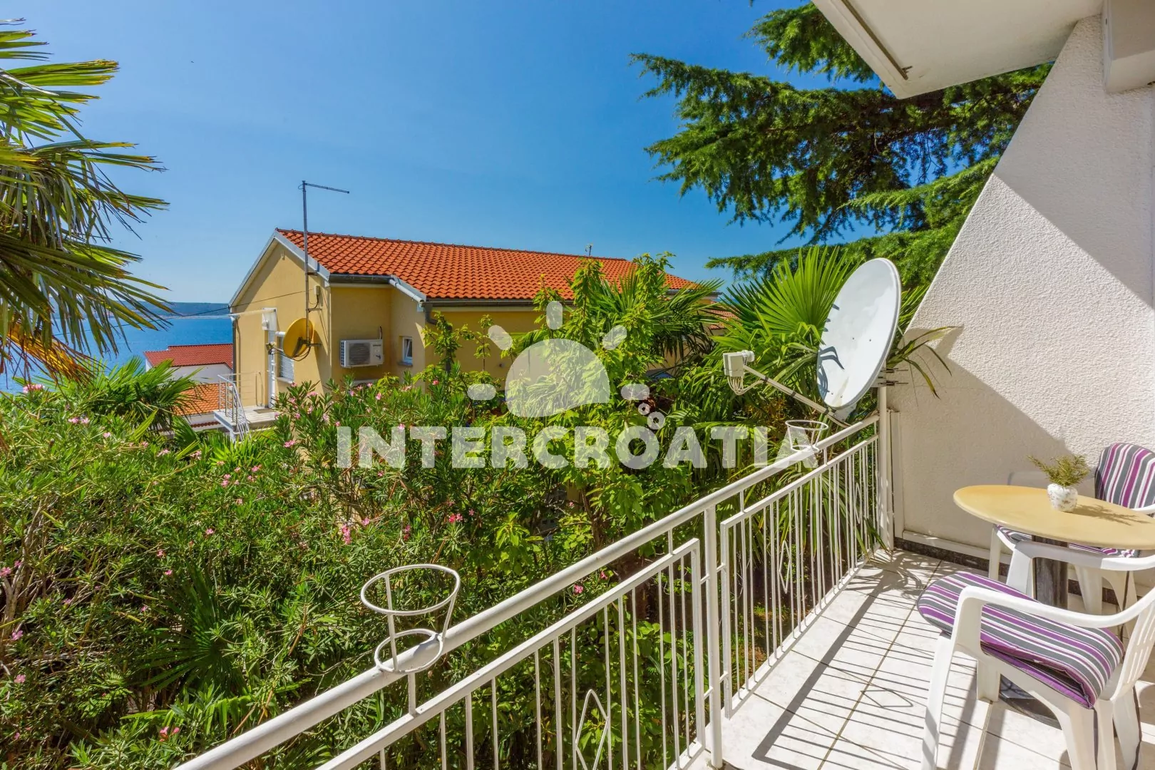 Apartmán (65 m2) s balkonem, terasou a výhledem na moře se nachází v 1. patře domu a je vhodný pro 4 až 6 osob. Kuchyň s jídelním stolem pro 6 osob, televizí se satelitním programem, kuchyňskou linkou s dvouplotýnkovým vařičem, rychlovarnou konvicí, kávovarem, nádobím a lednicí s mrazákem. První ložnice s dvoulůžkem, jedním jednolůžkem a vstupem na terasu. Druhá ložnice s dvoulůžkem, jedním jednolůžkem a vstupem na balkon. Dvě koupelny se sprchovým koutem, umyvadlem a wc. Hostům je k dispozici parkování u objektu zdarma.