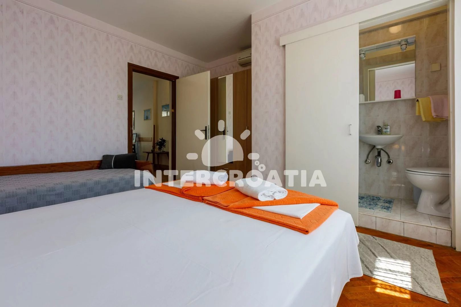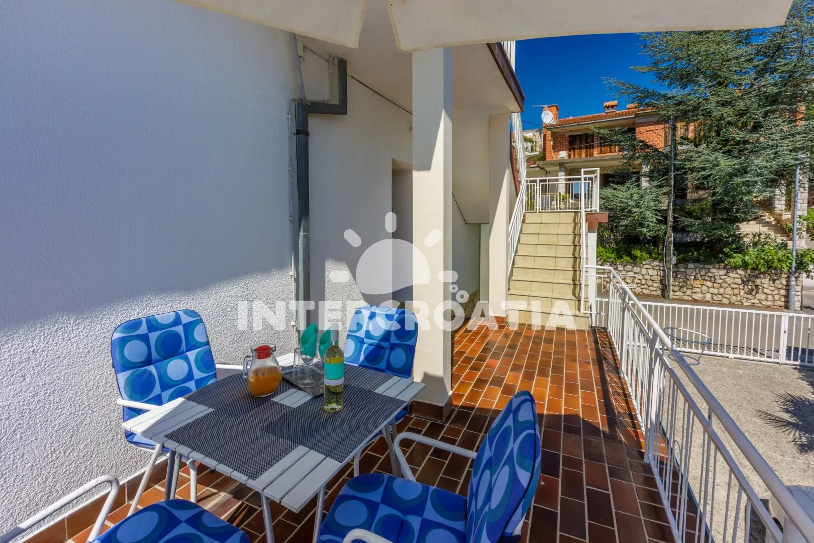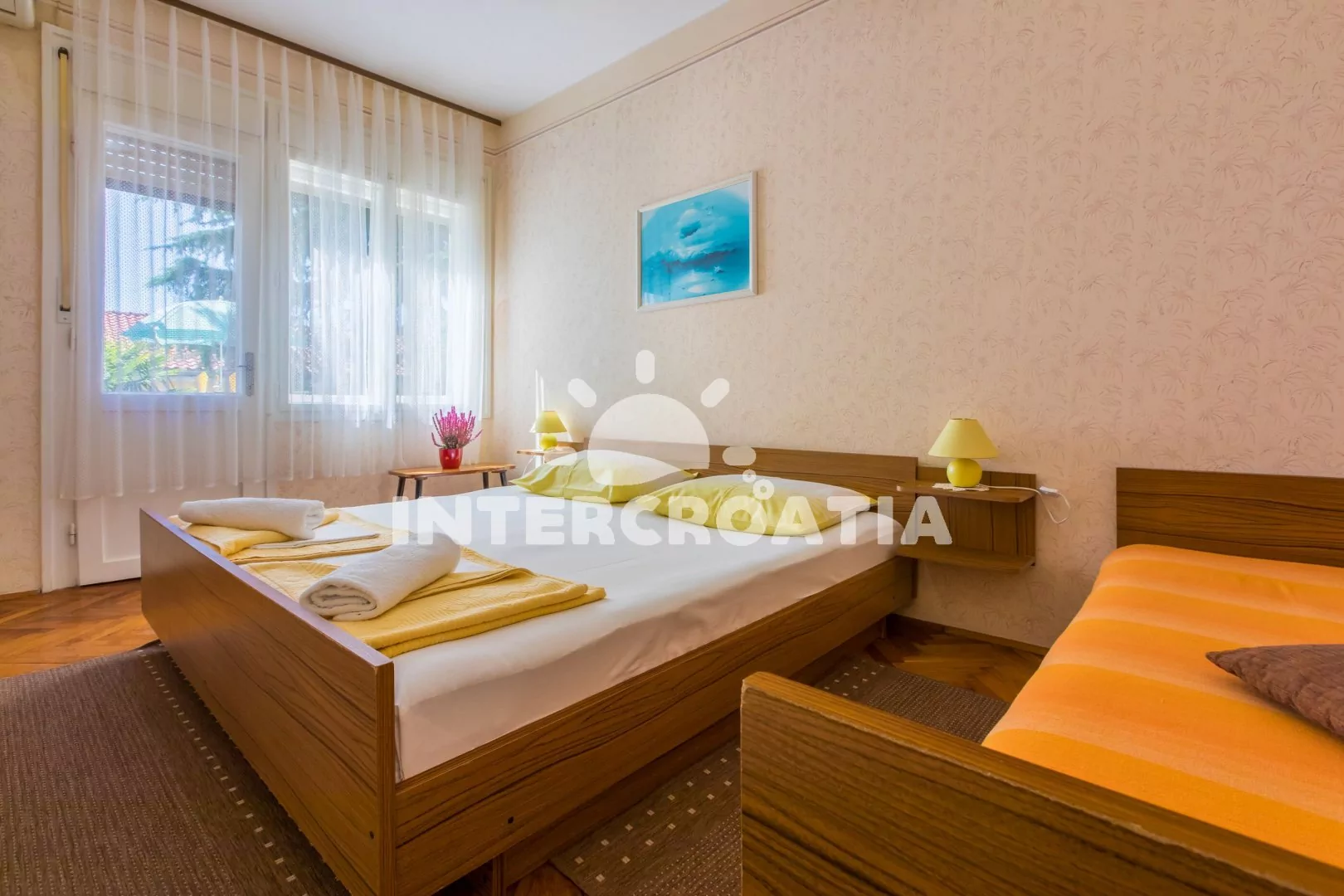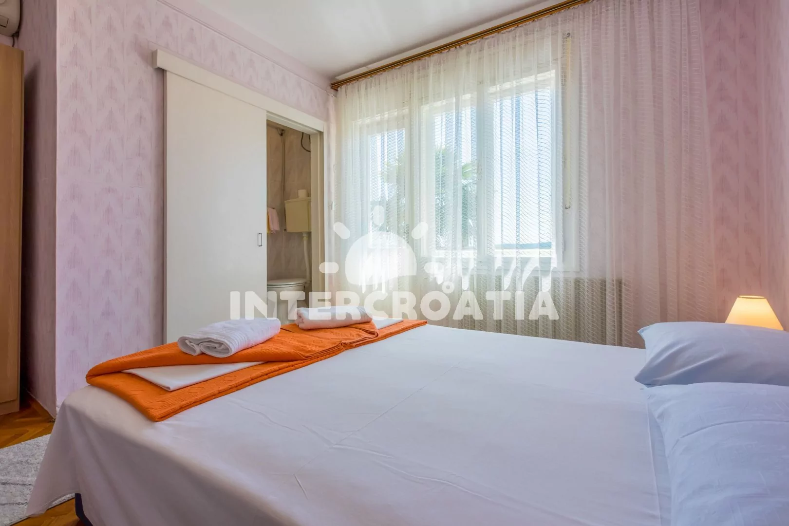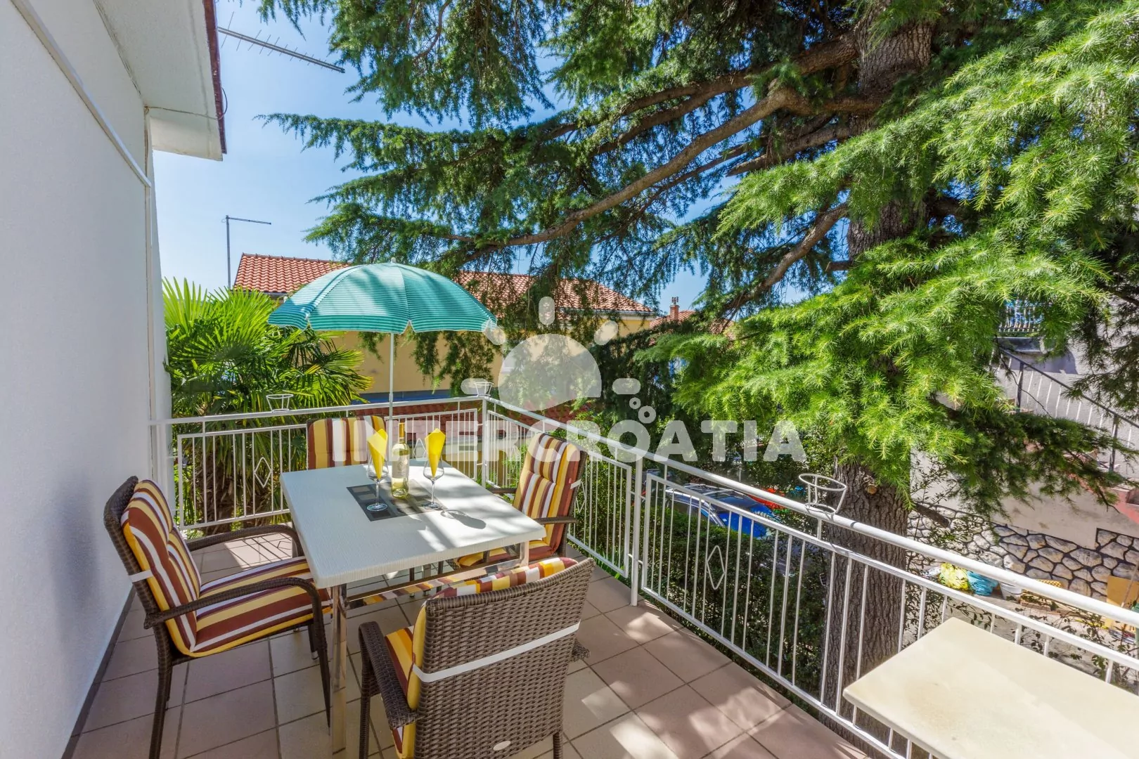 Apartmán (65 m2) s balkonem, terasou a výhledem na moře se nachází v 1. patře domu a je vhodný pro 4 až 6 osob. Kuchyň s jídelním stolem pro 6 osob, televizí se satelitním programem, kuchyňskou linkou s dvouplotýnkovým vařičem, rychlovarnou konvicí, kávovarem, nádobím a lednicí s mrazákem. První ložnice s dvoulůžkem, jedním jednolůžkem a vstupem na terasu. Druhá ložnice s dvoulůžkem, jedním jednolůžkem a vstupem na balkon. Dvě koupelny se sprchovým koutem, umyvadlem a wc. Hostům je k dispozici parkování u objektu zdarma.