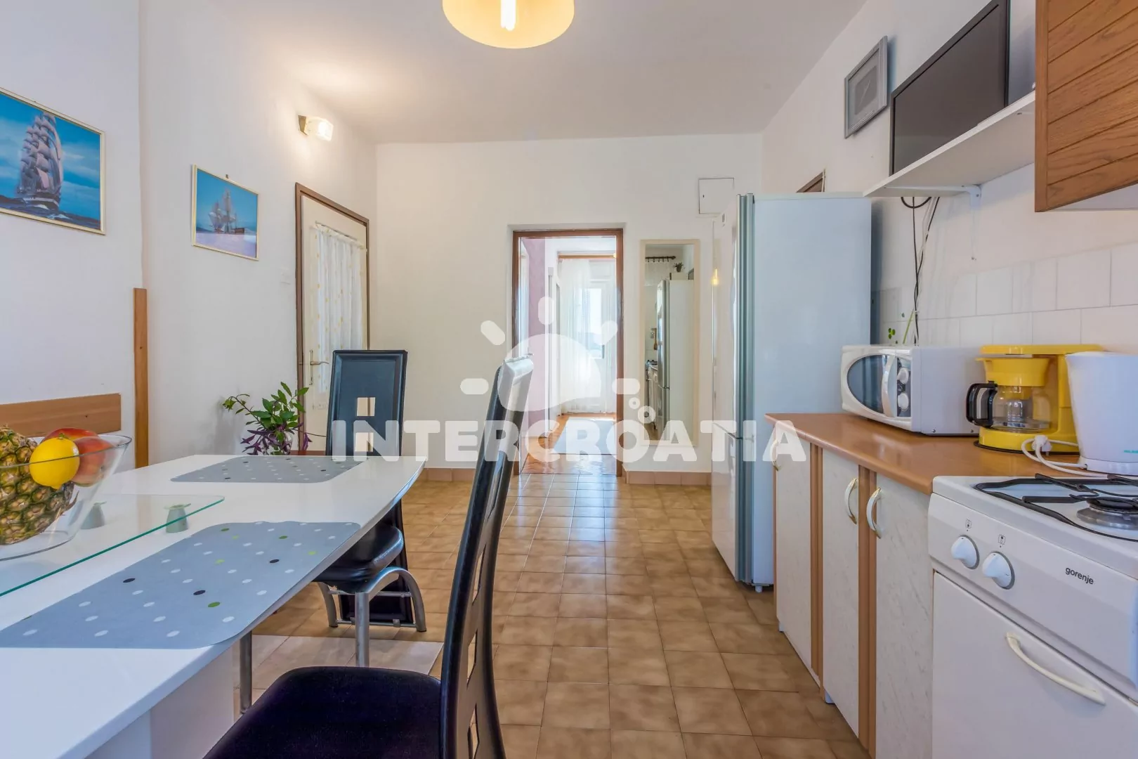 Apartmán (65 m2) s balkonem, terasou a výhledem na moře se nachází v 1. patře domu a je vhodný pro 4 až 6 osob. Kuchyň s jídelním stolem pro 6 osob, televizí se satelitním programem, kuchyňskou…
