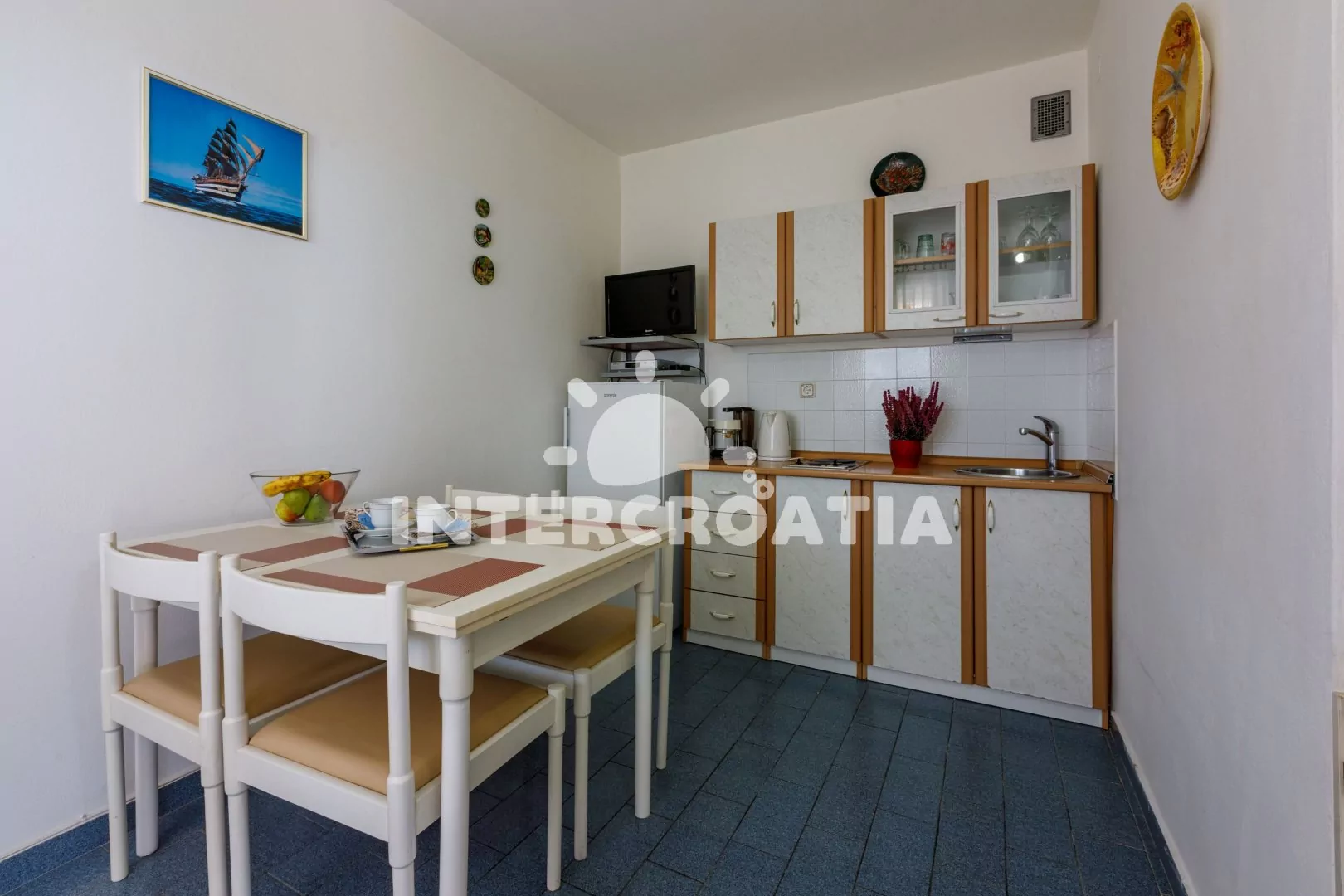 Apartmán (65 m2) s vlastní terasou a výhledem na moře se nachází v 2. patře domu a je vhodný pro 4 až 6 osob. Kuchyň s jídelním stolem pro 5 osob, televizí se satelitním programem, kuchyňskou linkou…
