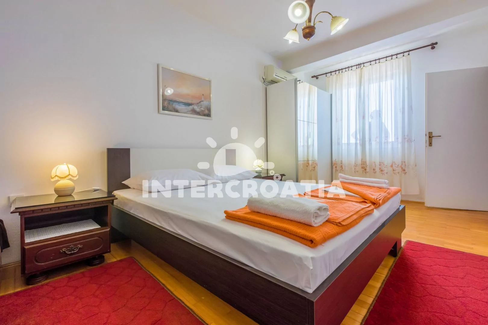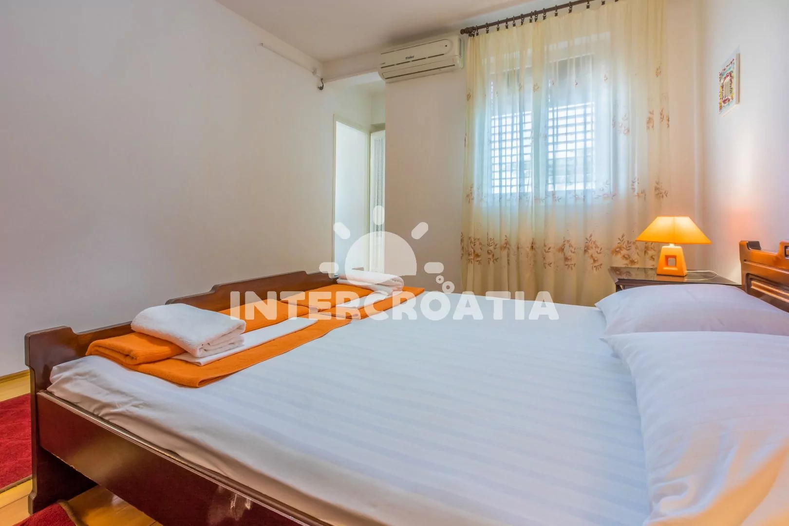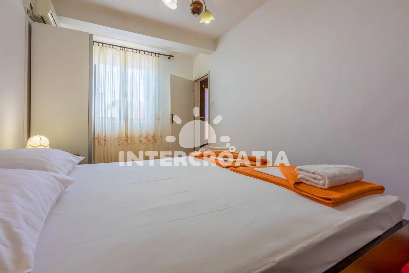 Apartmán (65 m2) s vlastní terasou a výhledem na moře se nachází v 2. patře domu a je vhodný pro 4 až 6 osob. Kuchyň s jídelním stolem pro 5 osob, televizí se satelitním programem, kuchyňskou linkou s dvouplotýnkovým vařičem, rychlovarnou konvicí, kávovarem, nádobím a lednicí s mrazákem. První ložnice s dvoulůžkem, jedním jednolůžkem a klimatizací. Druhá ložnice rovněž s dvoulůžkem, jedním jednolůžkem a klimatizací. Dvě koupelny se sprchovým koutem, umyvadlem a wc. Hostům je k dispozici parkování u objektu zdarma.