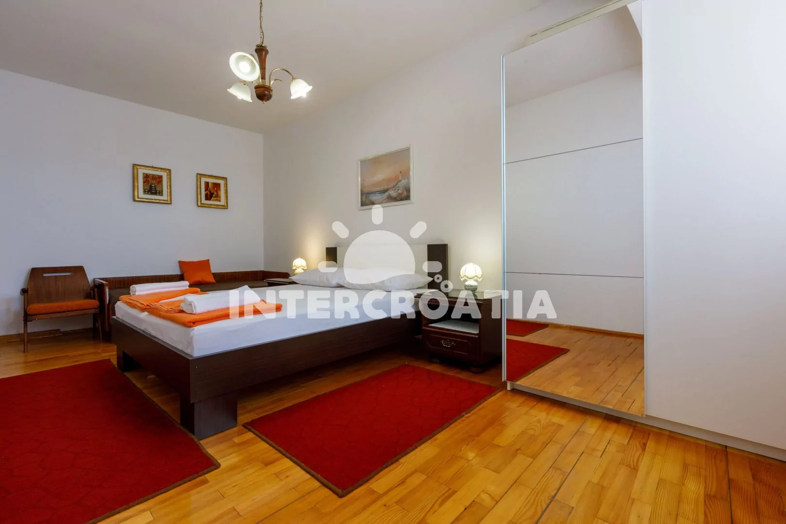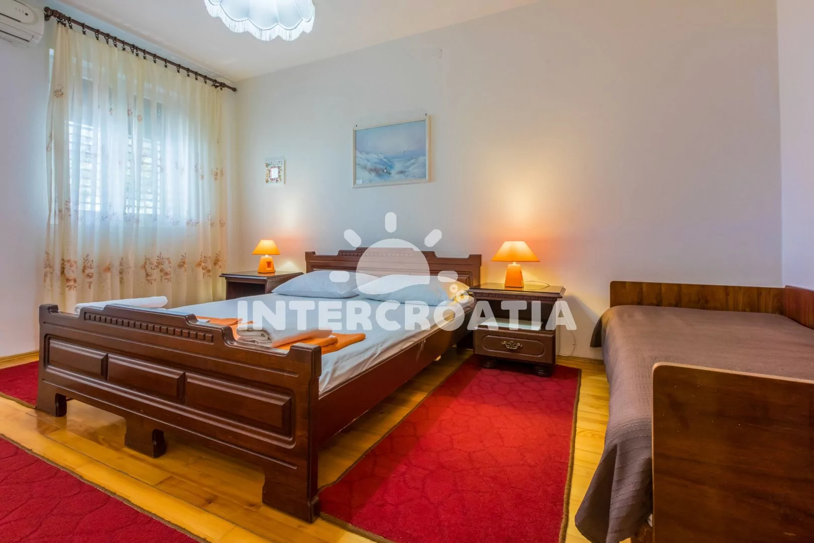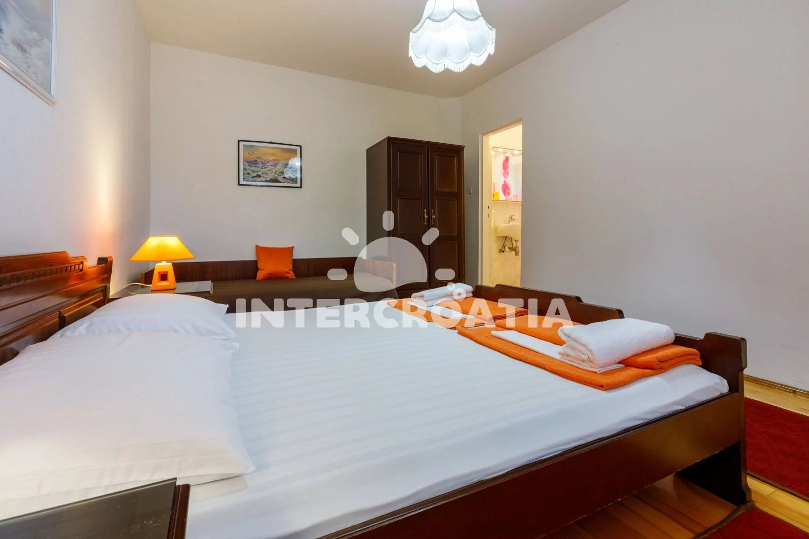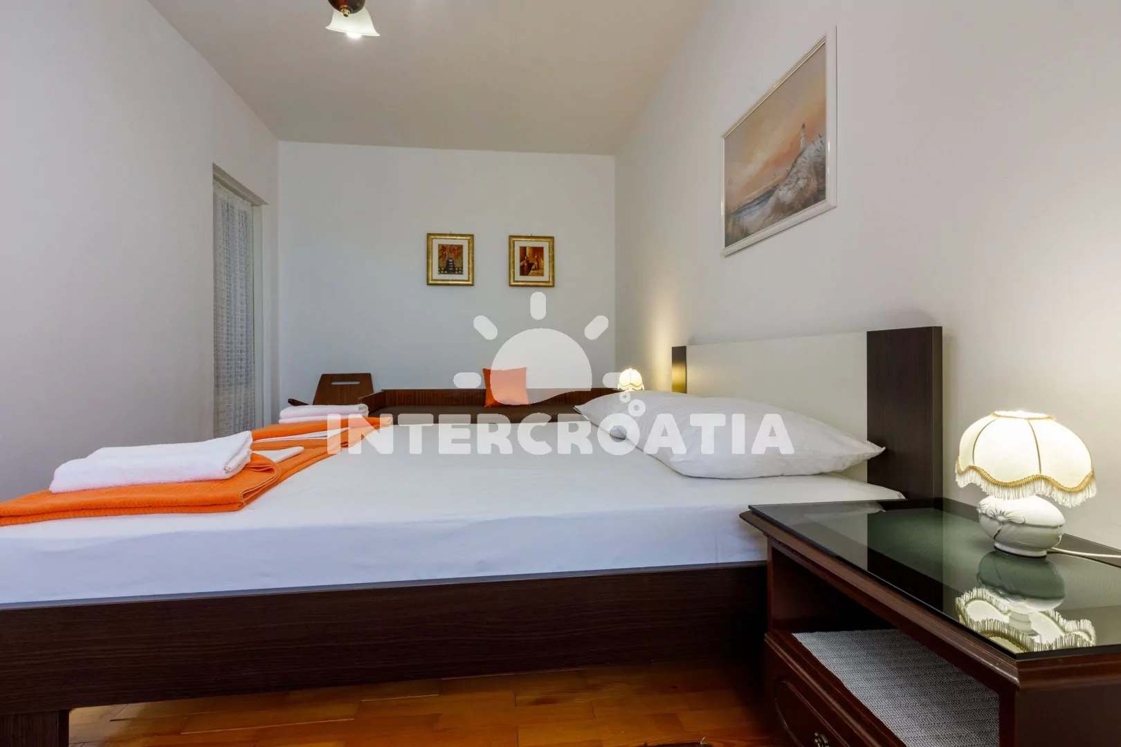 Apartmán (65 m2) s vlastní terasou a výhledem na moře se nachází v 2. patře domu a je vhodný pro 4 až 6 osob. Kuchyň s jídelním stolem pro 5 osob, televizí se satelitním programem, kuchyňskou linkou s dvouplotýnkovým vařičem, rychlovarnou konvicí, kávovarem, nádobím a lednicí s mrazákem. První ložnice s dvoulůžkem, jedním jednolůžkem a klimatizací. Druhá ložnice rovněž s dvoulůžkem, jedním jednolůžkem a klimatizací. Dvě koupelny se sprchovým koutem, umyvadlem a wc. Hostům je k dispozici parkování u objektu zdarma.