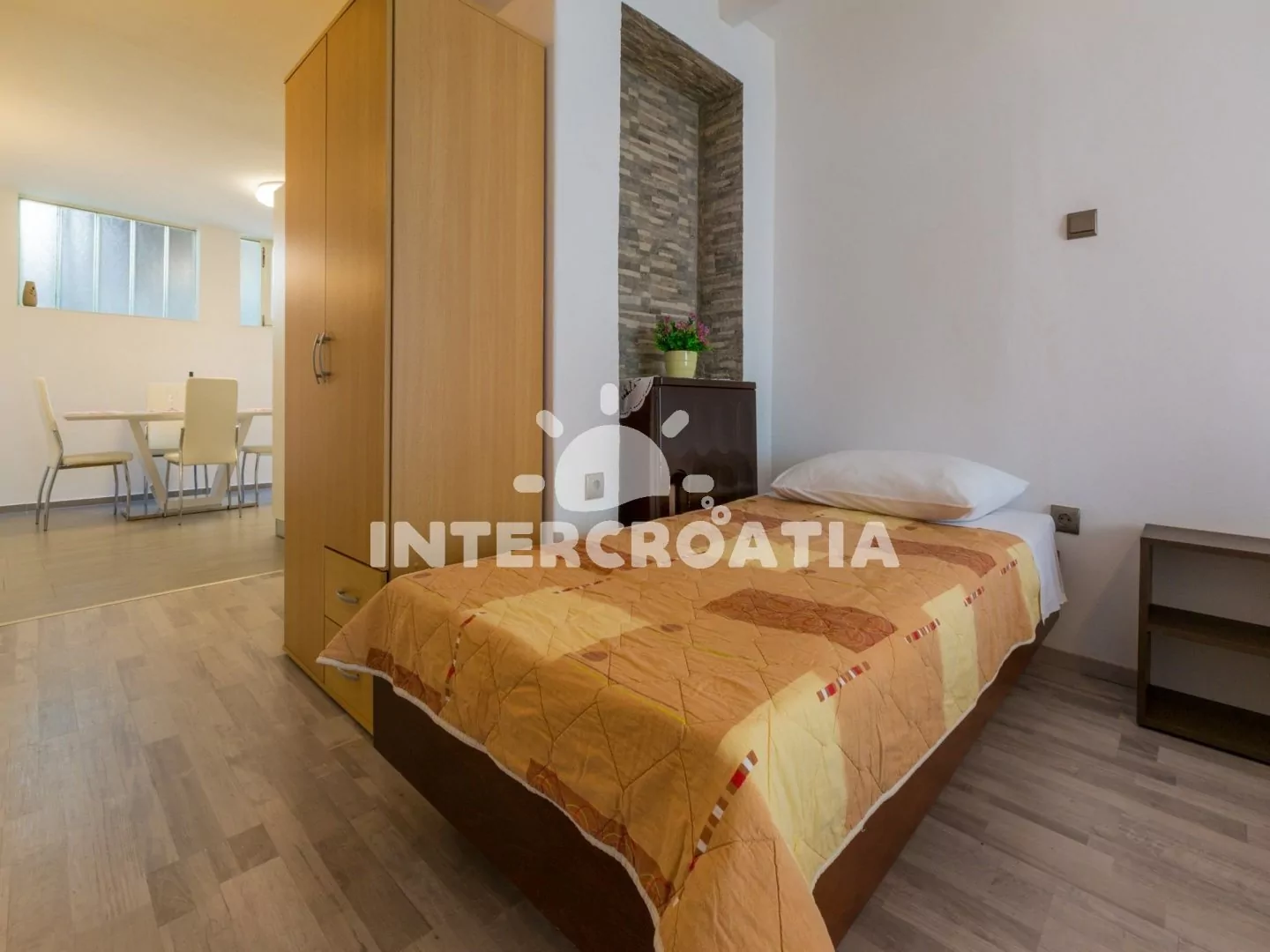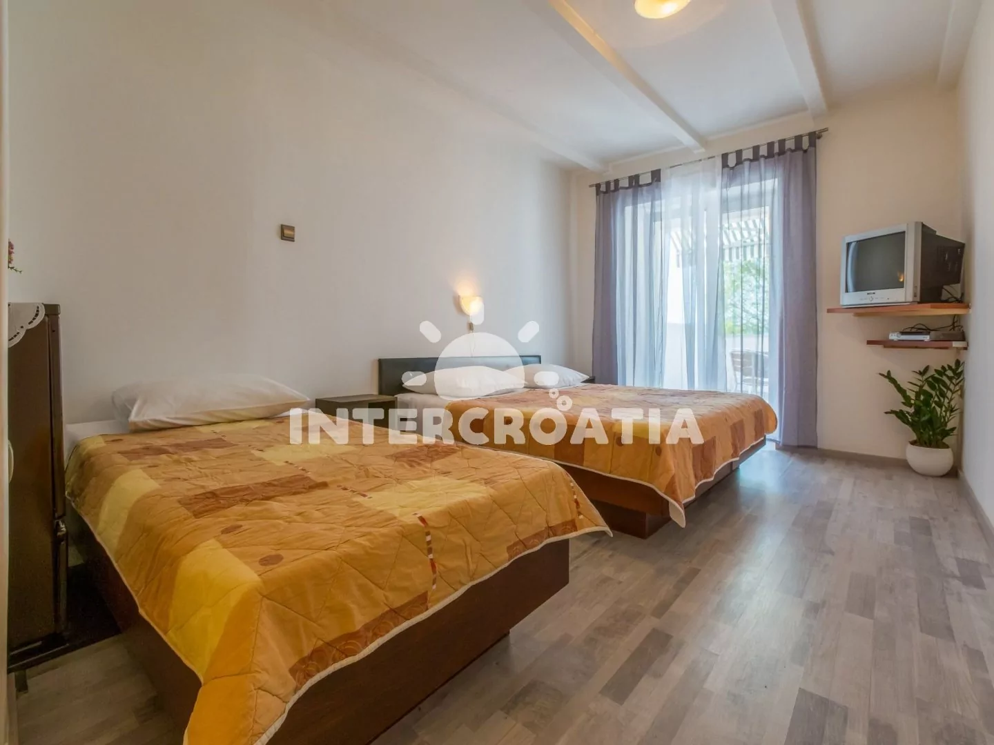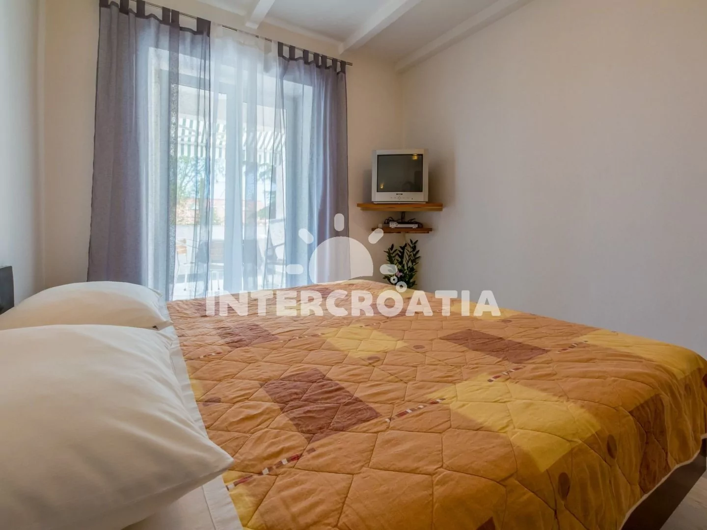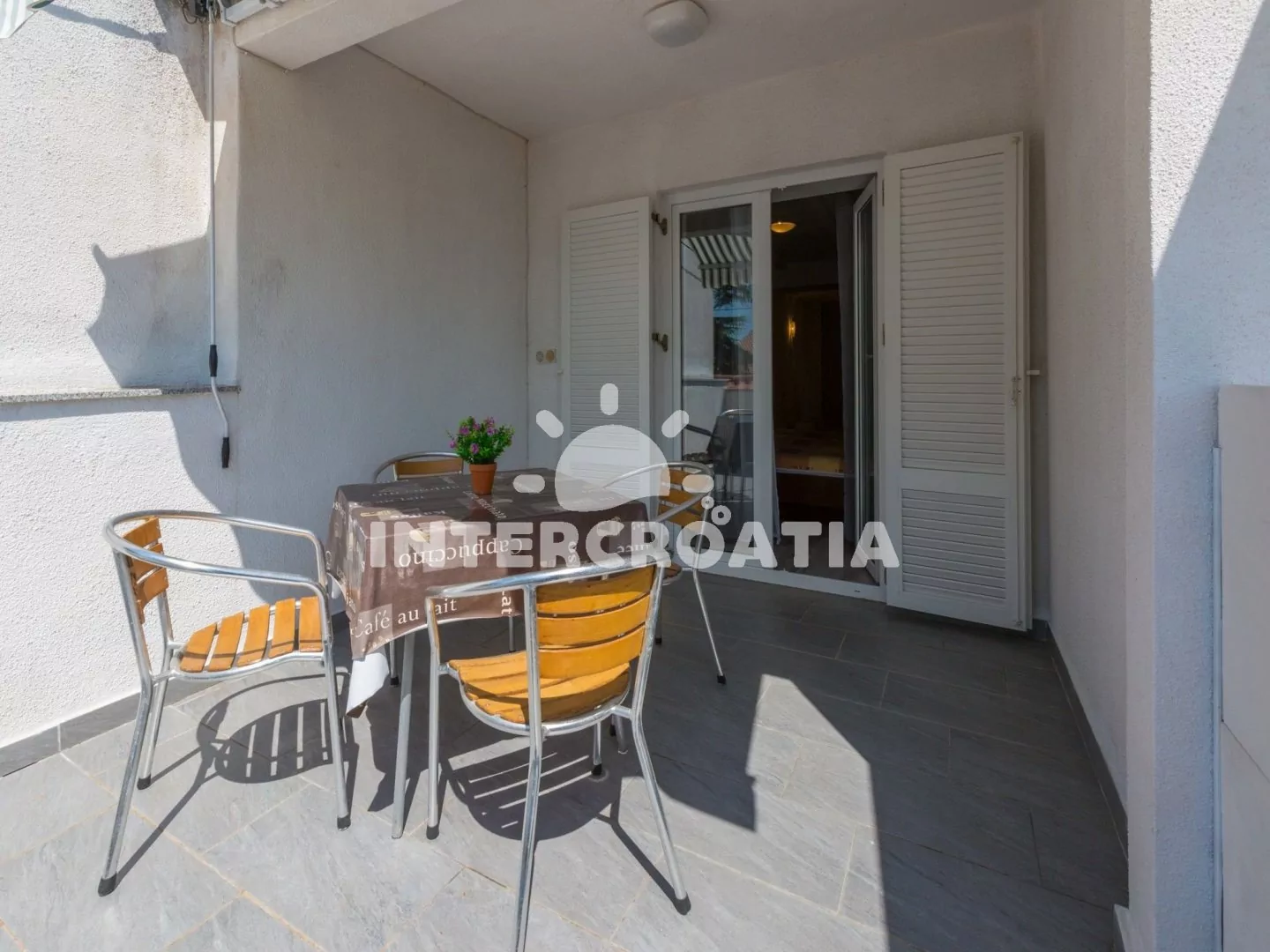 Apartmán typu studio (27 m2) s vlastní terasou, výhledem na moře a do klidné ulice se nachází v přízemí domu. Apartmán je vhodný pro až 3 osoby. Obývací místnost je spojena s kuchyní. Kuchyňská linka je vybavena varnou deskou, vestavěnou troubou, myčkou na nádobí, rychlovarnou konvicí, kávovarem, nádobím a lednicí s mrazákem. Obývací místnost s jídelním stolem pro 4 osoby, televizí se satelitním programem, dvoulůžkem, jedním jednolůžkem a vstupem na terasu. Koupelna se sprchovým koutem, umyvadlem, pračkou a wc. Hostům je k dispozici parkování u objektu zdarma.