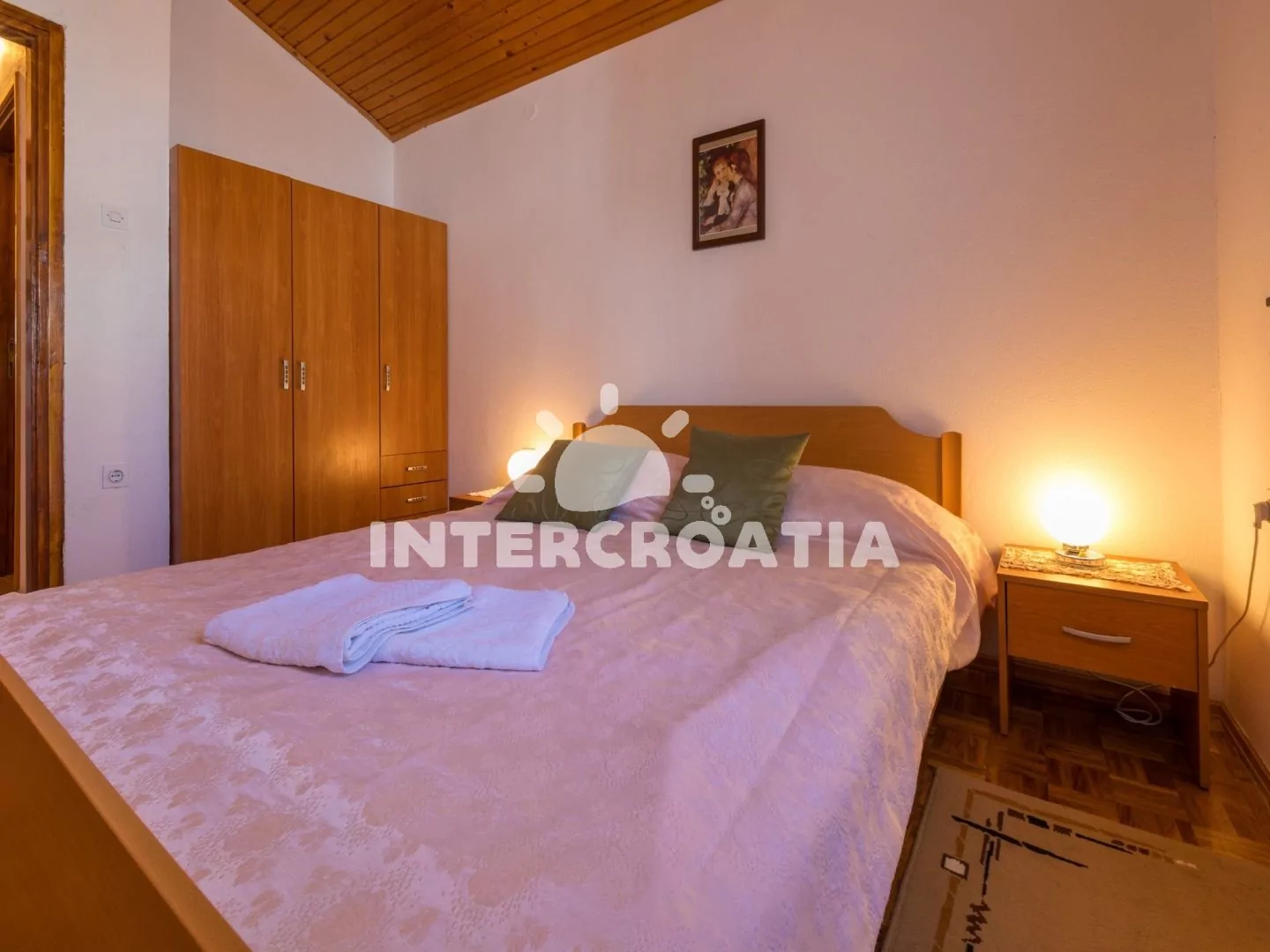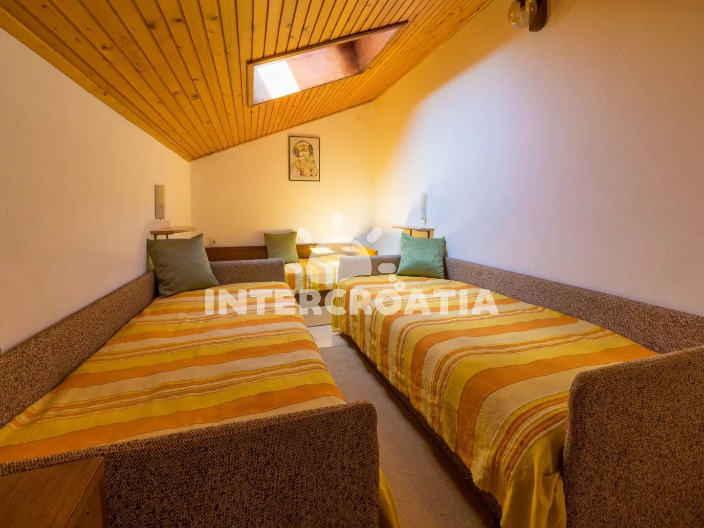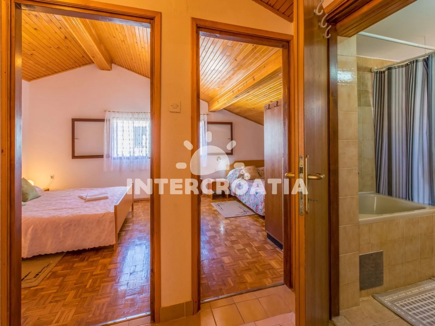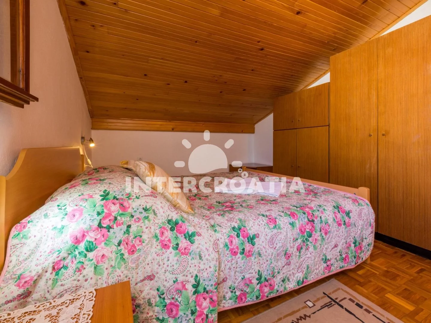 Podkrovní apartmán (70 m2) se střešní terasou a výhledem na moře je vhodný pro až 7 osob. Kuchyňská linka je vybavena dvouplotýnkovým vařičem, rychlovarnou konvicí, mikrovlnnou troubou, kávovarem, toustovačem, nádobím a lednicí s mrazákem. Obývací pokoj s jídelním stolem pro 6 osob, sedací soupravou, televizí se satelitním programem, klimatizací a vstupem na terasu. První i druhá ložnice je vybavena vždy s jedním dvoulůžkem. Třetí ložnice se 3 jednolůžky. Koupelna s vanou, sprchovou zástěnou, umyvadlem, fénem a wc. Hostům je k dispozici parkování u objektu zdarma.