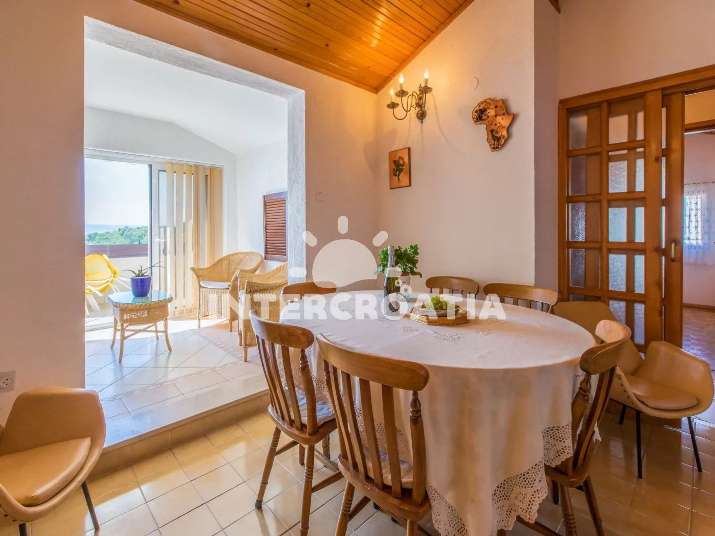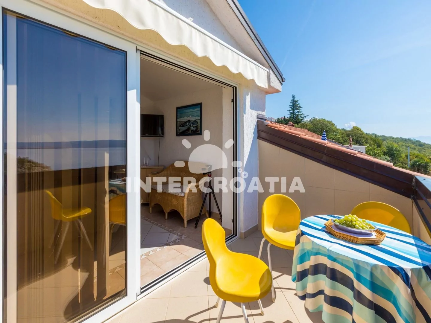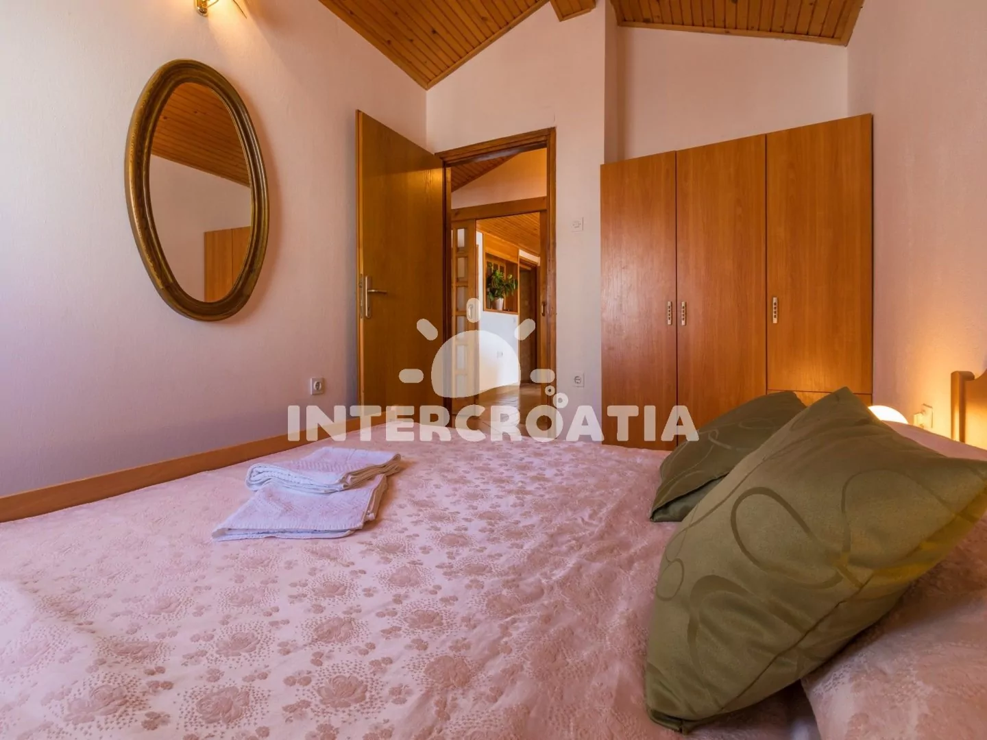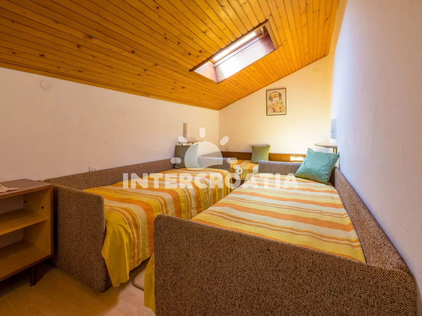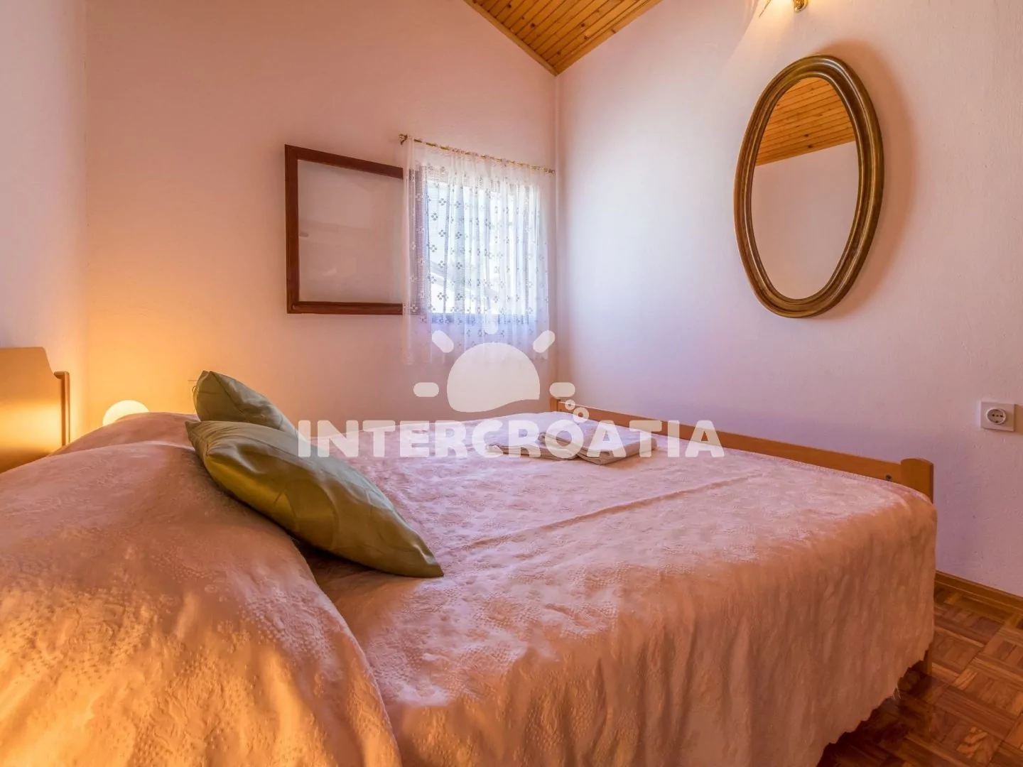 Podkrovní apartmán (70 m2) se střešní terasou a výhledem na moře je vhodný pro až 7 osob. Kuchyňská linka je vybavena dvouplotýnkovým vařičem, rychlovarnou konvicí, mikrovlnnou troubou, kávovarem, toustovačem, nádobím a lednicí s mrazákem. Obývací pokoj s jídelním stolem pro 6 osob, sedací soupravou, televizí se satelitním programem, klimatizací a vstupem na terasu. První i druhá ložnice je vybavena vždy s jedním dvoulůžkem. Třetí ložnice se 3 jednolůžky. Koupelna s vanou, sprchovou zástěnou, umyvadlem, fénem a wc. Hostům je k dispozici parkování u objektu zdarma.