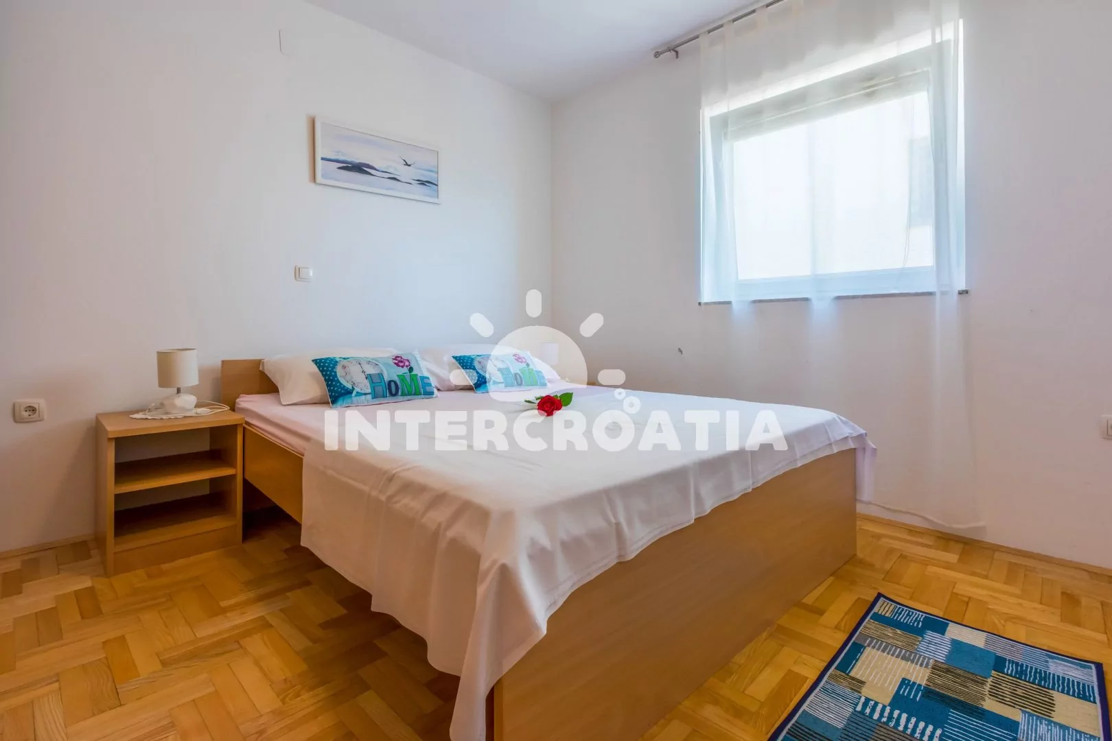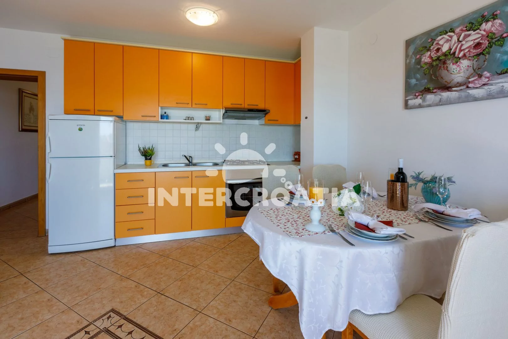 Apartmán (48 m2) s terasou a výhledem na moře, se nachází v 1. patře domu a je vhodný pro 2 až 4 osoby. Obývací pokoj je spojený s kuchyní. Kuchyňská linka je vybavena varnou deskou, digestoří, vestavěnou troubou, rychlovarnou konvicí, kávovarem, nádobím a lednicí s mrazákem. Obývací pokoj s jídelním stolem pro 4 osoby, pohovkou (rozložitelná na extra lůžko pro 2 osoby), televizí se satelitním programem, klimatizací a vstupem na terasu. Ložnice s jedním dvoulůžkem. Koupelna se sprchovým koutem, umyvadlem a wc. Hostům je k dispozici parkování u objektu zdarma.