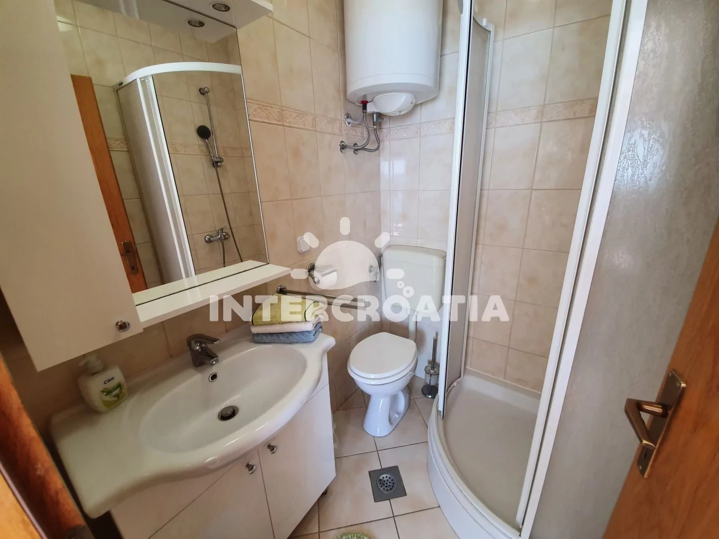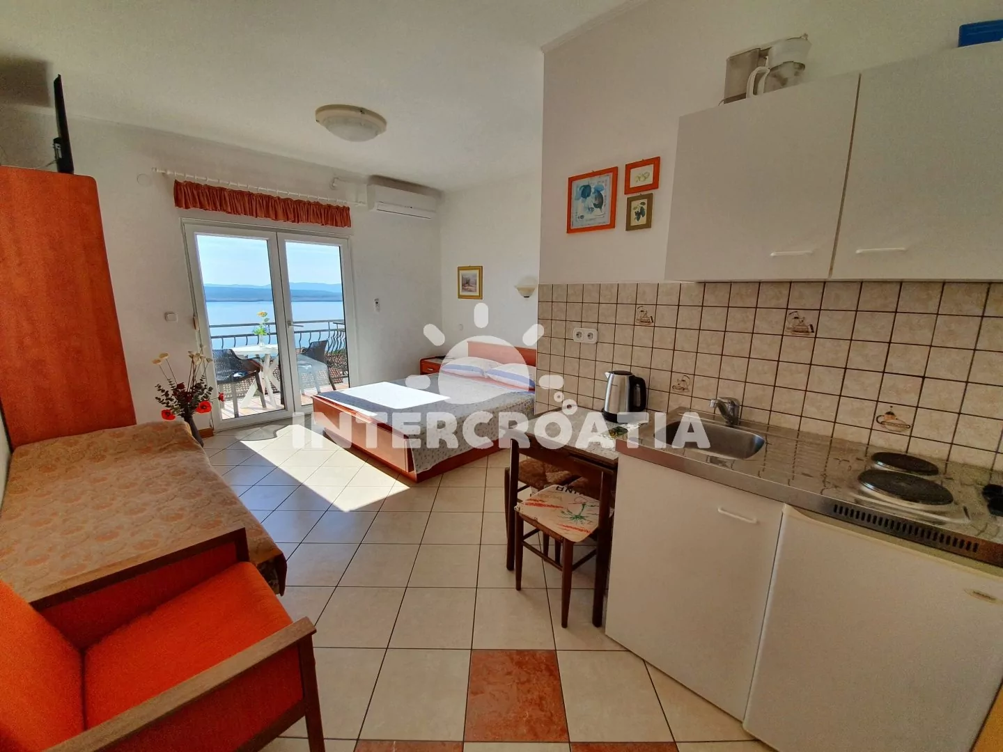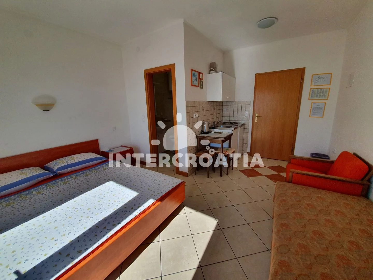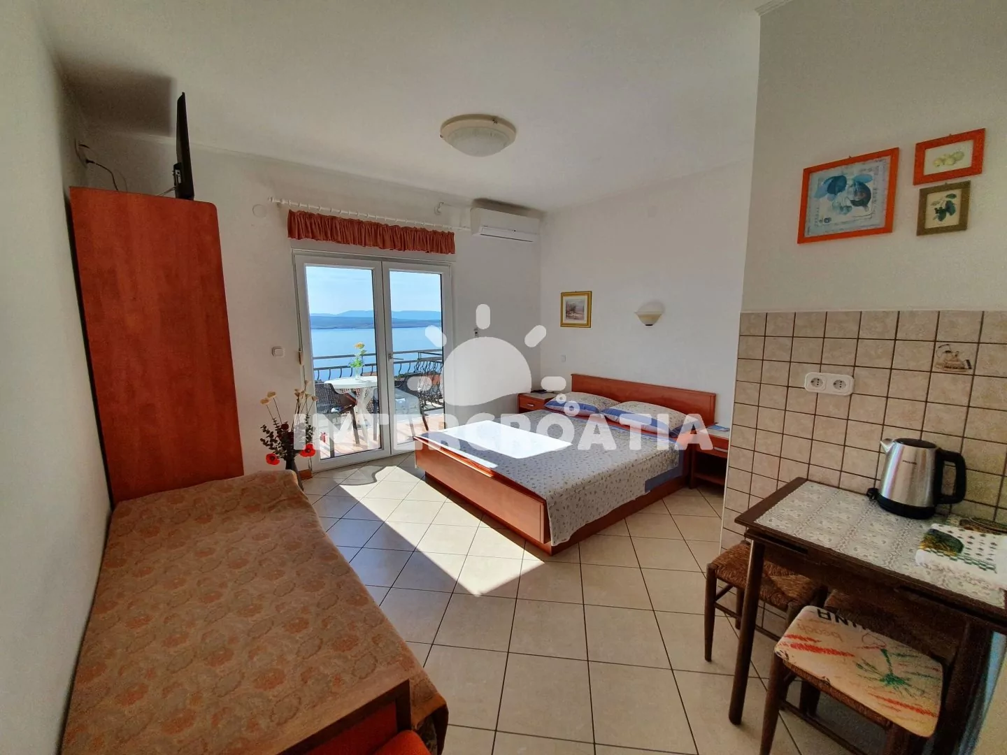 Apartmán (20 m2) typu studio, s balkonem a výhledem na moře se nachází v 2. patře domu a je vhodný pro až 3 osoby. Obývací místnost je spojena s kuchyní. Kuchyňská linka je vybavena dvouplotýnkovým vařičem, kávovarem, toustovačem, nádobím a lednicí s mrazákem. Obývací místnost s dvoulůžkem, jedním jednolůžkem, televizí se satelitním programem, klimatizací a vstupem na balkon. Koupelna se sprchovým koutem, umyvadlem a wc. Hostům je k dispozici parkování u objektu zdarma.