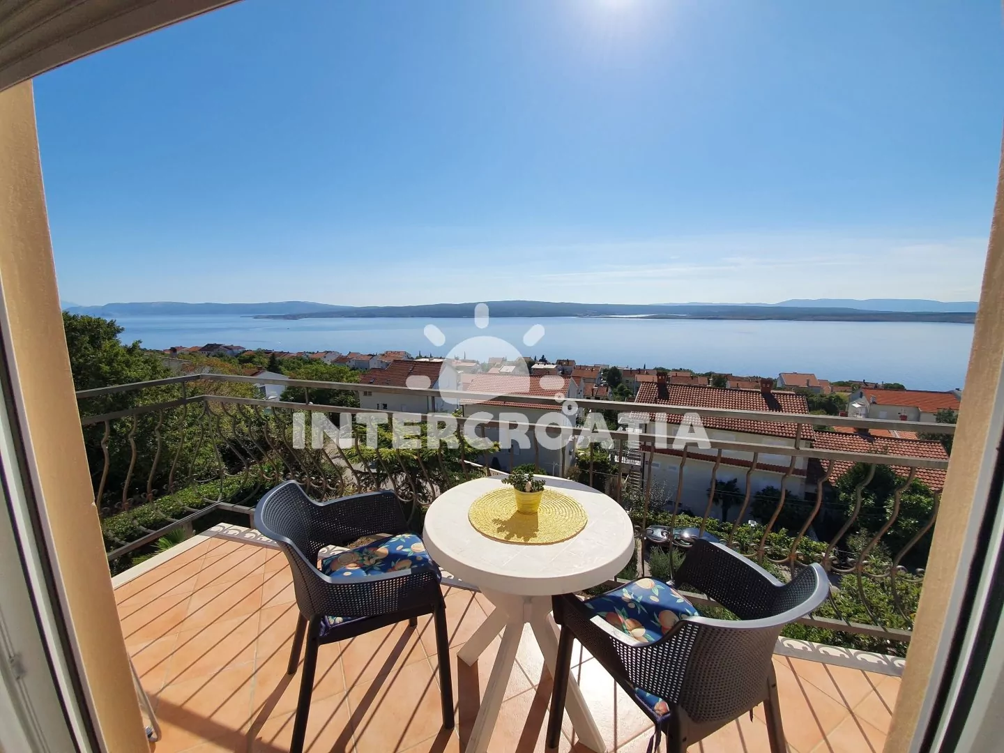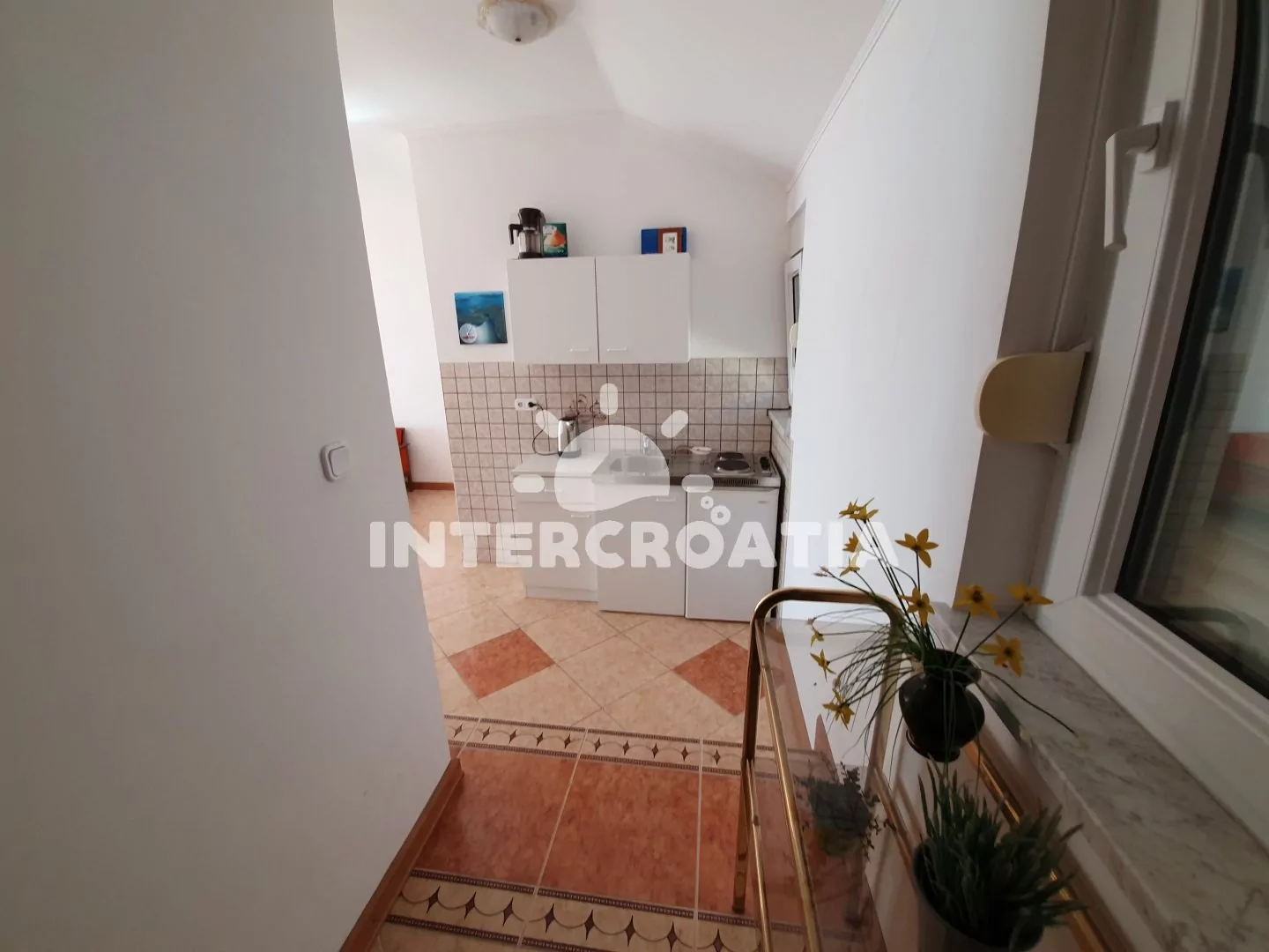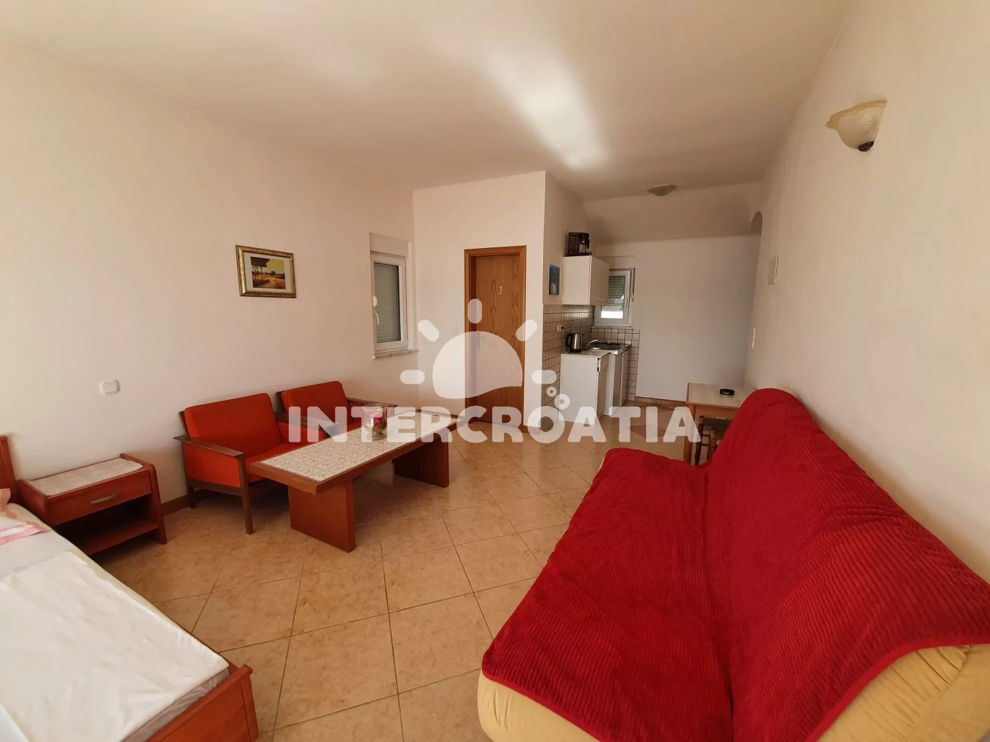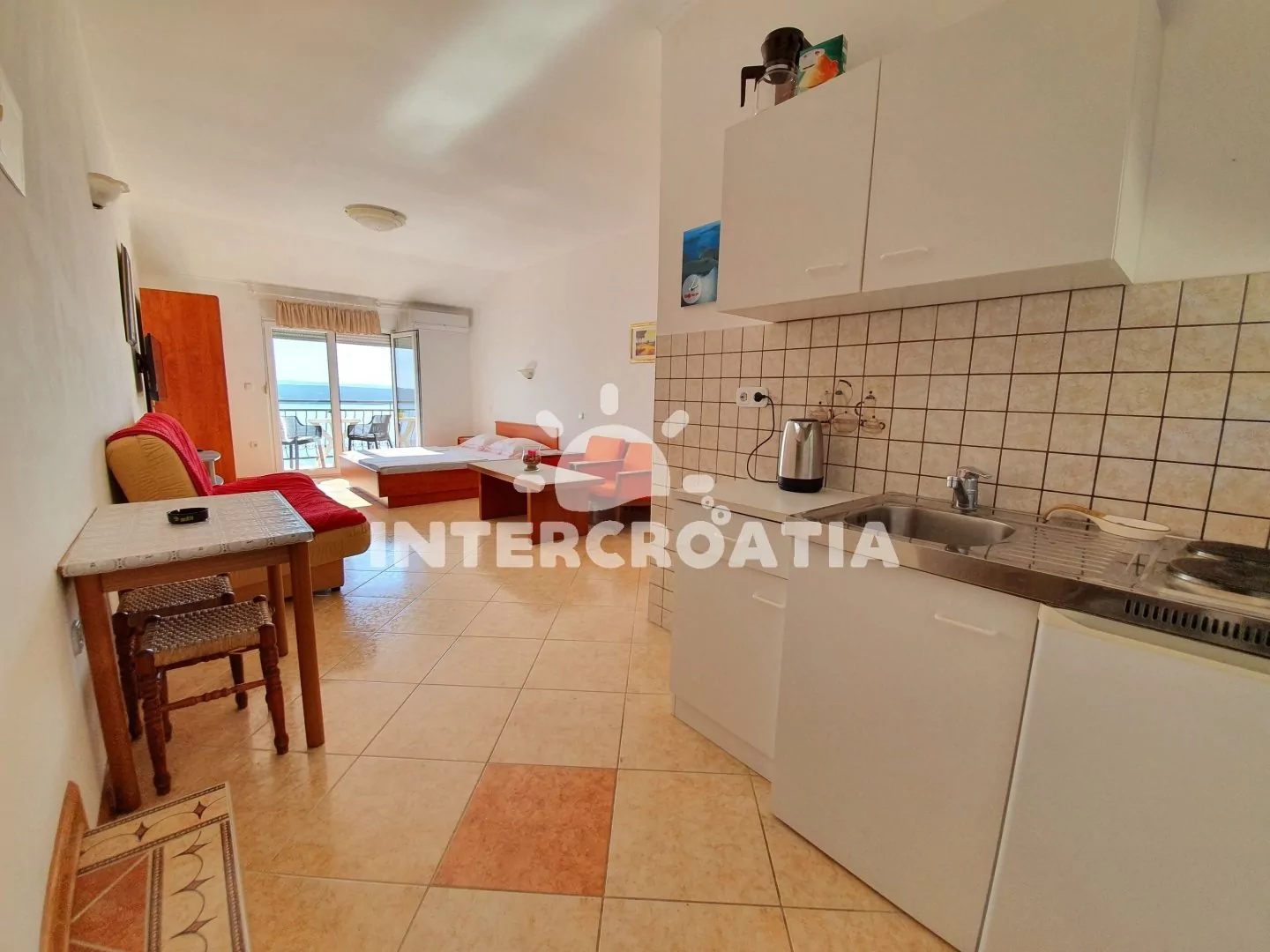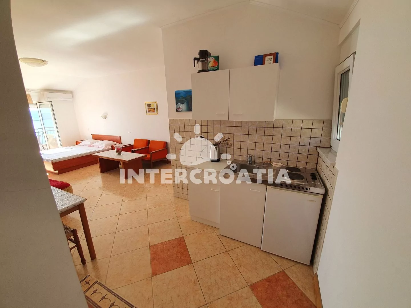 Apartmán (30 m2) typu studio, s balkonem a výhledem na moře se nachází v 2. patře domu a je vhodný pro 2 až 3 osoby. Obývací místnost je spojena s kuchyní. Kuchyňská linka je vybavena dvouplotýnkovým vařičem, kávovarem, toustovačem, nádobím a lednicí s mrazákem. Obývací místnost s dvoulůžkem, pohovkou (rozložitelná na extra lůžko pro 1 osobu), televizí se satelitním programem, klimatizací a vstupem na balkon. Koupelna se sprchovým koutem, umyvadlem a wc. Hostům je k dispozici parkování u objektu zdarma.