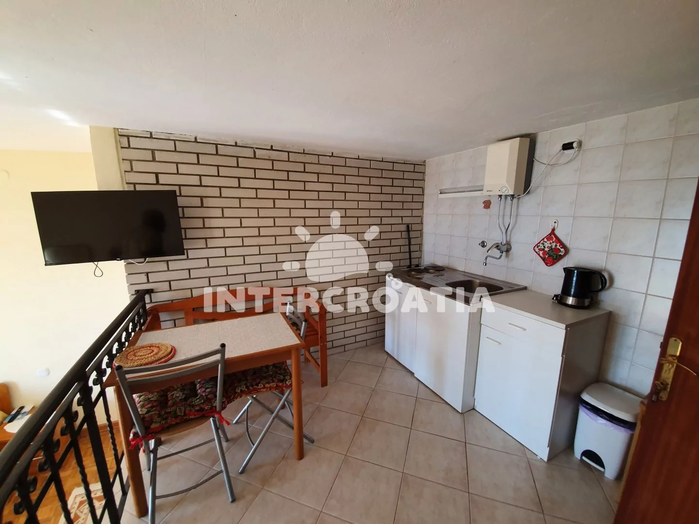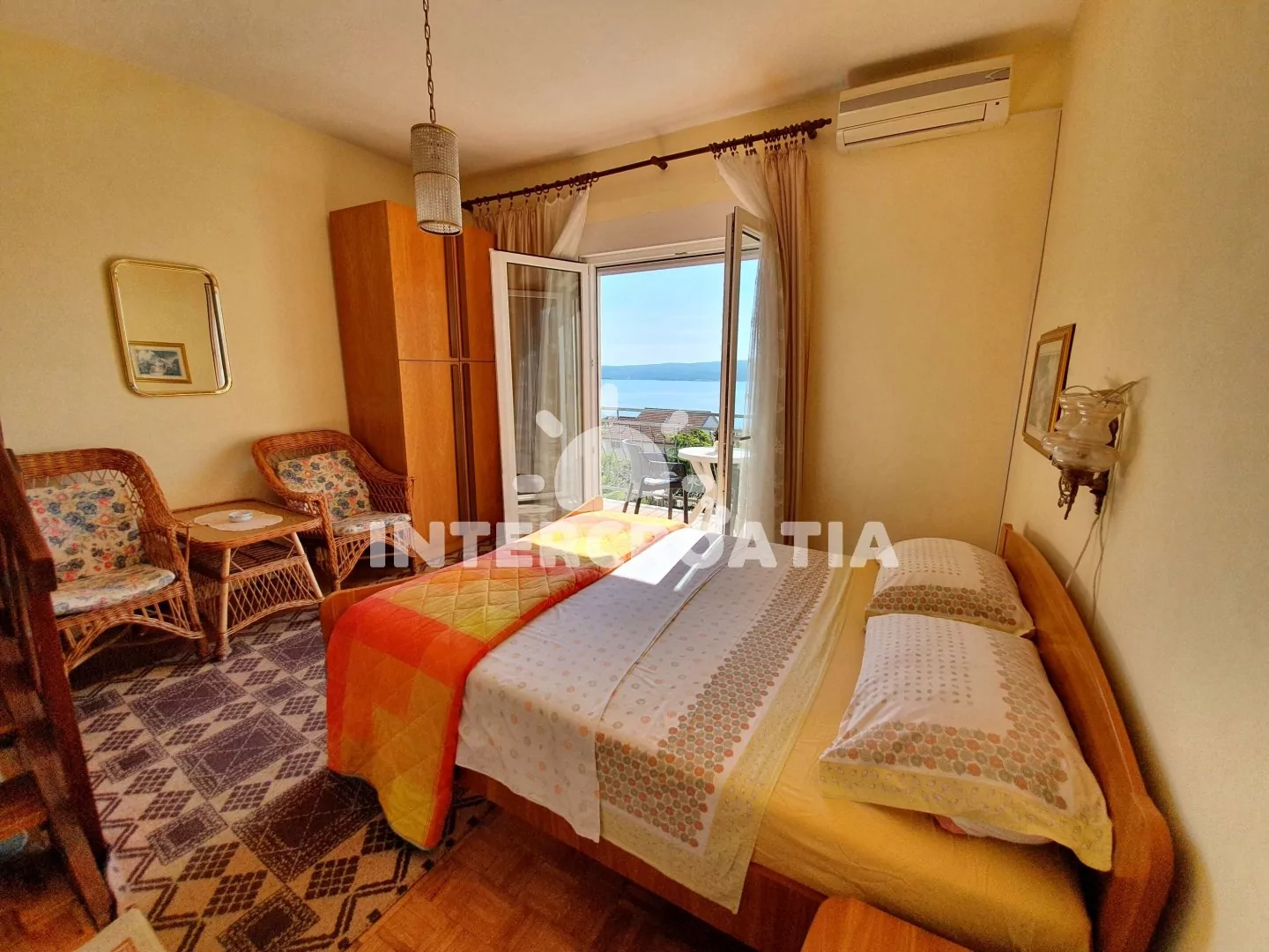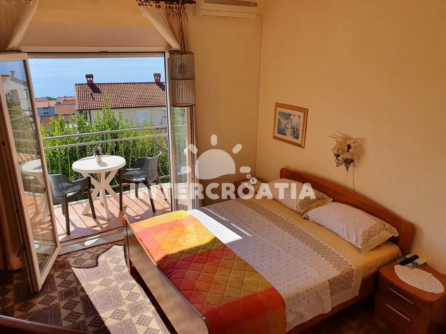 Apartmán (26 m2) typu studio, s balkonem a výhledem na moře se nachází v 1. patře domu a je vhodný pro 2 osoby. Obývací místnost je spojena s kuchyní. Kuchyňská linka je vybavena dvouplotýnkovým vařičem, kávovarem, toustovačem, nádobím a lednicí s mrazákem. Obývací místnost s jídelním stolem, jedním dvoulůžkem, televizí se satelitním programem, klimatizací a vstupem na balkon. Koupelna se sprchovým koutem, umyvadlem a wc. Hostům je k dispozici parkování u objektu zdarma.