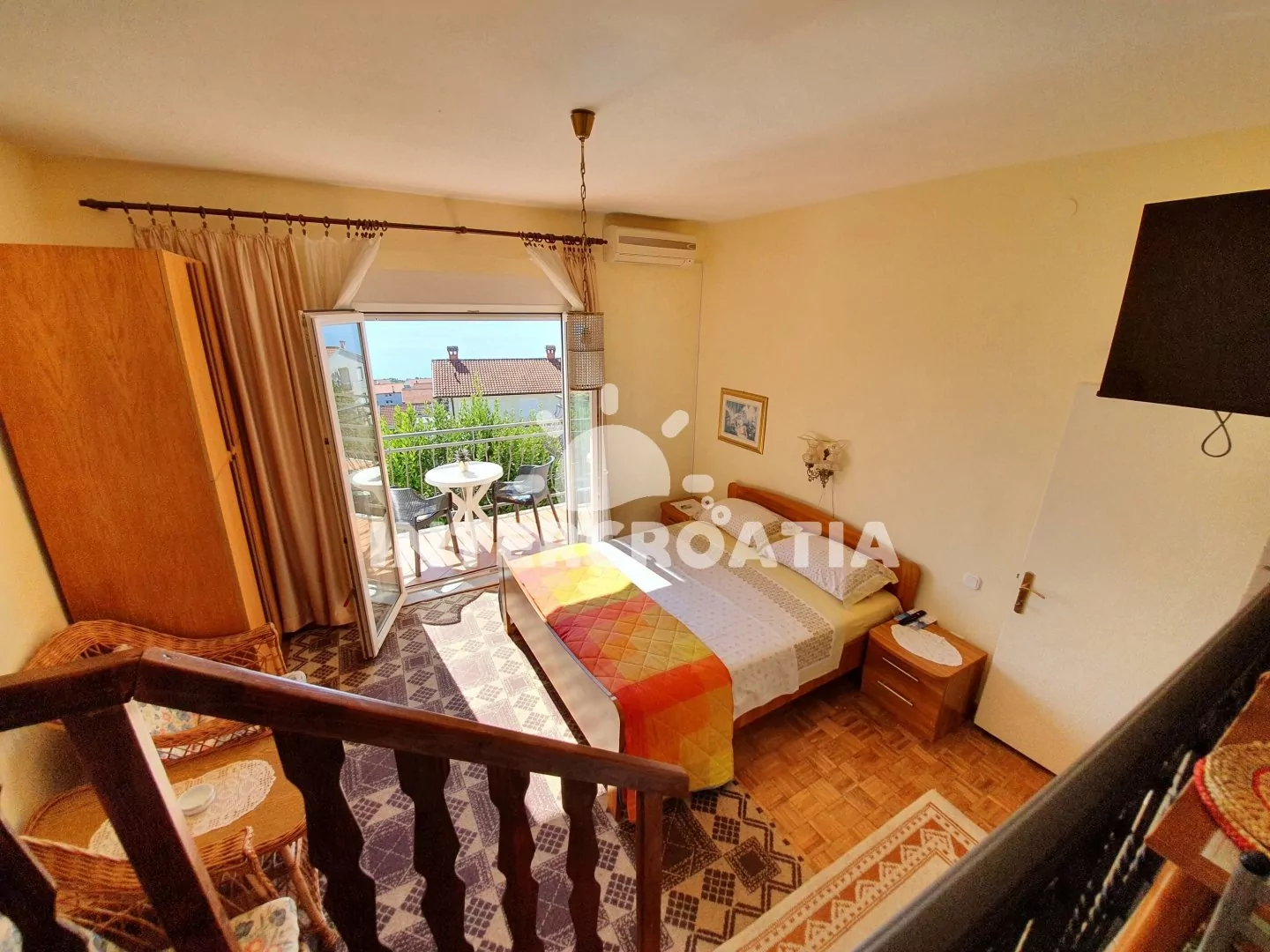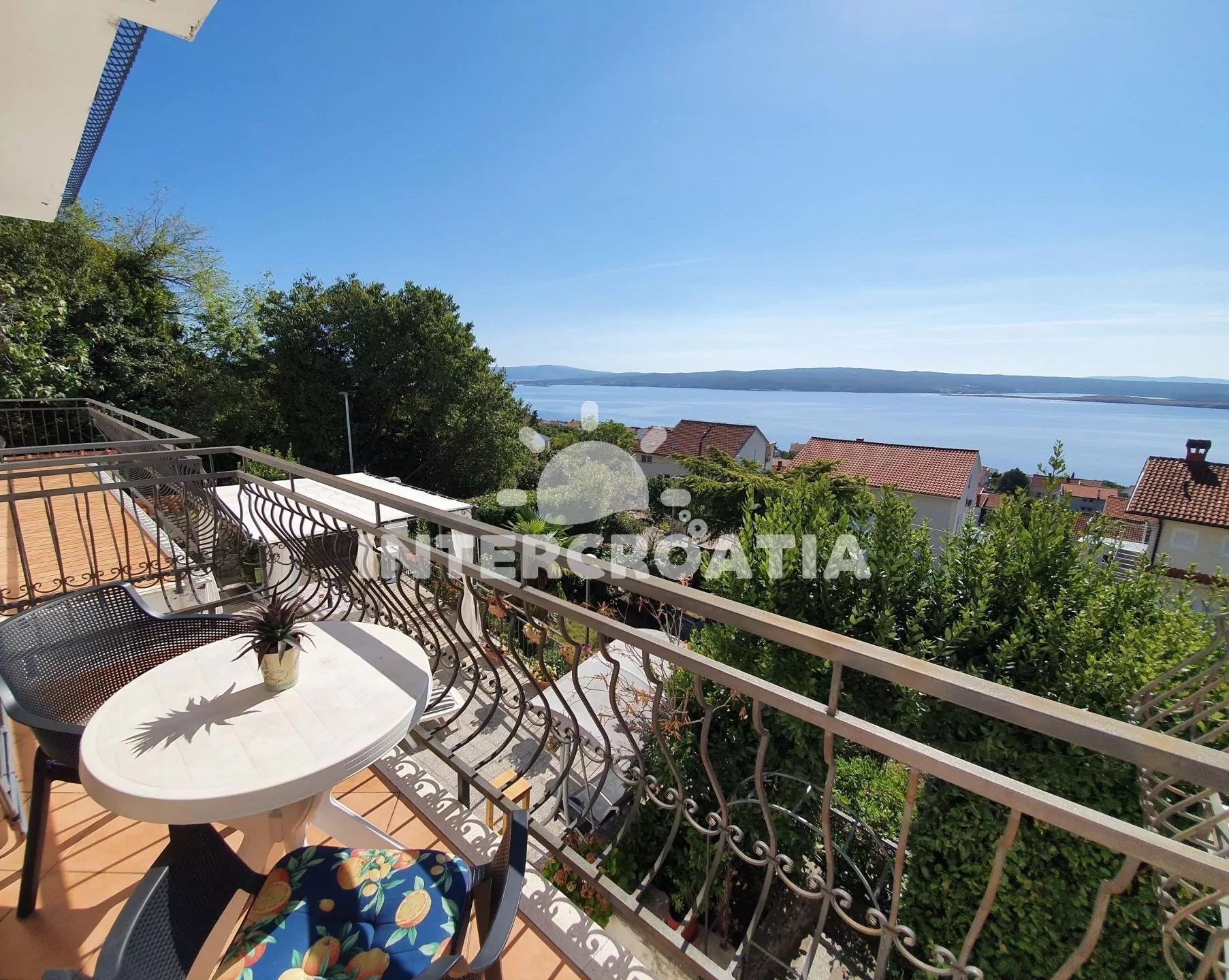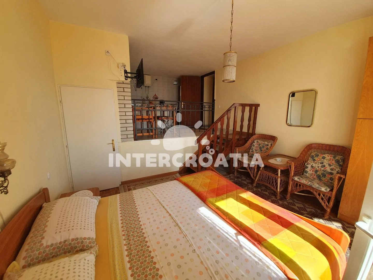 Apartmán (26 m2) typu studio, s balkonem a výhledem na moře se nachází v 1. patře domu a je vhodný pro 2 osoby. Obývací místnost je spojena s kuchyní. Kuchyňská linka je vybavena dvouplotýnkovým vařičem, kávovarem, toustovačem, nádobím a lednicí s mrazákem. Obývací místnost s jídelním stolem, jedním dvoulůžkem, televizí se satelitním programem, klimatizací a vstupem na balkon. Koupelna se sprchovým koutem, umyvadlem a wc. Hostům je k dispozici parkování u objektu zdarma.
