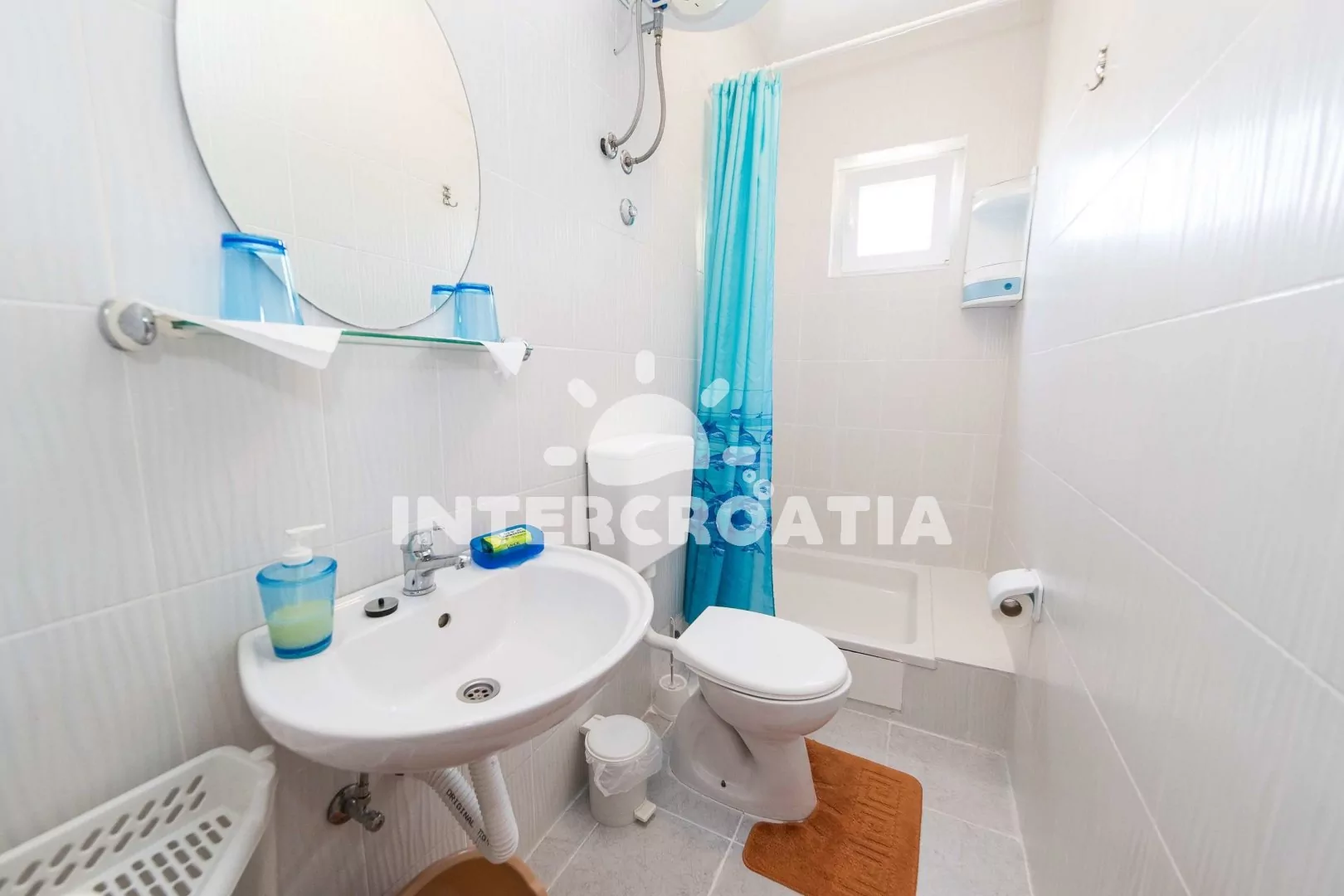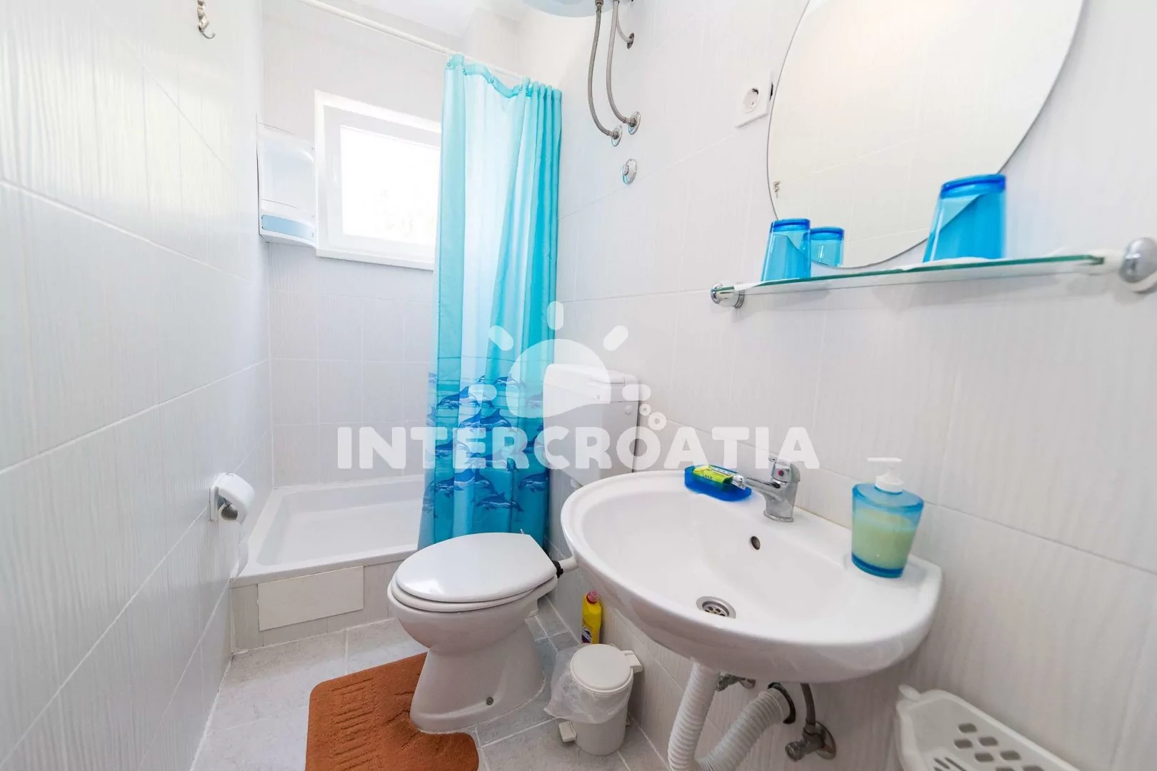 Apartmán (80 m2) s balkonem, posezením a výhledem na moře se nachází v 2. patře domu a je vhodný pro 6 až 8 osob. Obývací pokoj je spojený s kuchyní. Kuchyňská linka je vybavena sporákem s troubou, digestoří, mikrovlnnou troubou, rychlovarnou konvicí, kávovarem, toustovačem, nádobím a lednicí s mrazákem. Obývací pokoj s jídelním stolem pro 6 osob, pohovkou (rozložitelná na extra lůžko pro 2 osoby) a televizí se satelitním programem. První ložnice s dvoulůžkem, klimatizací a vstupem na balkon. Druhá a třetí ložnice je vybavena jedním dvoulůžkem. První i druhá koupelna se sprchovým koutem, umyvadlem, fénem a wc. Hostům je k dispozici parkování u objektu zdarma.