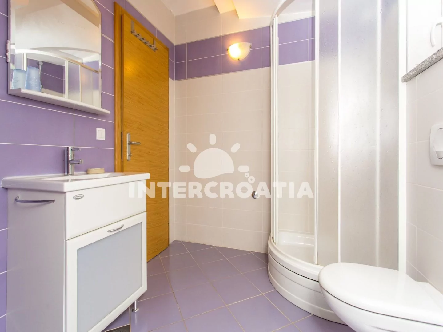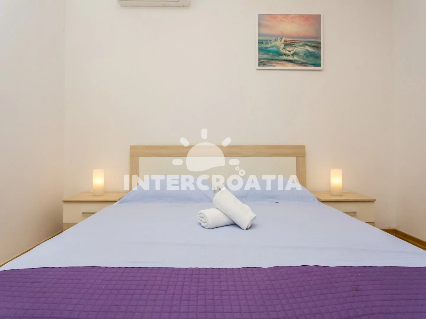 Apartmán (55 m2) s terasou a výhledem na moře se nachází v 1. patře domu a je vhodný pro až 4 osoby. Obývací pokoj je spojený s kuchyní. Kuchyňská linka je vybavena varnou deskou, digestoří, vestavěnou troubou, rychlovarnou konvicí, kávovarem, toustovačem, nádobím a lednicí s mrazákem. Obývací pokoj s jídelním stolem pro 4 osoby, sedací soupravou s pohovkou (rozložitelná na extra lůžko pro 2 osoby), televizí se satelitním programem, klimatizací a vstupem na terasu. Ložnice s jedním dvoulůžkem a klimatizací. Koupelna se sprchovým koutem, umyvadlem a wc. Hostům je k dispozici parkování u objektu zdarma.