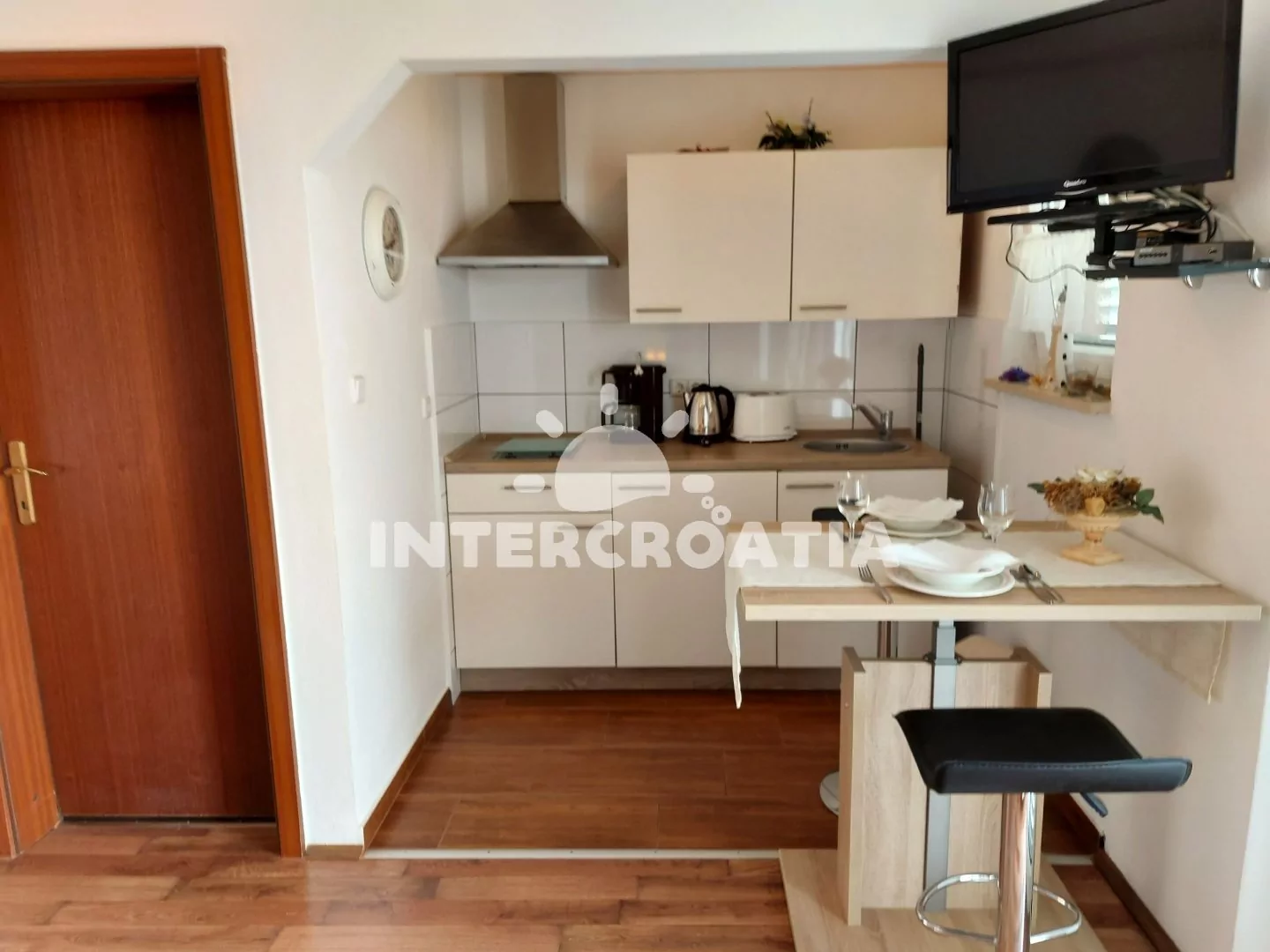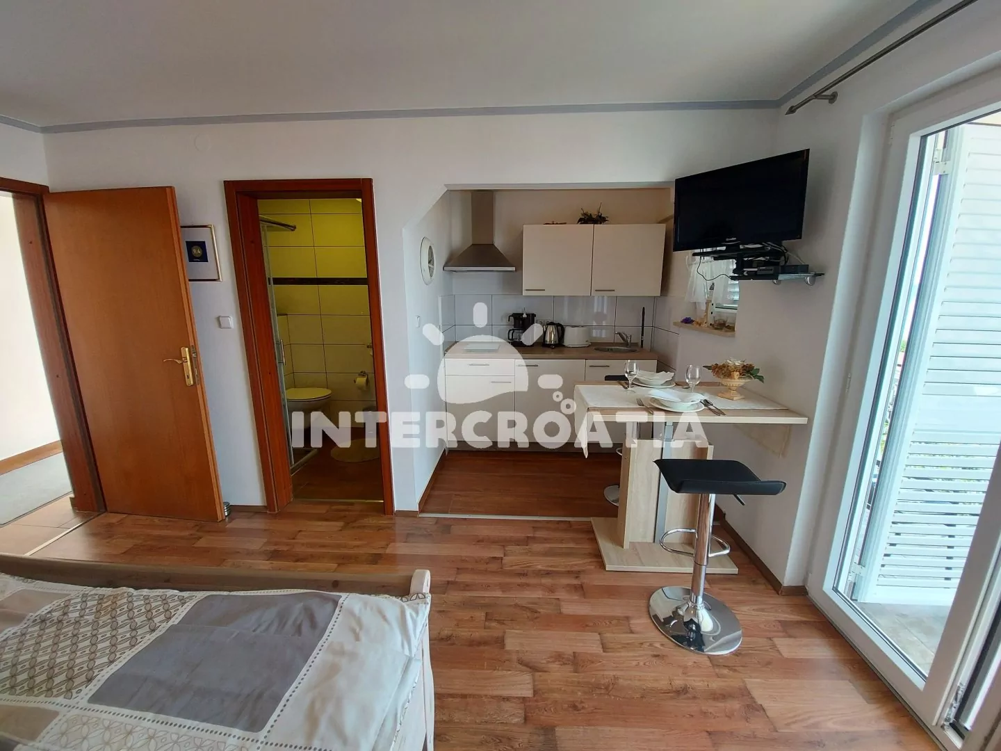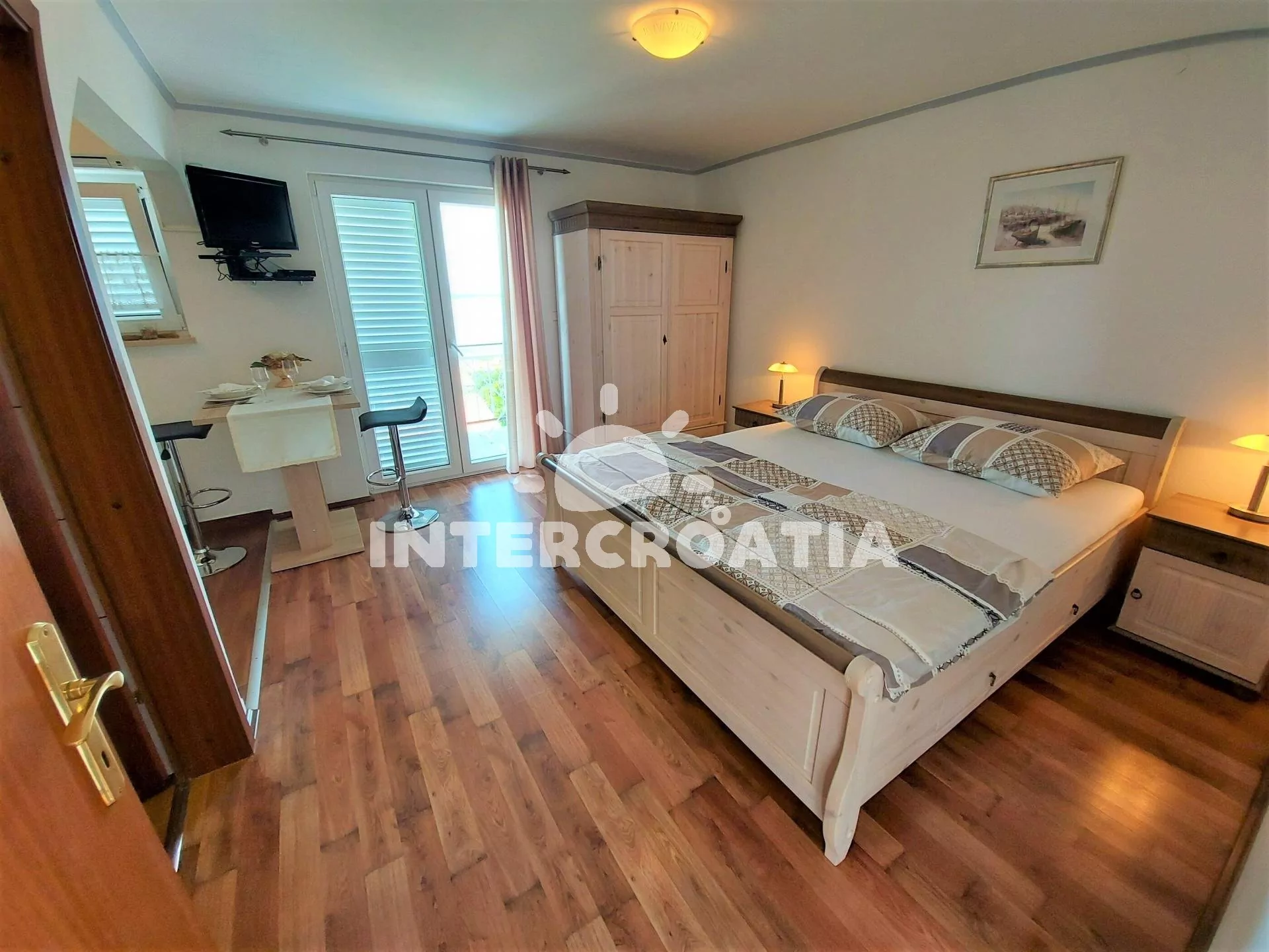 Apartmán typu studio (30 m2) s balkonem a výhledem na moře se nachází v 2. patře domu a je vhodný pro 2 osoby. Obývací místnost je spojena s kuchyní. Kuchyňská linka je vybavena dvouplotýnkovým vařičem, digestoří, kávovarem, rychlovarnou konvicí, toustovačem, nádobím a lednicí s mrazákem. Obývací místnost s jídelním stolem, televizí se satelitním programem, dvoulůžkem, klimatizací a vstupem na balkon. Koupelna se sprchovým koutem, umyvadlem a wc. Hostům je k dispozici parkování u objektu zdarma.