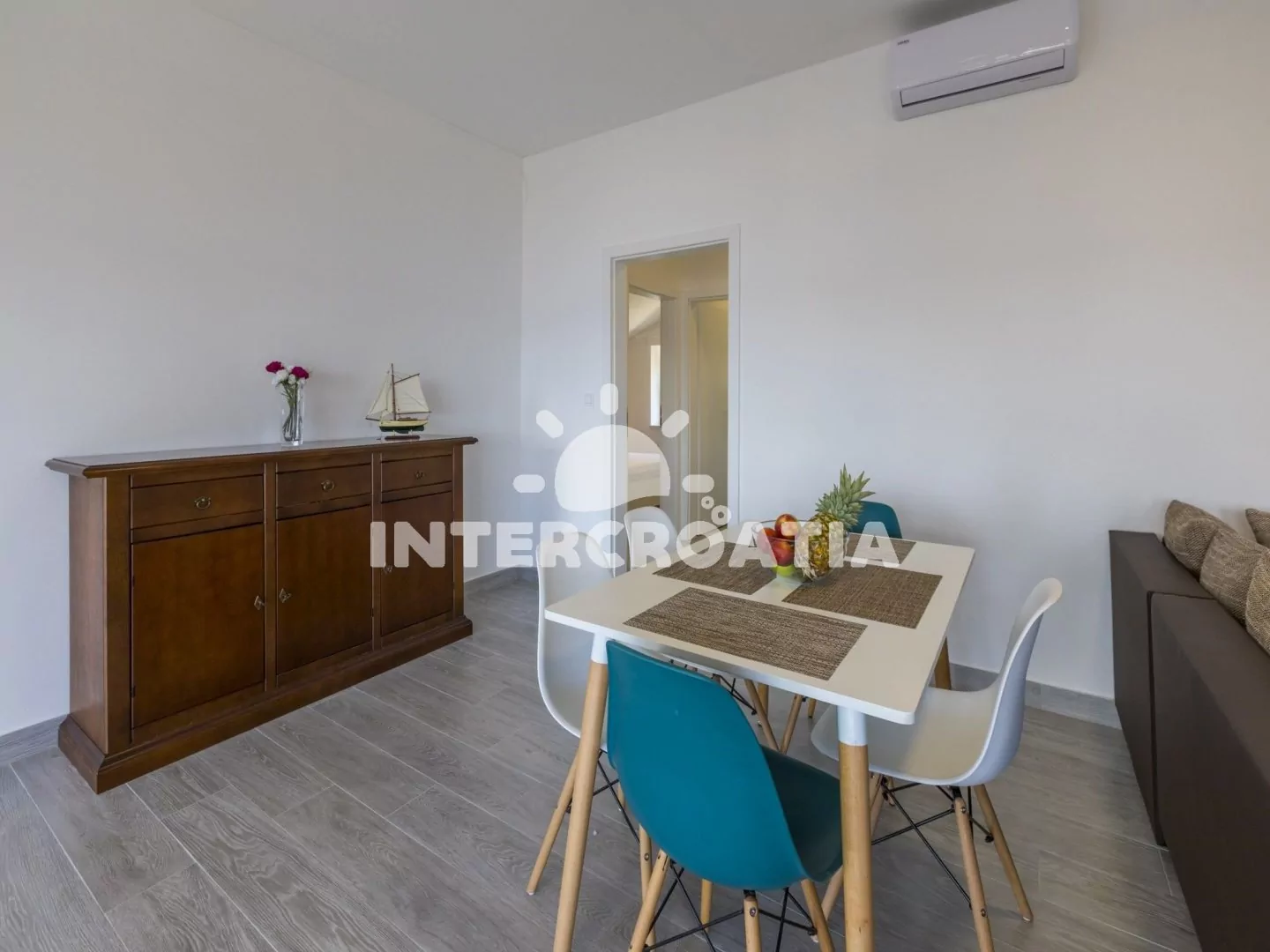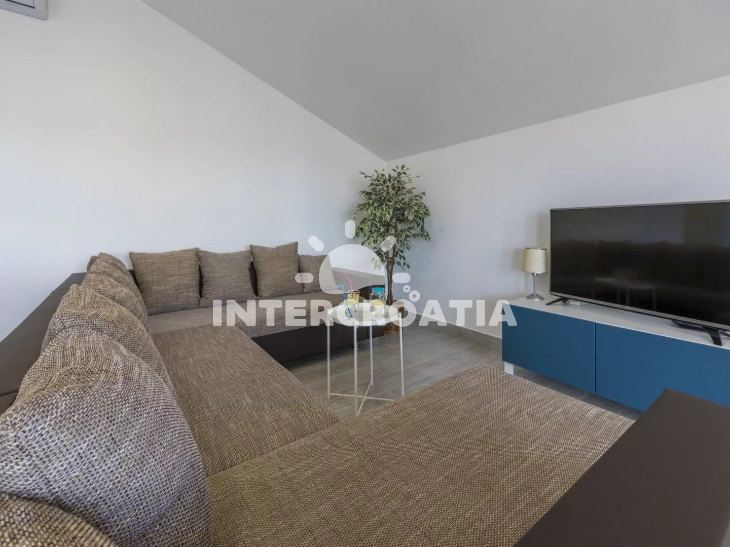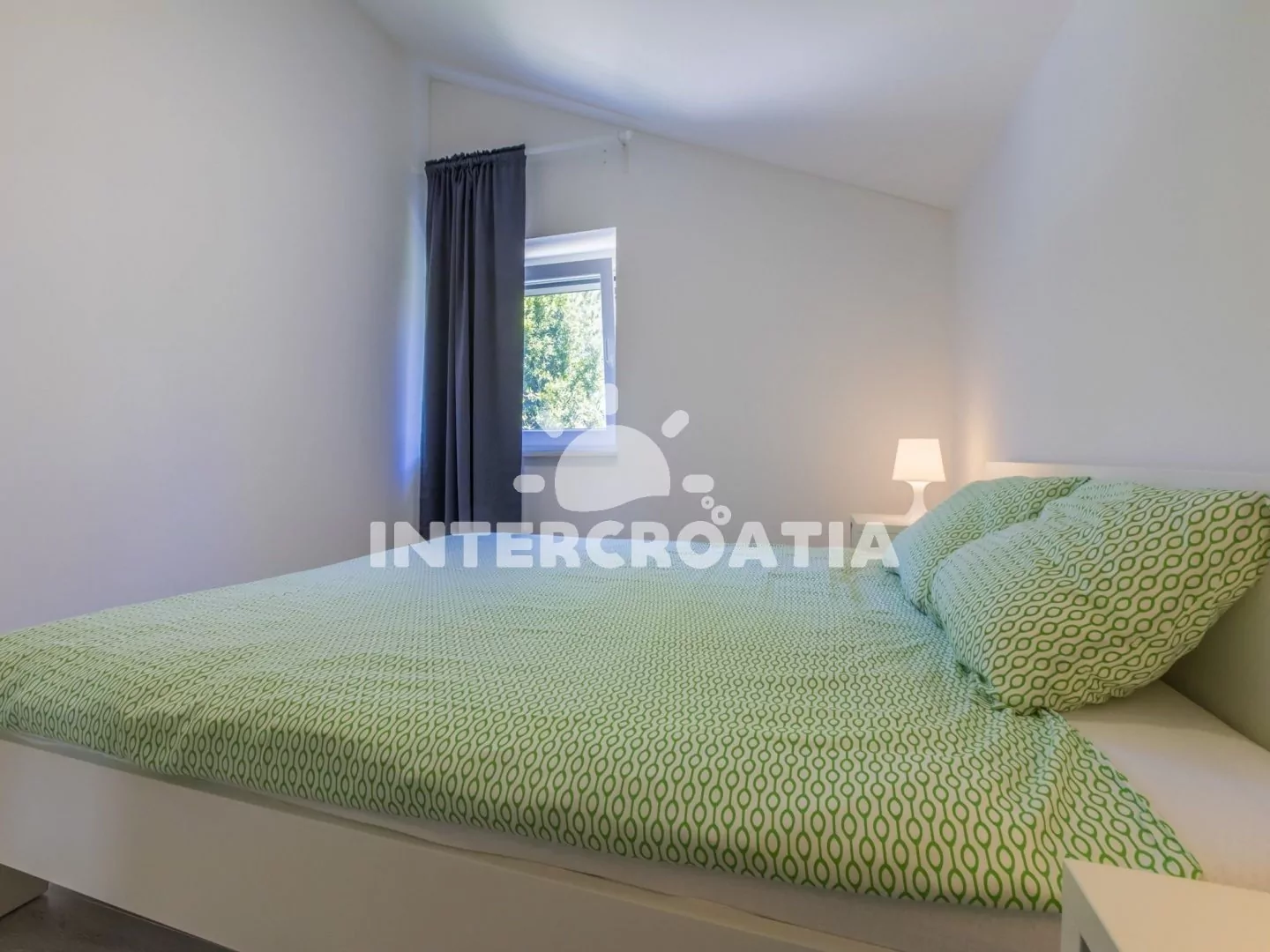 Apartmán (85 m2) s terasou a výhledem na moře se nachází v 2. patře vily a je vhodný pro 4 osoby. Kuchyňská linka je vybavena sklokeramickou varnou deskou, digestoří, vestavěnou troubou, myčkou na nádobí, mikrovlnnou troubou, rychlovarnou konvicí, toustovačem, kávovarem, nádobím a lednicí s mrazákem. Obývací pokoj s jídelním stolem pro 5 osob, rohovou pohovkou, televizí se satelitním programem, radiem, klimatizací a vstupem na terasu. První i druhá ložnice je vybavena vždy s jedním dvoulůžkem. Dvě koupelny se sprchovým koutem, umyvadlem a wc. Hostům je k dispozici parkování u objektu zdarma.