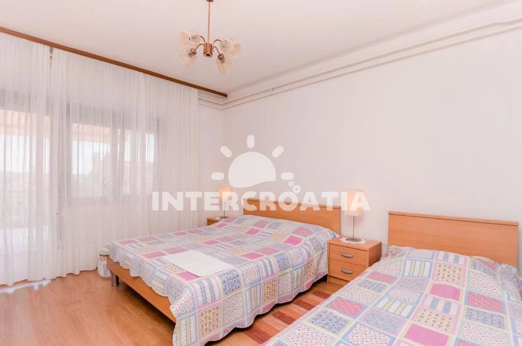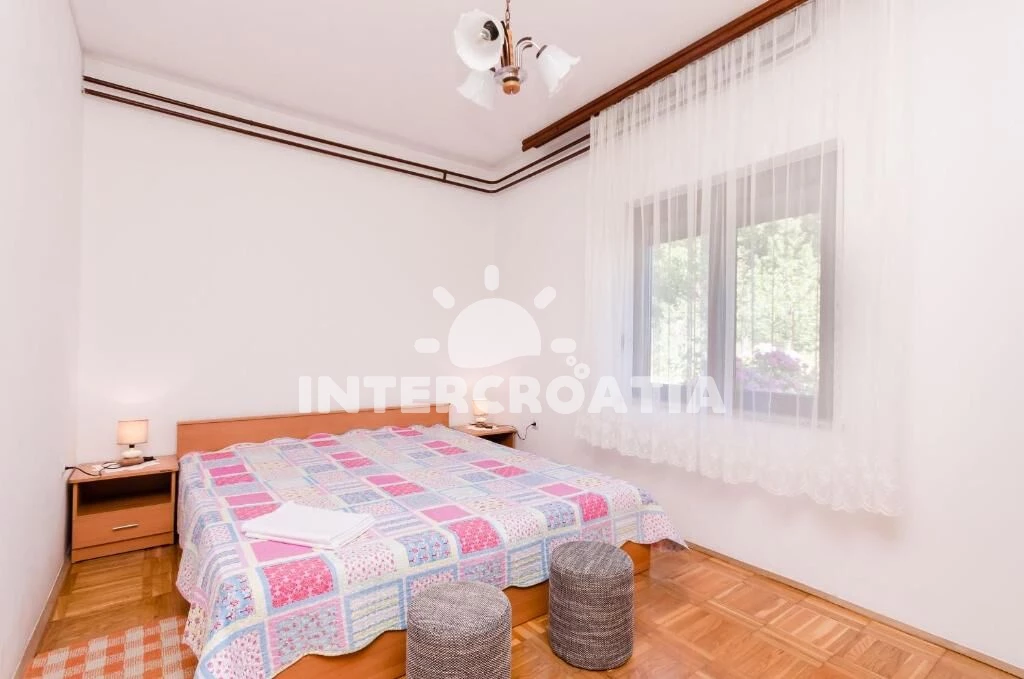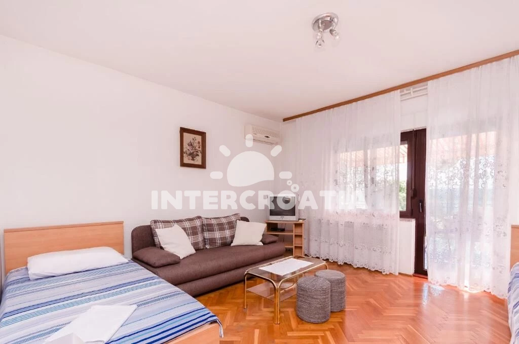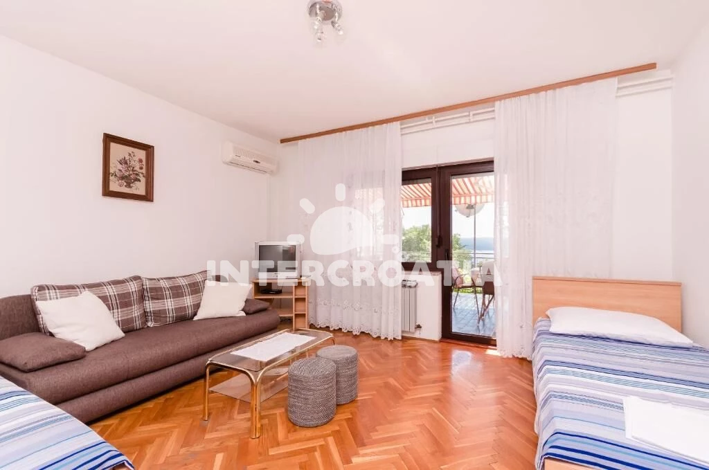 Apartmán (80 m2) s terasou a výhledem na moře se nachází v přízemí domu a je vhodný pro 4 až 6 osob. Kuchyň s jídelním stolem pro 6 osob, kuchyňskou linkou vybavenou sporákem s troubou, digestoří, kávovarem, nádobím a lednicí s mrazákem. Obývací pokoj s dvěma přistýlkami, pohovkou, televizí se satelitním programem, klimatizací a vstupem na terasu. První ložnice s dvoulůžkem a vstupem na terasu. Druhá ložnice s dvoulůžkem. Koupelna se sprchovým koutem, umyvadlem a wc. Dále samostatné wc s umyvadlem. Hostům je k dispozici parkování u objektu zdarma.