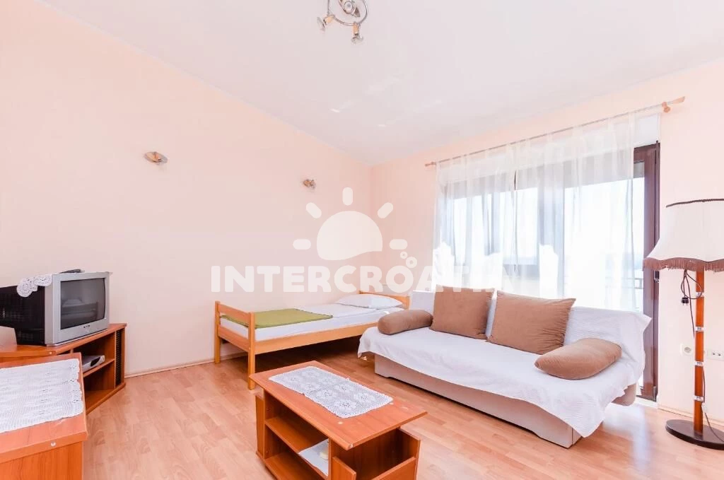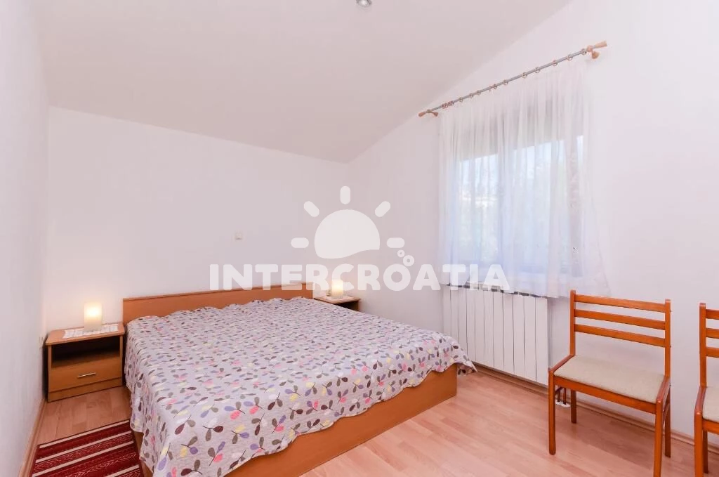 Podkrovní apartmán (76 m2) s balkonem a výhledem na moře je vhodný pro 4 až 5 osob. Obývací pokoj je spojený s kuchyní. Kuchyňská linka je vybavena varnou deskou, digestoří, troubou, kávovarem, nádobím a lednicí s mrazákem. Obývací pokoj s jídelním stolem pro 6 osob, pohovkou, přistýlkou, televizí se satelitním programem, klimatizací a vstupem na balkon. První i druhá ložnice je vybavena vždy s jedním dvoulůžkem. Koupelna se sprchovým koutem, umyvadlem, pračkou a wc. Dále samostatné wc s umyvadlem. Hostům je k dispozici parkování u objektu zdarma.