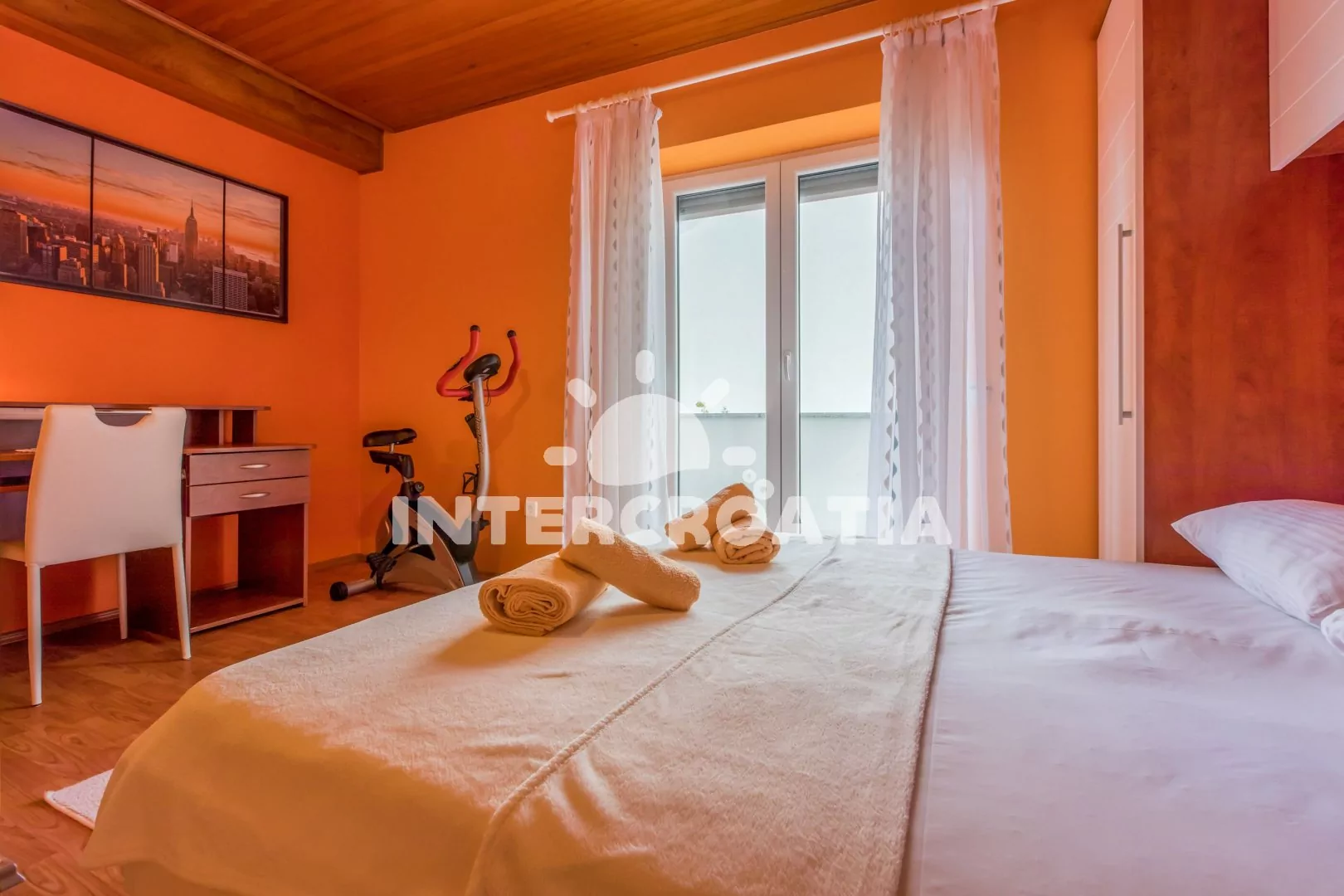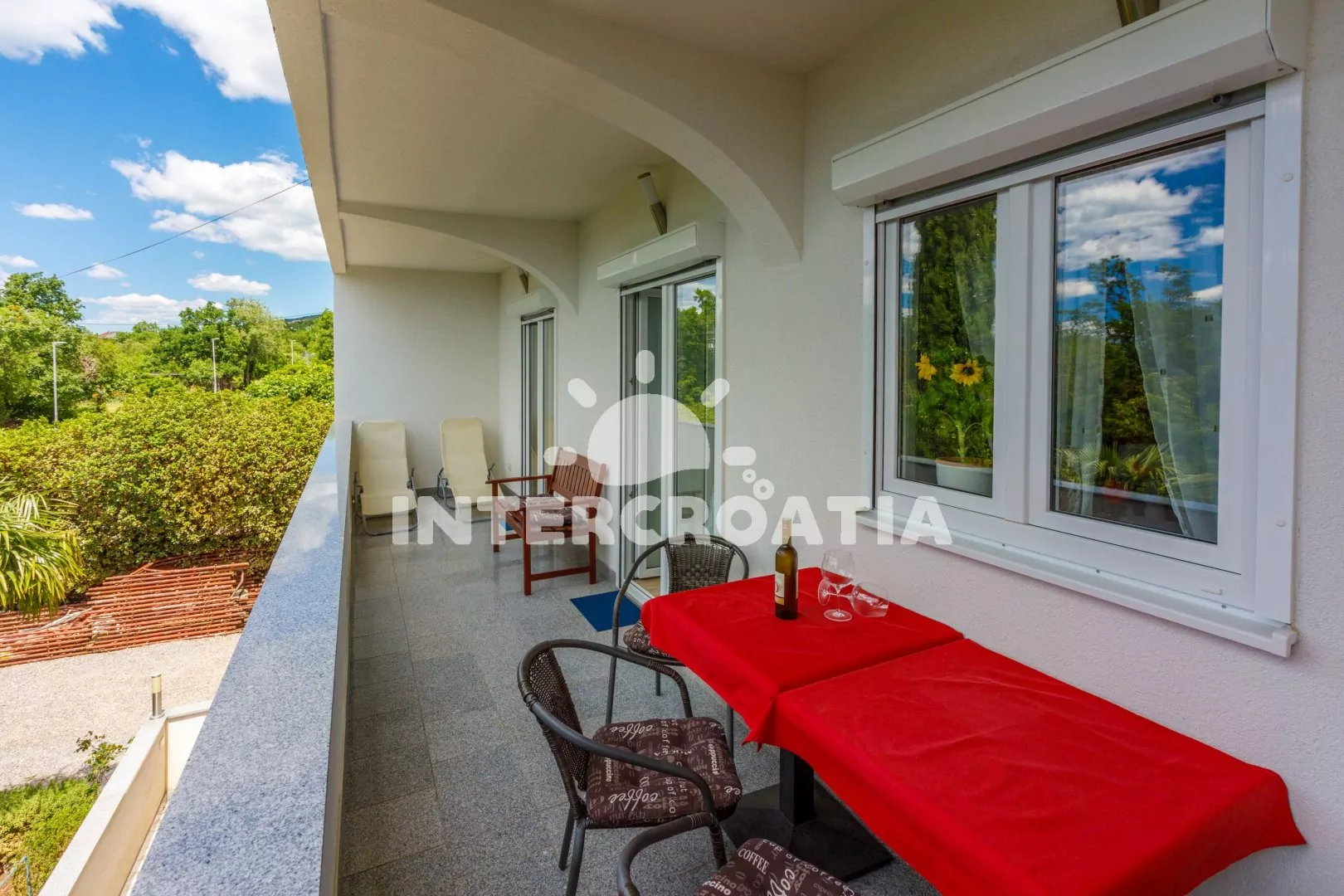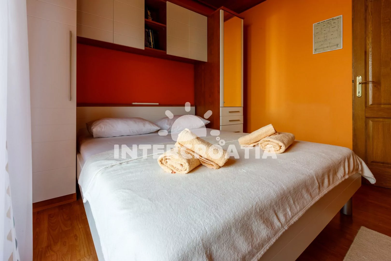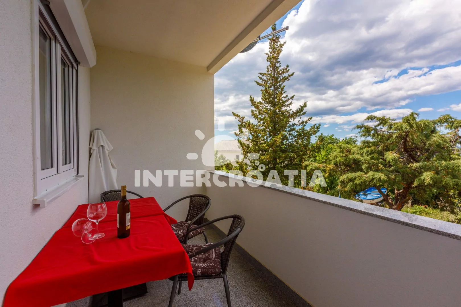 Apartmán (60 m2) s balkonem a výhledem na moře se nachází v 1. patře domu. Apartmán má 2 ložnice a je vhodný pro 4 až 5 osob. Obývací pokoj je spojený s kuchyní. Kuchyňská linka je vybavena sklokeramickou varnou deskou, digestoří, vestavěnou troubou, myčkou na nádobí, mikrovlnnou troubou, rychlovarnou konvicí, kávovarem, nádobím a lednicí s mrazákem. Obývací pokoj s jídelním stolem pro 4 osoby, pohovkou, televizí se satelitním programem, radiem, klimatizací a vstupem na balkon. První ložnice s jedním dvoulůžkem a vstupem na balkon. Druhá ložnice s dvoulůžkem, pohovkou (rozložitelná na extra lůžko pro 1 osobu) a vstupem na balkon. Koupelna s vanou, umyvadlem, pračkou, bidetem a wc. Hostům je k dispozici parkování u objektu zdarma.