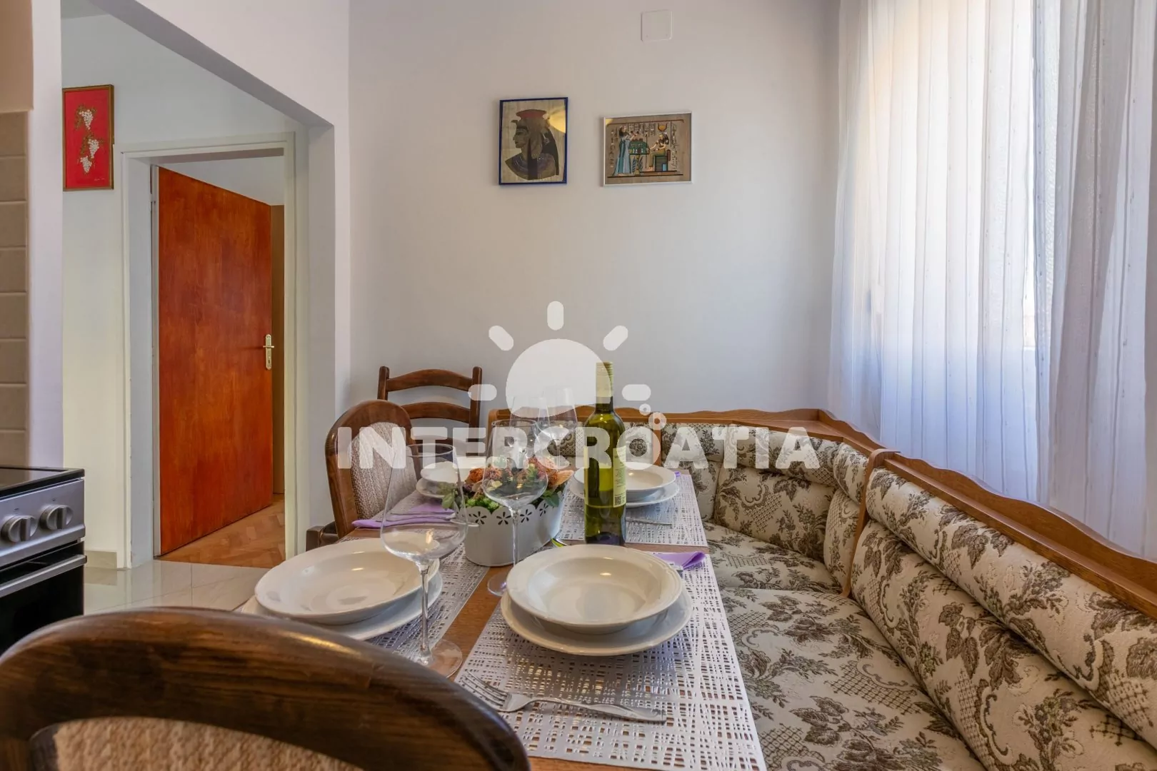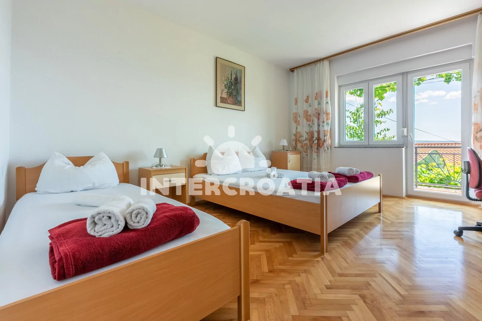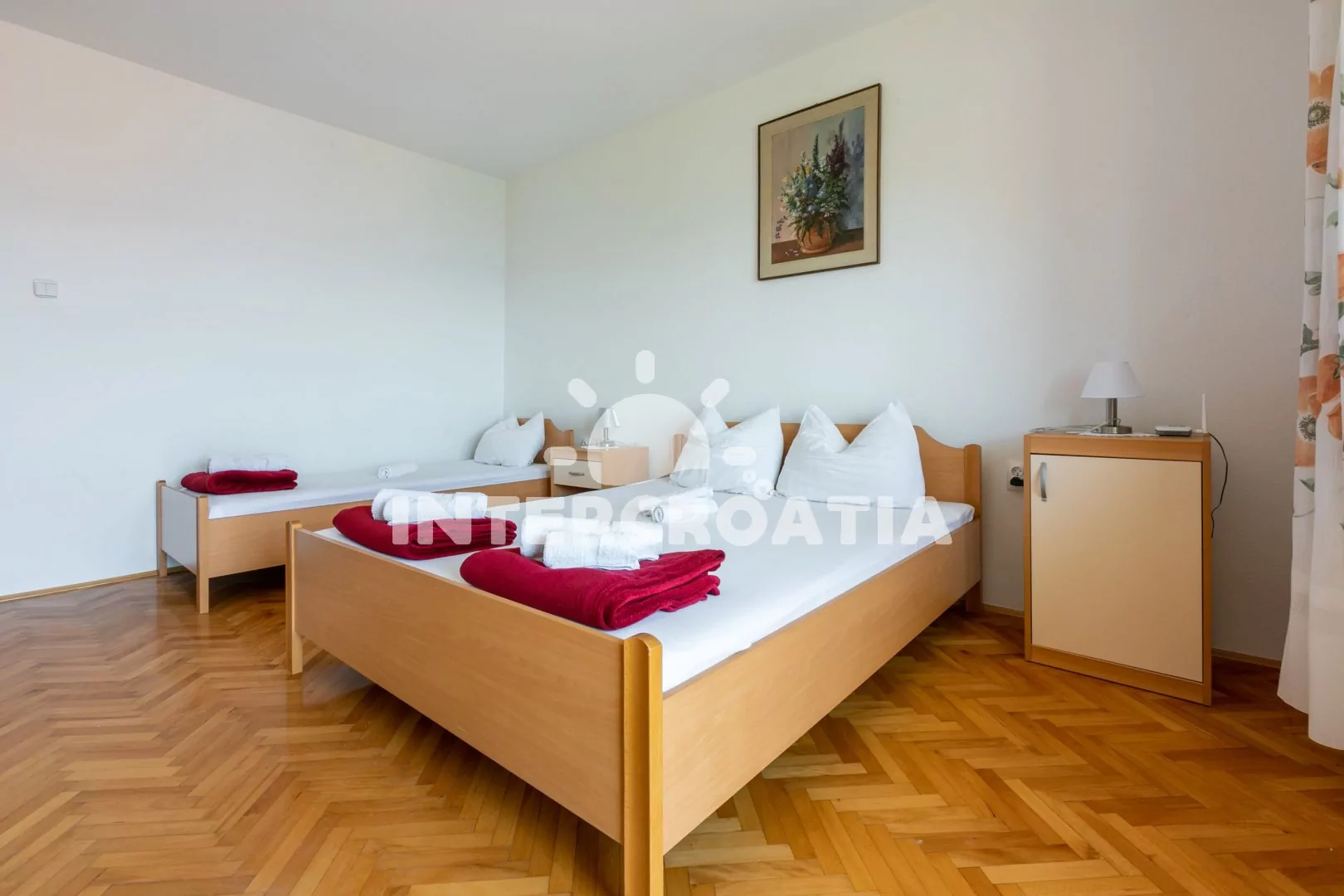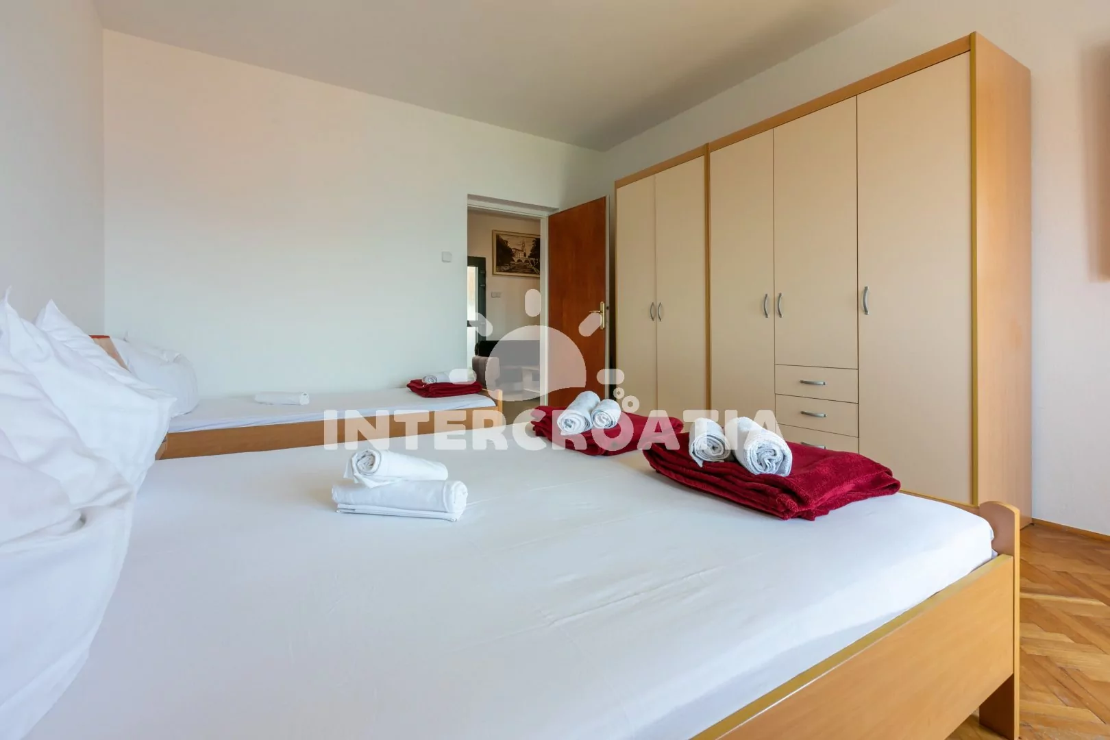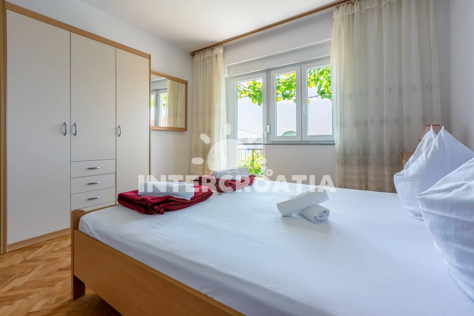 Apartmán (70 m2) s balkonem a výhledem na moře se nachází v 1. patře domu. Apartmán má 2 ložnice a je vhodný pro až 6 osob. Obývací pokoj je spojený s kuchyní. Kuchyňská linka je vybavena sporákem s troubou, myčkou na nádobí, rychlovarnou konvicí, mikrovlnnou troubou, kávovarem, nádobím a lednicí s mrazákem. Obývací pokoj s jídelním stolem, pohovkou, televizí se satelitním programem a klimatizací. První i druhá ložnice je vybavena vždy s dvoulůžkem, jednolůžkem a vstupem na balkon. Koupelna se sprchovým koutem, umyvadlem, fénem a wc. Hostům je k dispozici parkování u objektu zdarma.